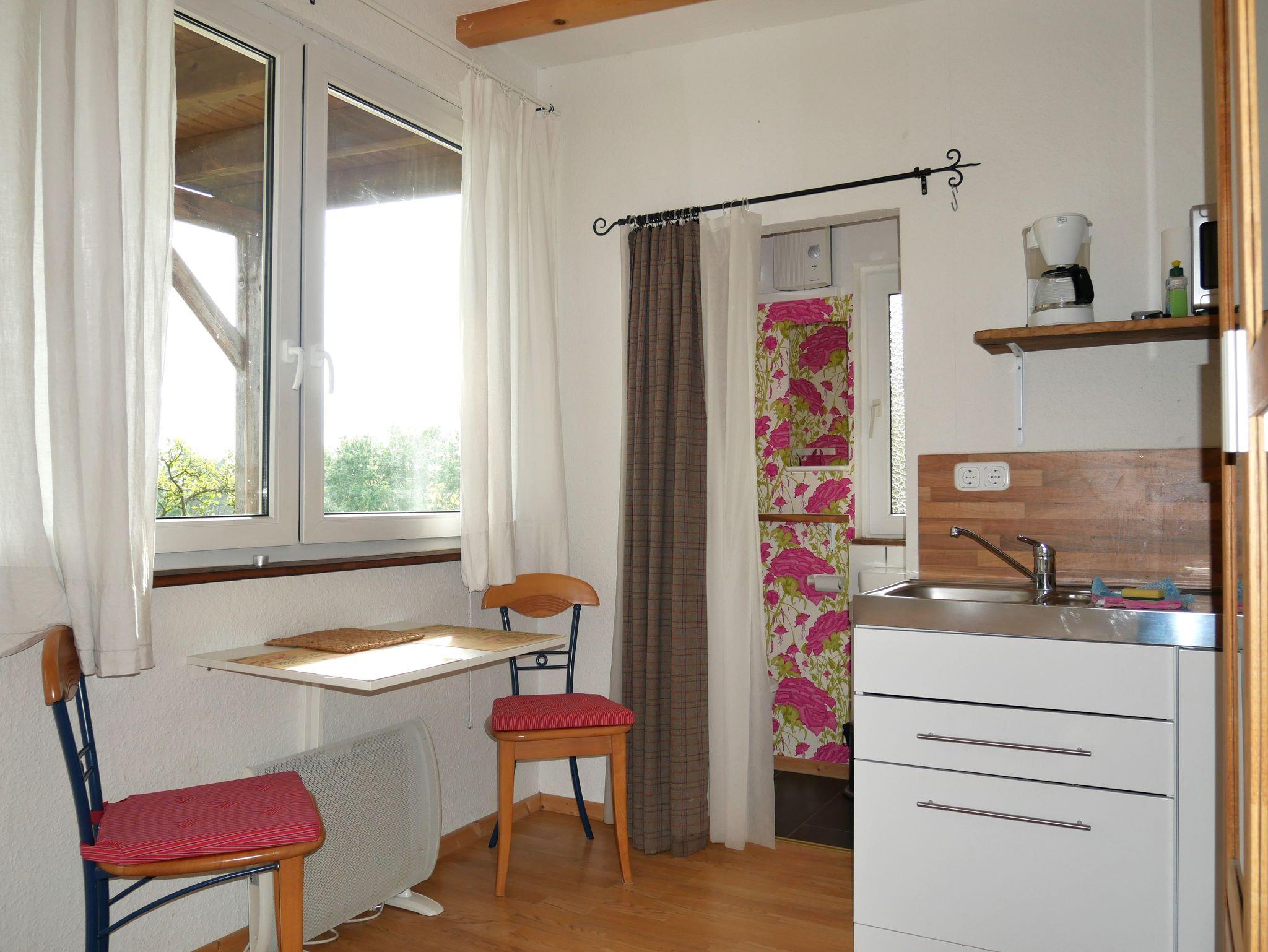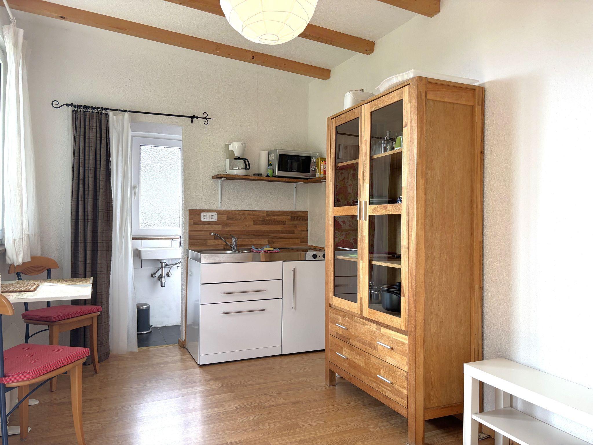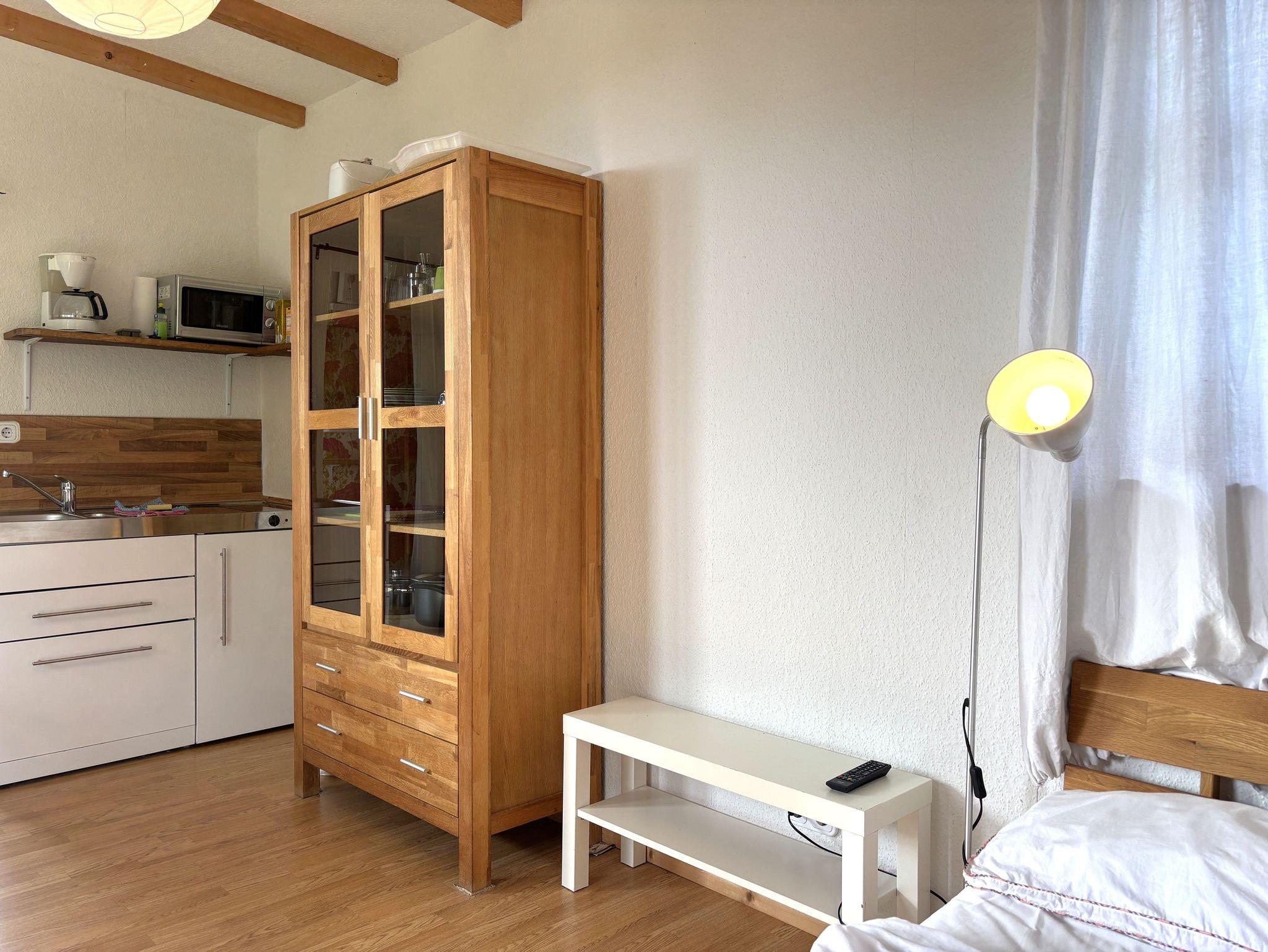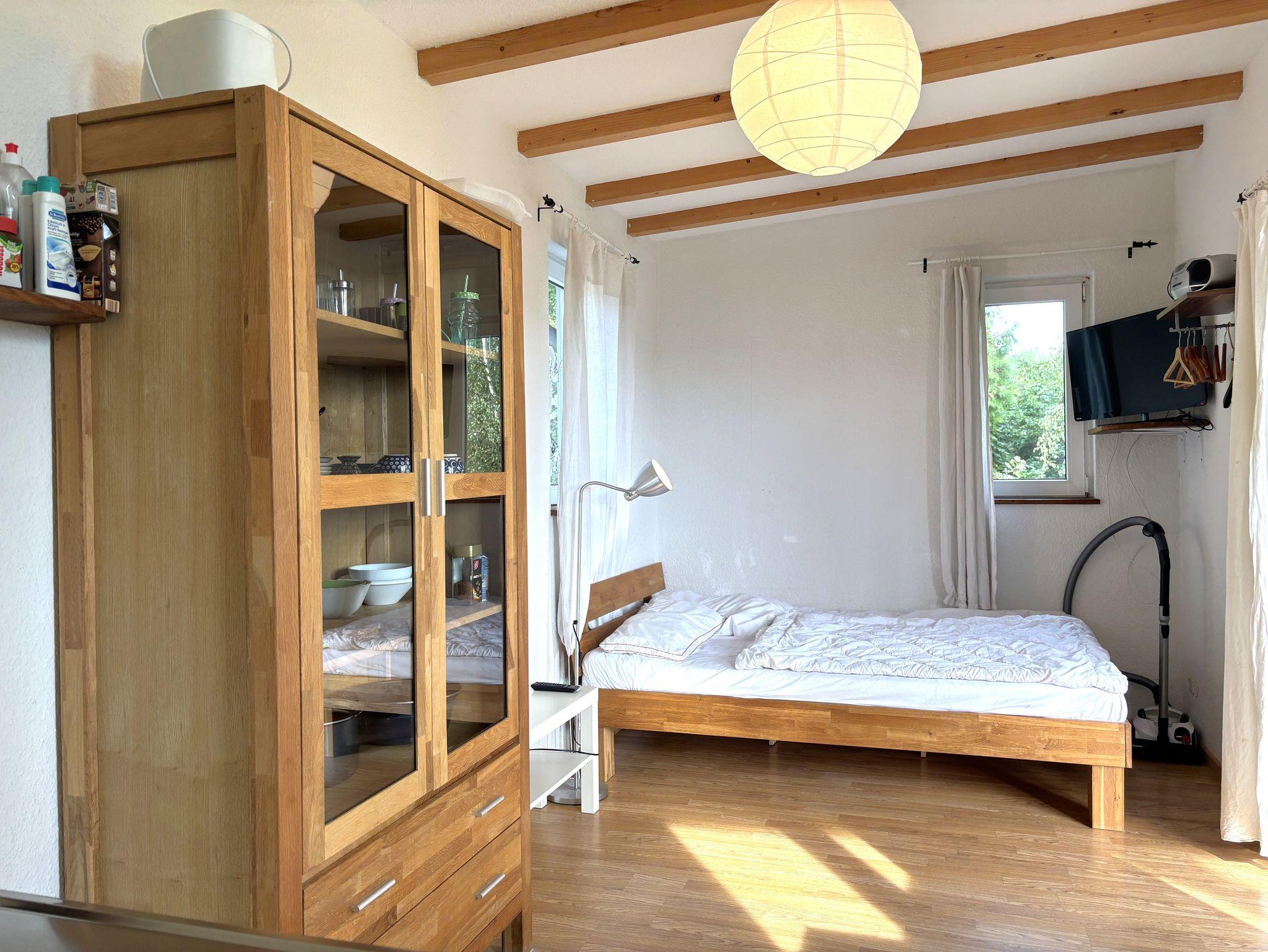 Das Holzhäuschen bietet ein Wohn-Schlafzimmer mit kleiner Küche, Essplatz sowie ein schmales Doppelbett (1,40 m x 2,00 m) für 2 Personen. Spülmaschine, Kühlschrank mit Gefrierfach, 2 Herdplatten, 1 Mikrowelle sowie Wasserkocher, Toaster und Kaffeemaschine sind vorhanden. Das kleine Bad hat Dusche und WC und ein Außenfenster. Ein Flachbild-TV mit SAT und eine kleine Heizung sind ebenfalls vorhanden.