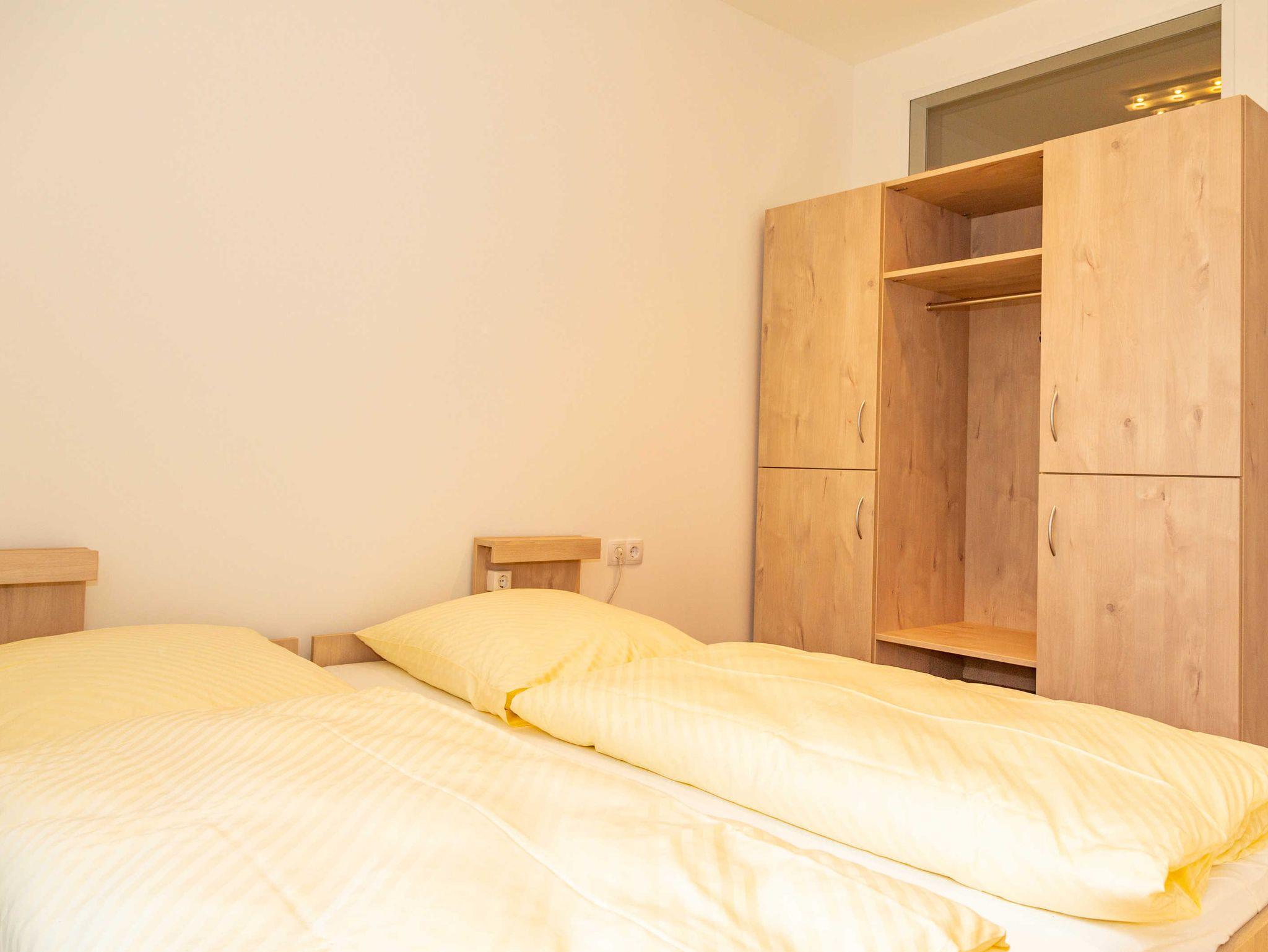 Schlafzimmer stehen ein Doppelbett und ein großer Kleiderschrank. Im