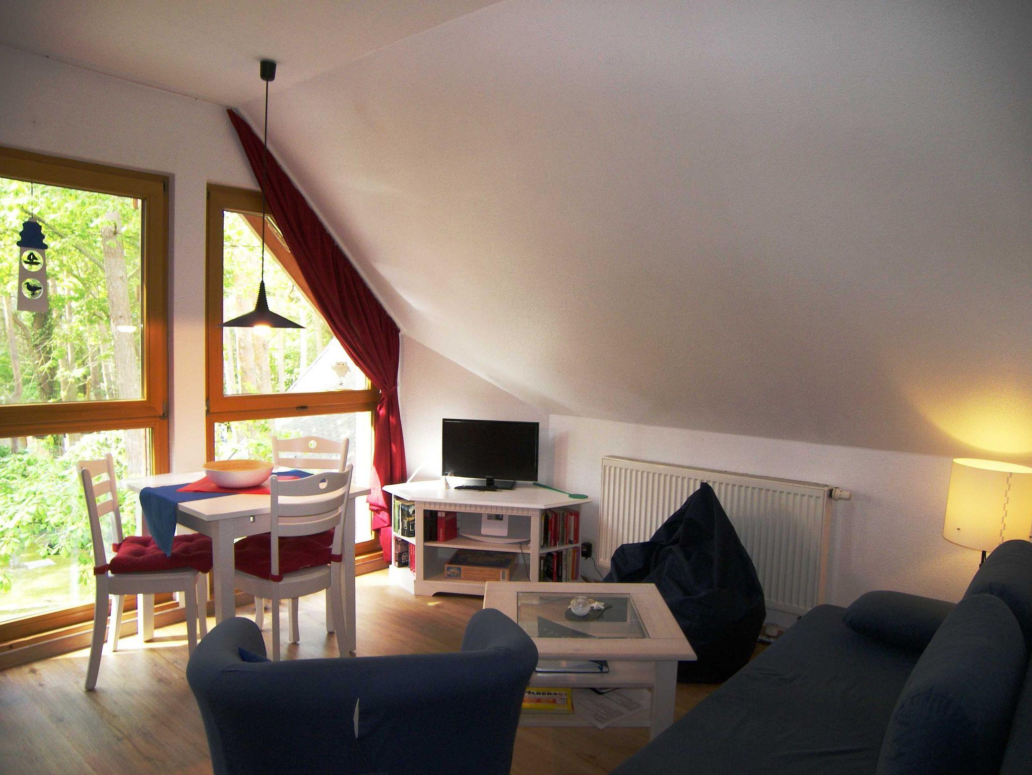 Die normale Küchenausstattung mit Tellern, Pütt und Pann, Gläsern etc. wird durch eine Mikrowelle ergänzt. Außerdem finden Sie Kaffeemaschine, Toaster, Eierkocher, elektrischen Handmixer und Mikrowellengeschirr. Die Küche verfügt weiterhin über einen Zweiplattenherd. Den möblierten Balkon mit Blick ins Grüne erreichen Sie vom Wohnzimmer aus.