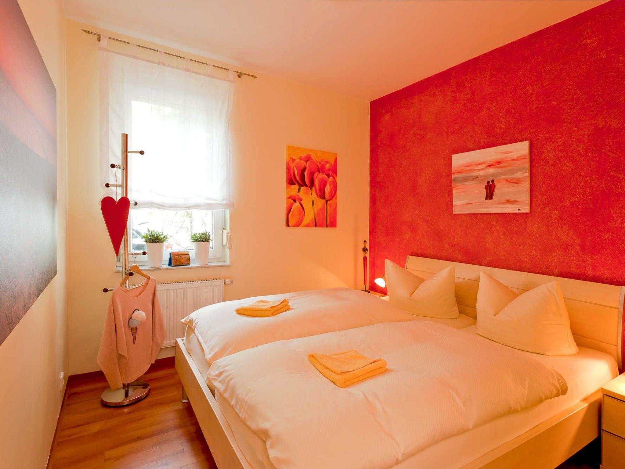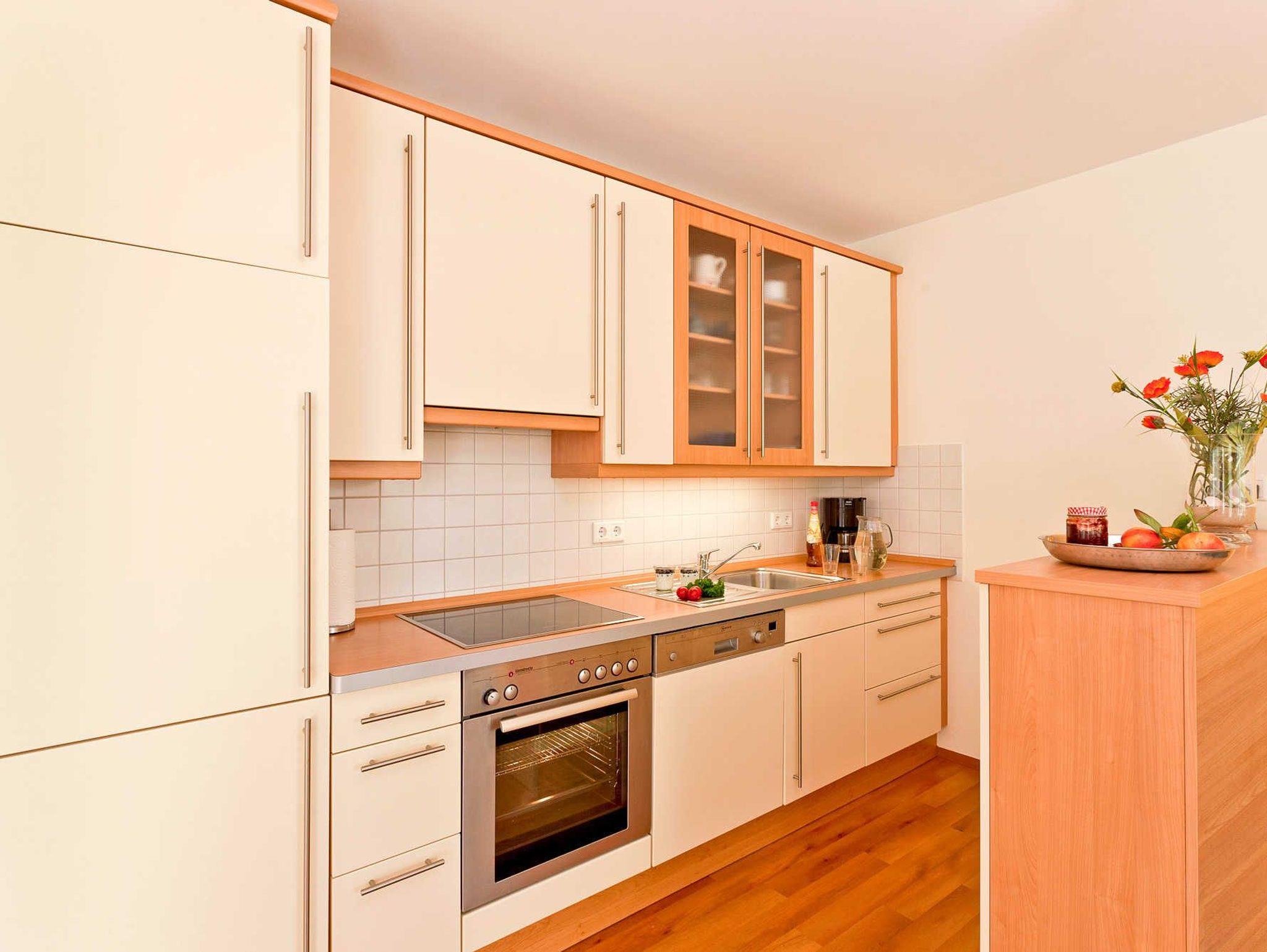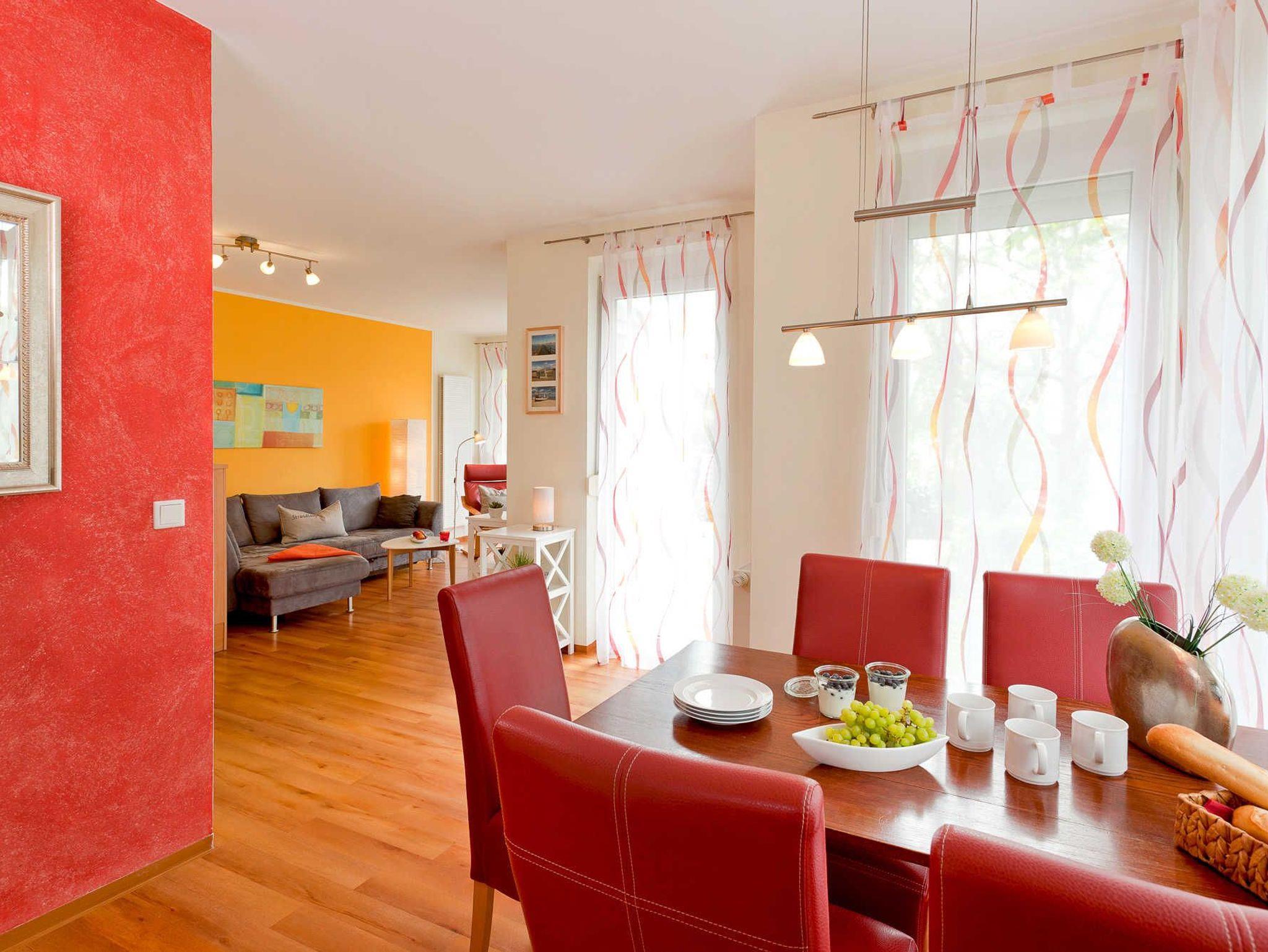 Das behagliche Wohn- und Esszimmer mit Fernseher, CD-Player und Stereoanlage lädt zum Verweilen ein. Der offene und voll ausgestattete Küchenbereich mit Herd, Geschirrspüler und Kühlschrank, bietet zudem genügend Raum um sich kulinarisch frei zu entfalten. Ein Schlafzimmer ist mit einem gemütlichen Doppelbett ausgestattet und ein weiteres mit zwei Einzelbetten. Das moderne Badezimmer besitzt Dusche und WC. Durch eine geschützte Holzterrasse kann man das schöne Wetter auch direkt an der Wohnung ausnutzen. An allen Fenstern sind Außenjalousien angebracht. Ihnen wird natürlich ein eigener PKW-Parkplatz zur Verfügung gestellt. Waschmaschine und Trockner können Sie gegen Entgelt verwenden.