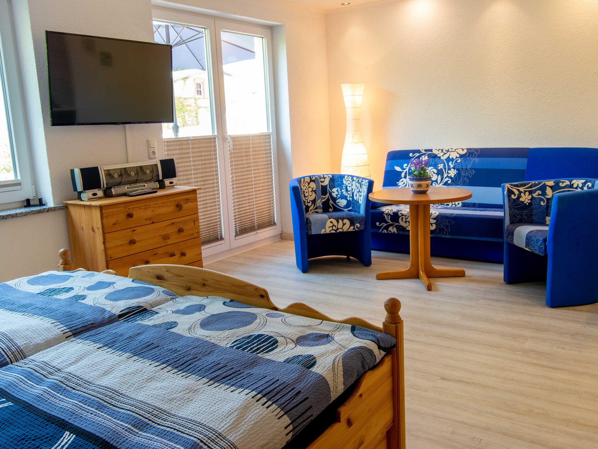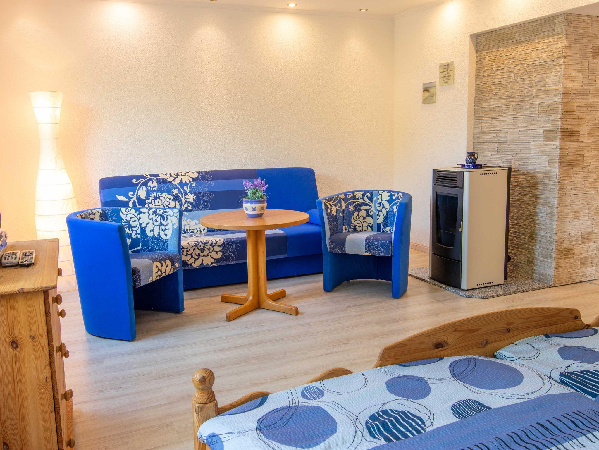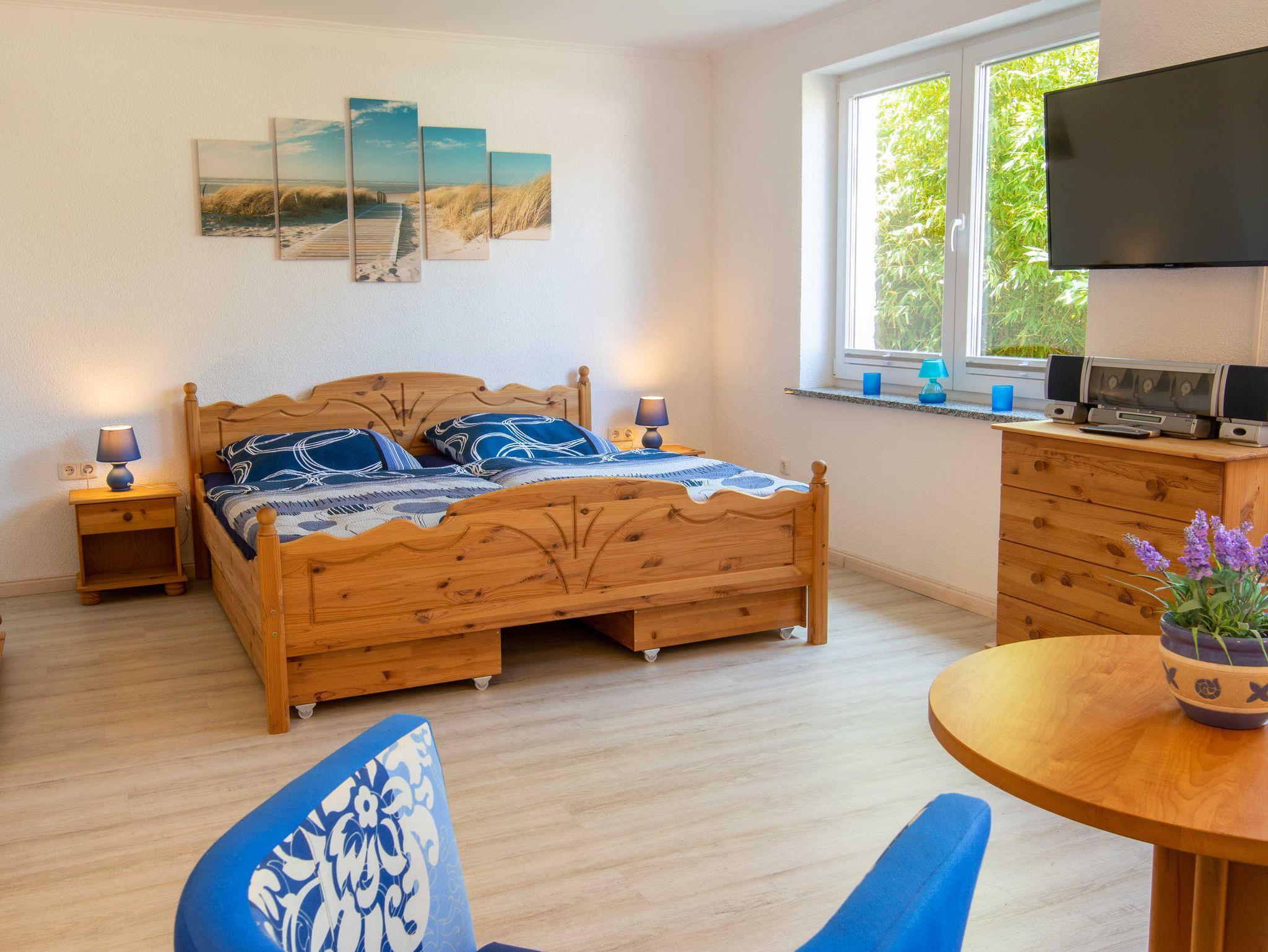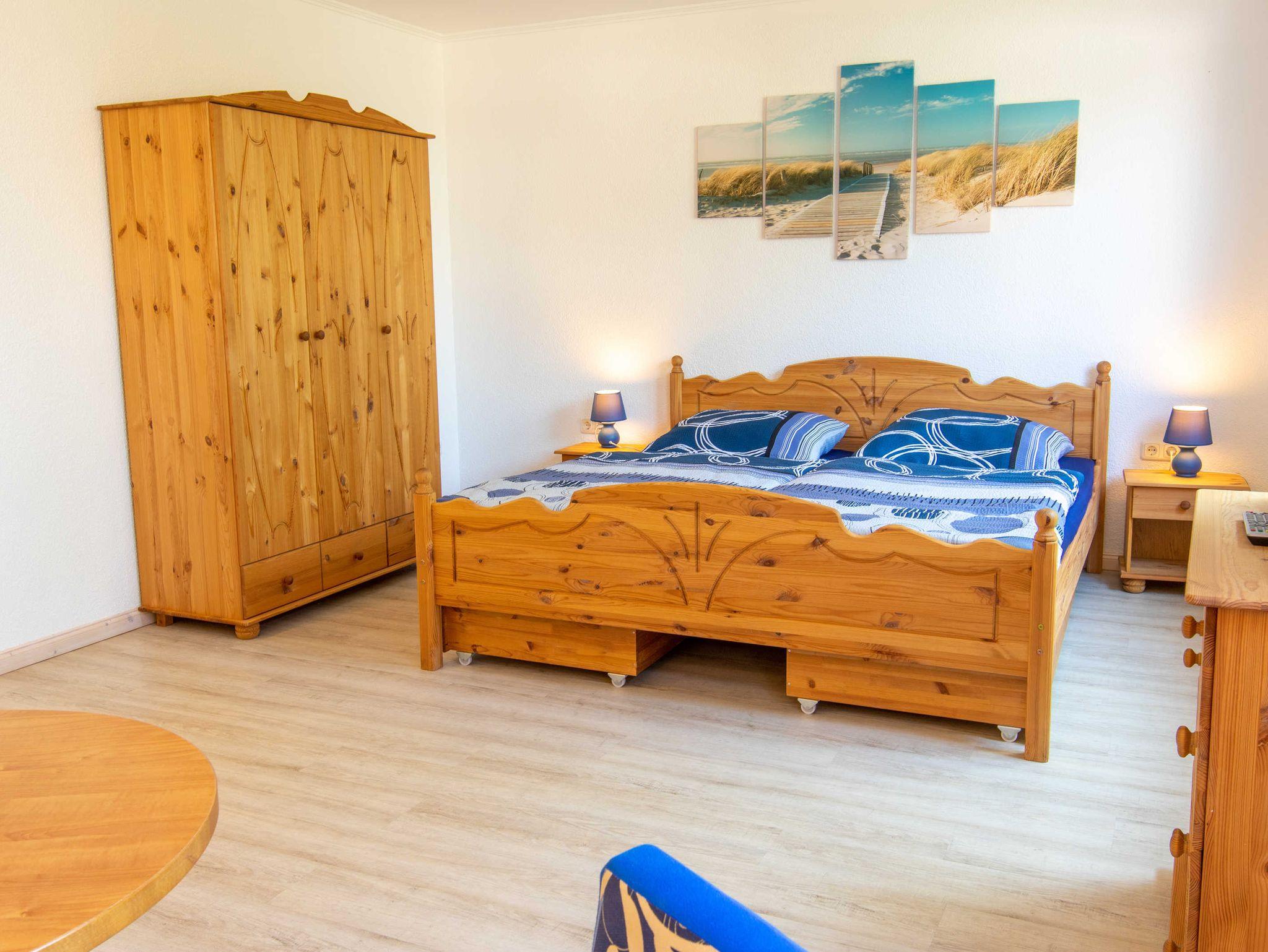 Die Ferienwohnung Dünenkieker befindet sich im Erdgeschoss unseres Ferienhauses. Die Wohnung verfügt über ein kombiniertes Wohn- und Schlafzimmer, eine Küche, ein Duschbad und eine Terrasse mit Gartenblick. Blickfang des kombinierten Wohn- und Schlafbereichs ist der Kamin (Pelletofen) im dekorativen Design vor dem mit Dekosteinen verkleideten Schornstein. Naturholzmöbel aus massiver Kiefer mit dekorativen Fräsungen bestehend aus einem 180 cm breitem Doppelbett mit 2 Nachtschränkchen, einem 3 türigen Kleiderschrank, einer Kommode sowie ein 3 Sitzer mit 2 Clubsesseln runden das Bild ab. Ein Flachbildschirm-TV und ein 3 fach CD-Wechsler mit Radio komplettieren das Ganze.