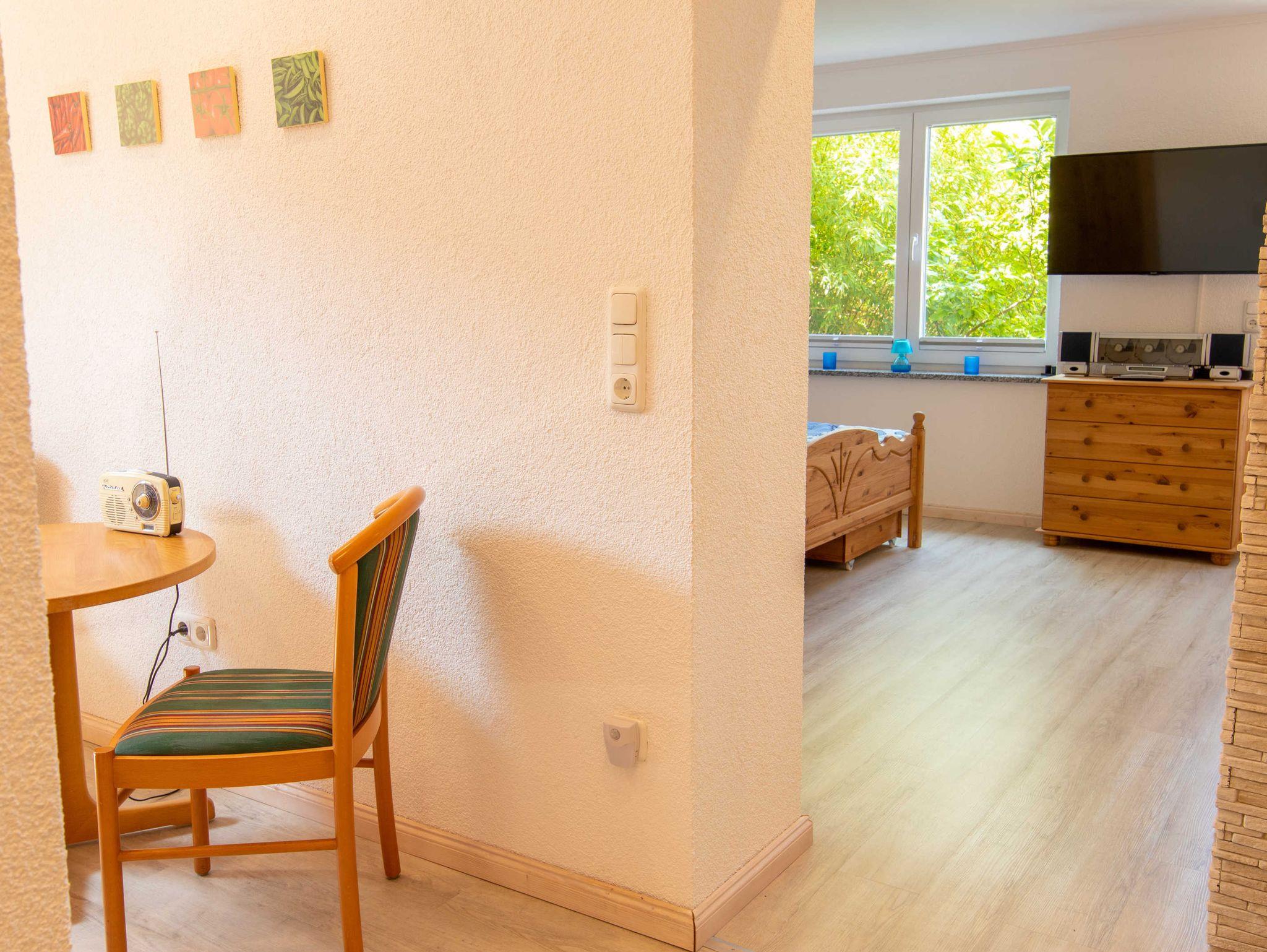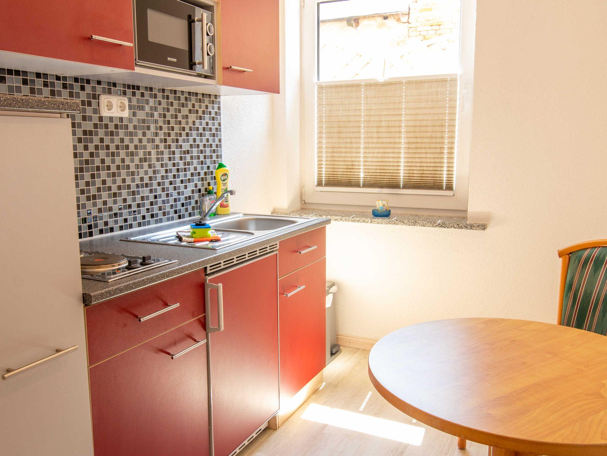 Die komplett mit Töpfen, Pfannen, Geschirr, Besteck, Gläsern und Küchenuntensilien ausgestattete Einbauküche schließt sich dem Wohn- und Schlafbereich an. Sie ist zudem mit einer Kaffeemaschine, einem Toaster, einem Wasserkocher, einem Eierkocher, einer Mikrowelle und einem Essplatz ausgestattet. Das ebenerdige, hochwertige Duschbad mit passendem Waschtisch und Fenster ist, wie der Rest der Wohnung, behindertenfreundlich. Außer im Nassbereich ist die komplette Ferienwohnung mit hochwertigem Vinylfußboden ausgelegt.