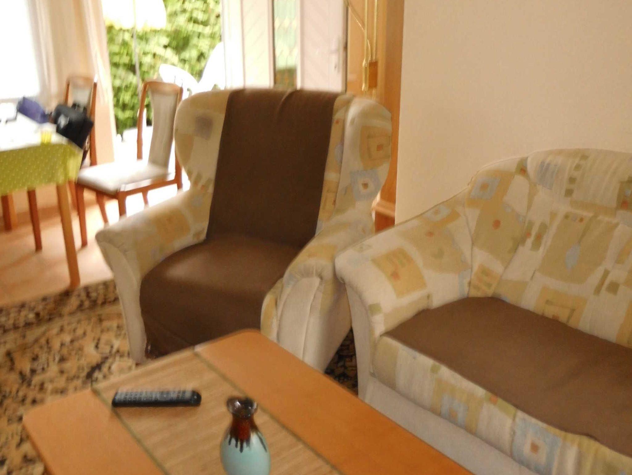 1 Wohnraum mit ausziehbarer Couch, Küchenzeile und einer Essecke