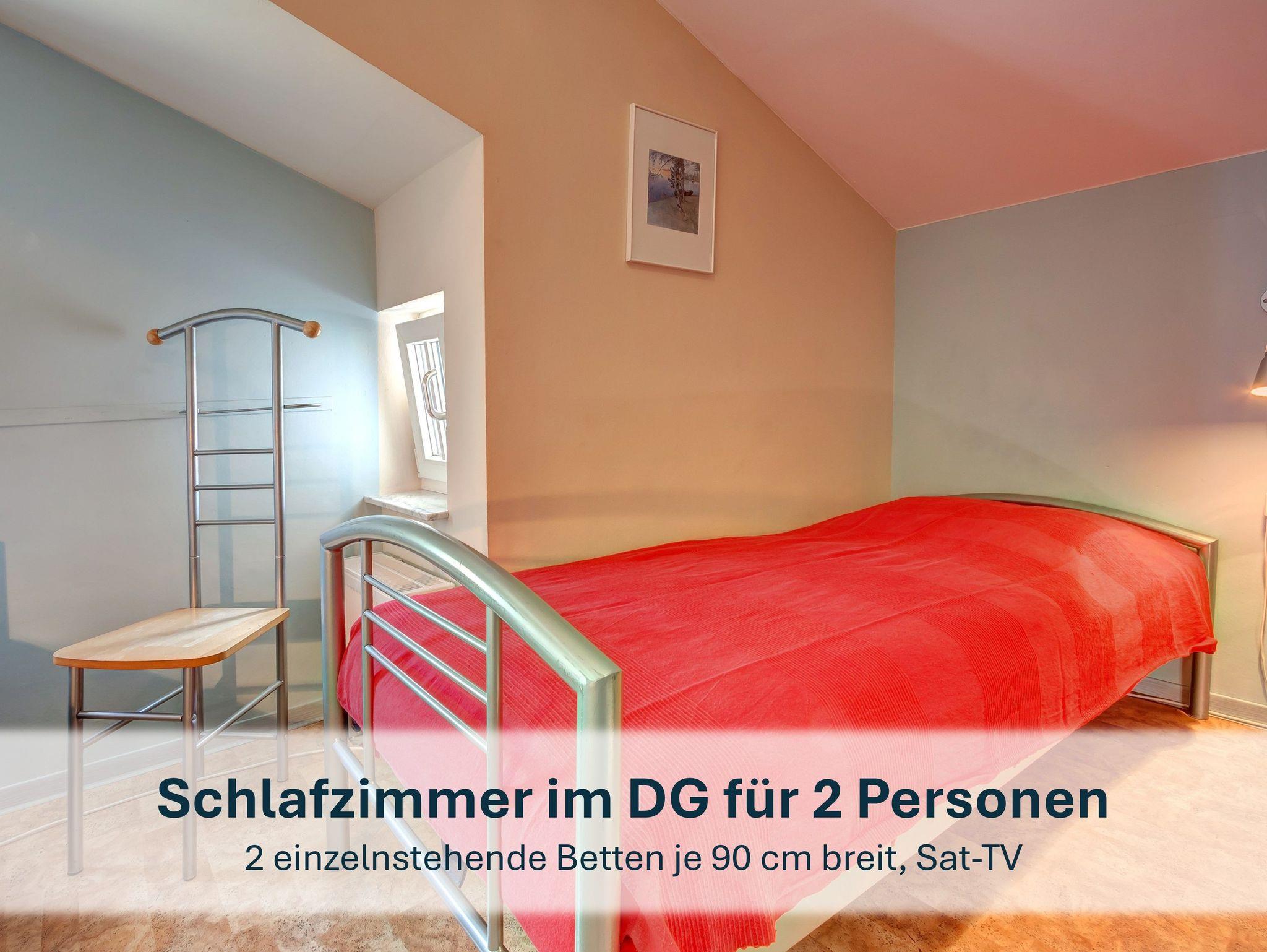 Das Dachgeschoß besteht aus einem Schlafzimmer mit zwei Einzelbetten, einem Badezimmer mit Wanne und WC und Ihrer privaten Sauna. Letztere ist im Preis inklusive, ebenso wie der Kamin und das WLAN.