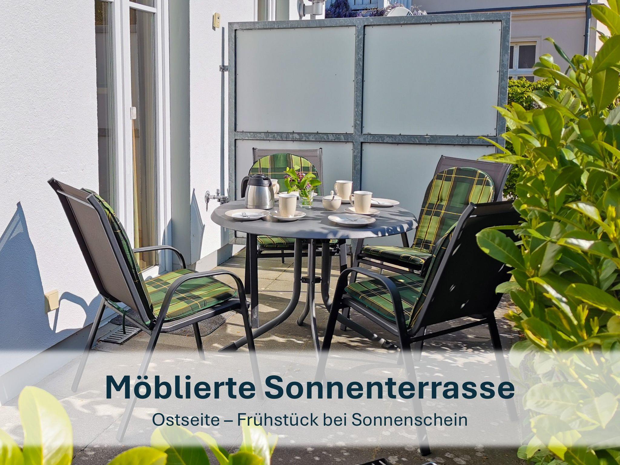 Die 5-Raum-Wohnung ist aufgeteilt in Küche, Wohnzimmer und Gäste-WC im Erdgeschoß, sowie eine möblierte Sonnenterrasse. Über die Treppe kommen Sie in das erste Obergeschoß mit zwei Schlafzimmern und einem Badezimmer mit Dusche, WC und Waschmaschine.