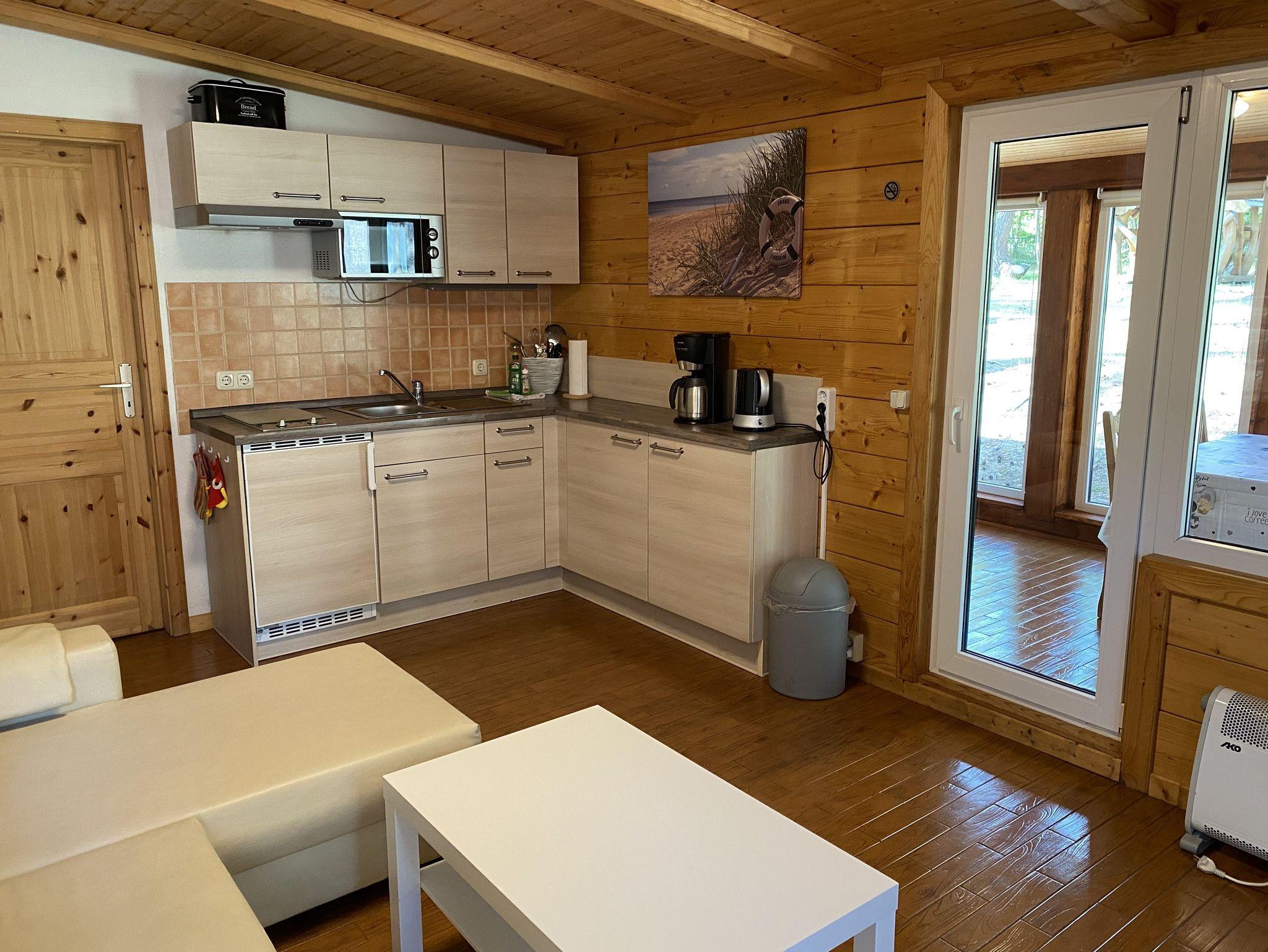 Das 50 qm große Ferienhaus ist modern eingerichtet. Es ist alles vorhanden, um Ihren individuellen Urlaub zu genießen. Das Haus verfügt über eine Wohnküche- mit Eckcouch, eine moderne Küchenzeile mit Mikrowelle, 2 Platten Kochfeld, Kühlschrank Wasserkocher, Toaster und Kaffeemaschine. Im Elternschlafzimmer befindet sich ein Doppelbett (1,60 x 2,00m) und im Kinderschlafzimmer ein Doppelstockbett (0,9 x 2 m). Das Badzimmer ist mit Dusche und WC ausgestattet. Zum Haus gehören ein Wintergarten und eine überdachte Terrasse. Von der Ferienwohnung Waldblick haben Sie Blick in den Wald.