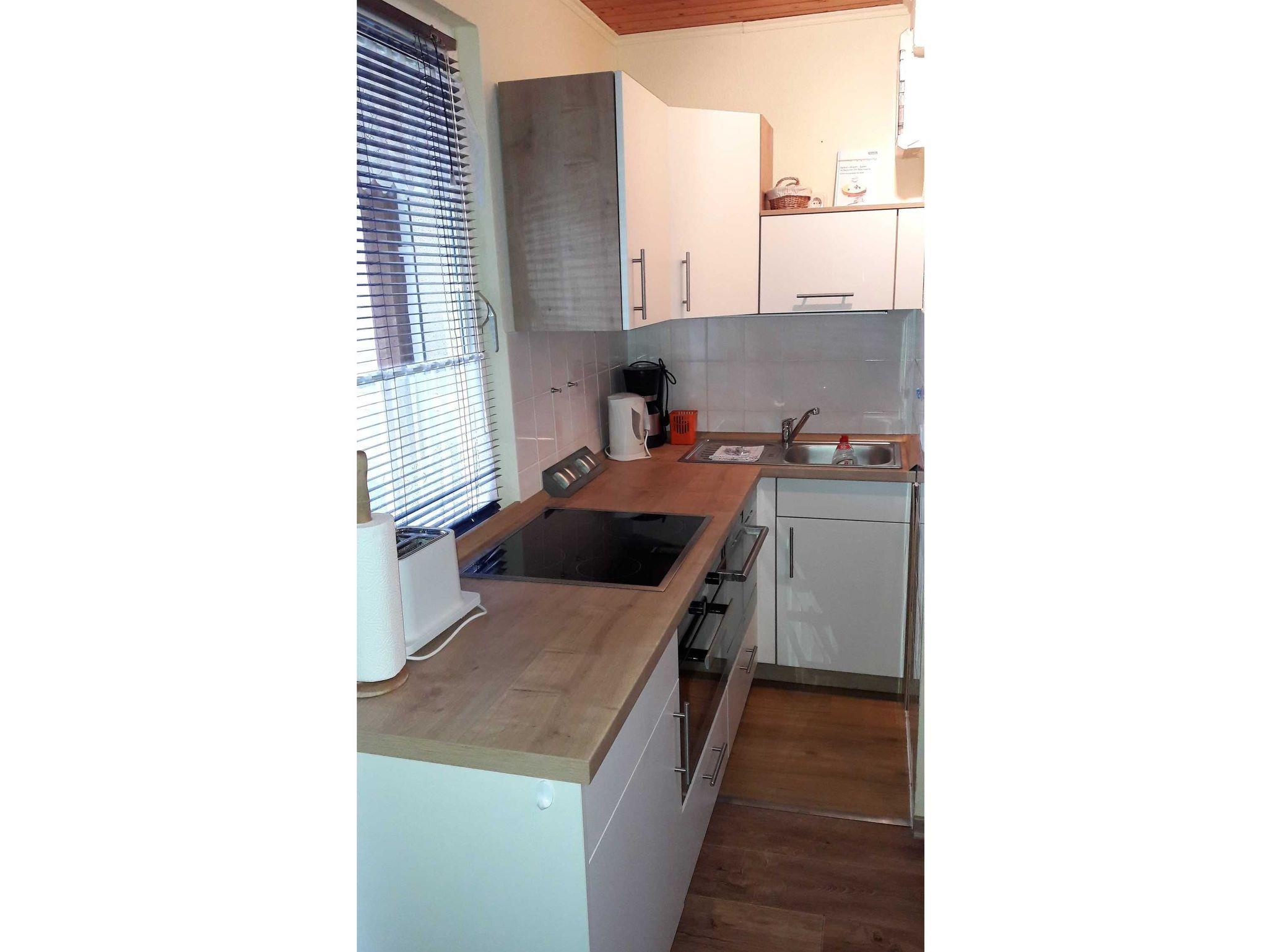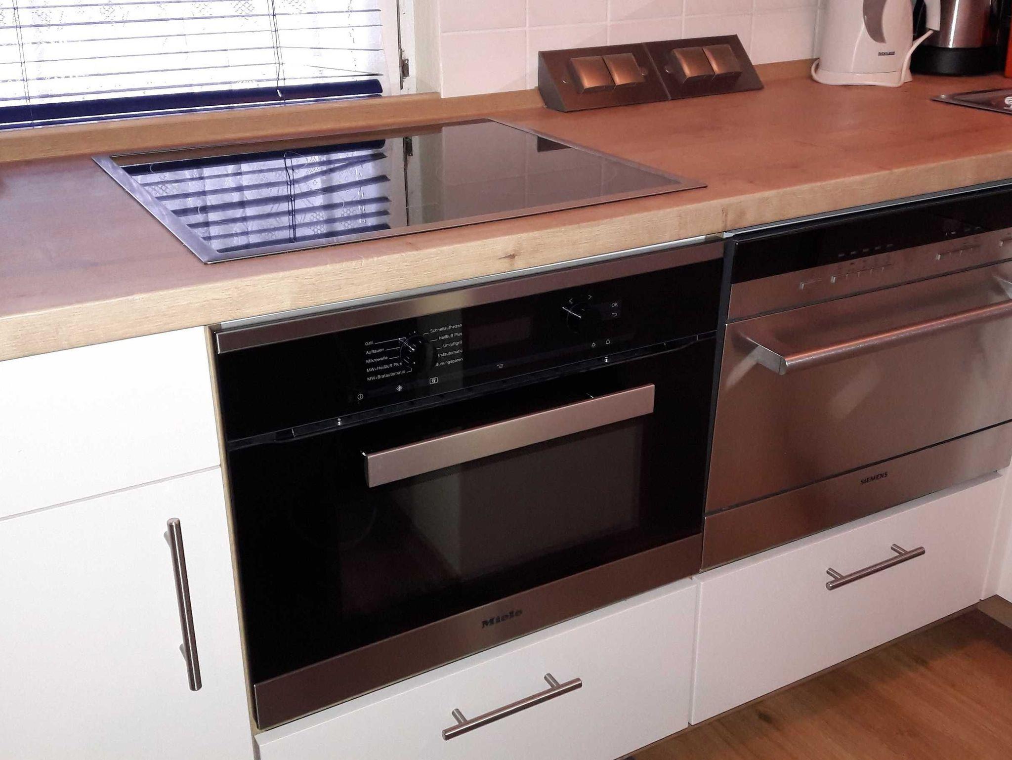 gut ausgestattete Einbauküche mit Herd, Gläser, Geschirr, Besteck, Kaffeemaschine, Toaster, Wasserkocher, Geschirrspüler, Mikrowelle, Kühlschrank, Flachbild-TV, Blu-Ray Player, Radio, Staubsauger