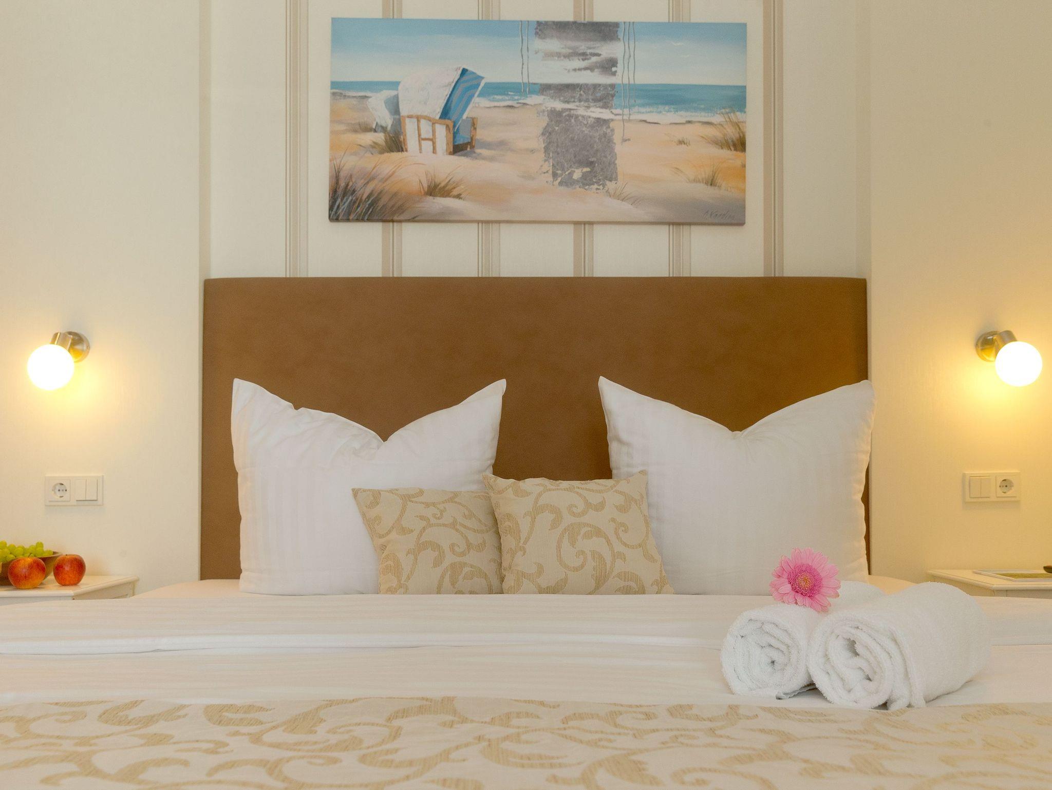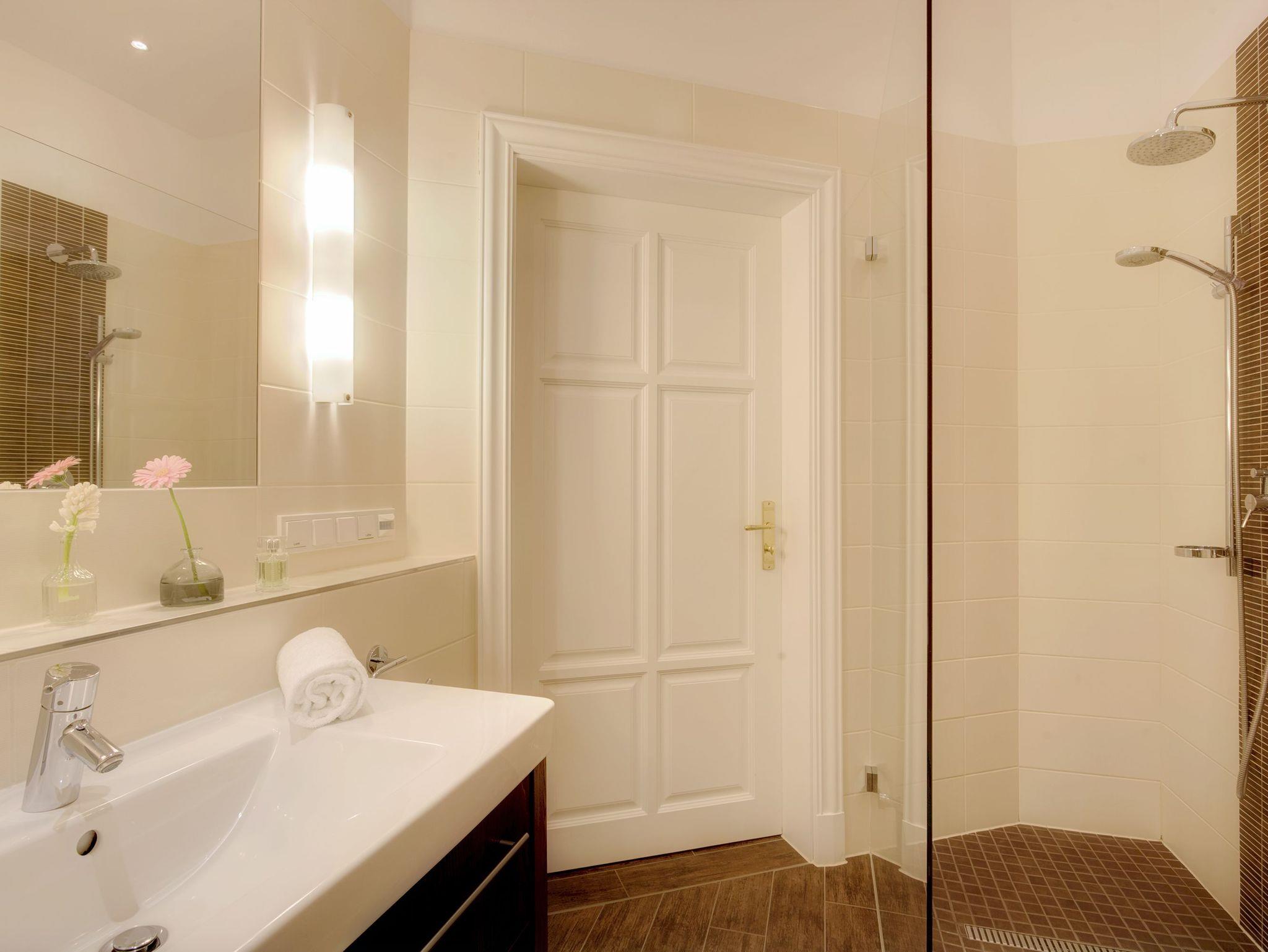 Damit Sie Ihre wohlverdiente Urlaubszeit bereits am Anreisetag in vollen Zügen genießen können haben wir das Bett für Sie und das für Ihre lieben Mitreisenden bereits bezogen und ein Duschtuch sowie ein kleines Handtuch bereitgelegt. Das großzügige Badezimmer ist mit einer ebenerdigen XXL Echtglasdusche, WC und einem Haarfön ausgestattet.