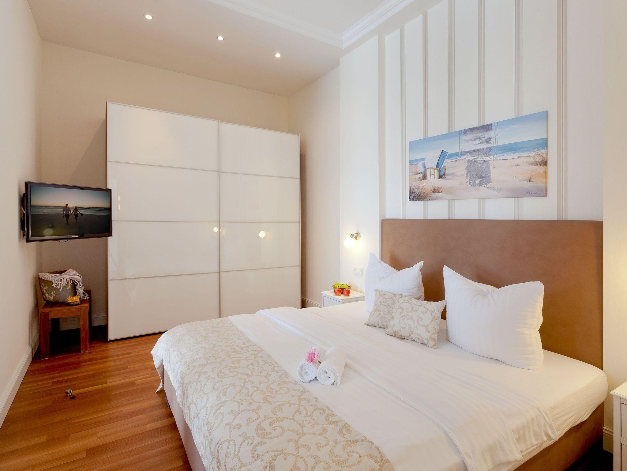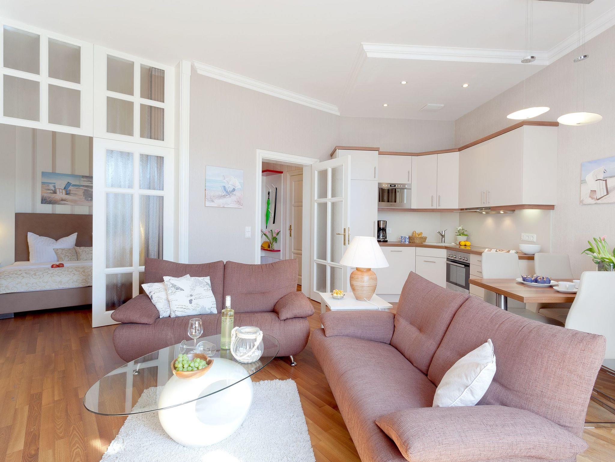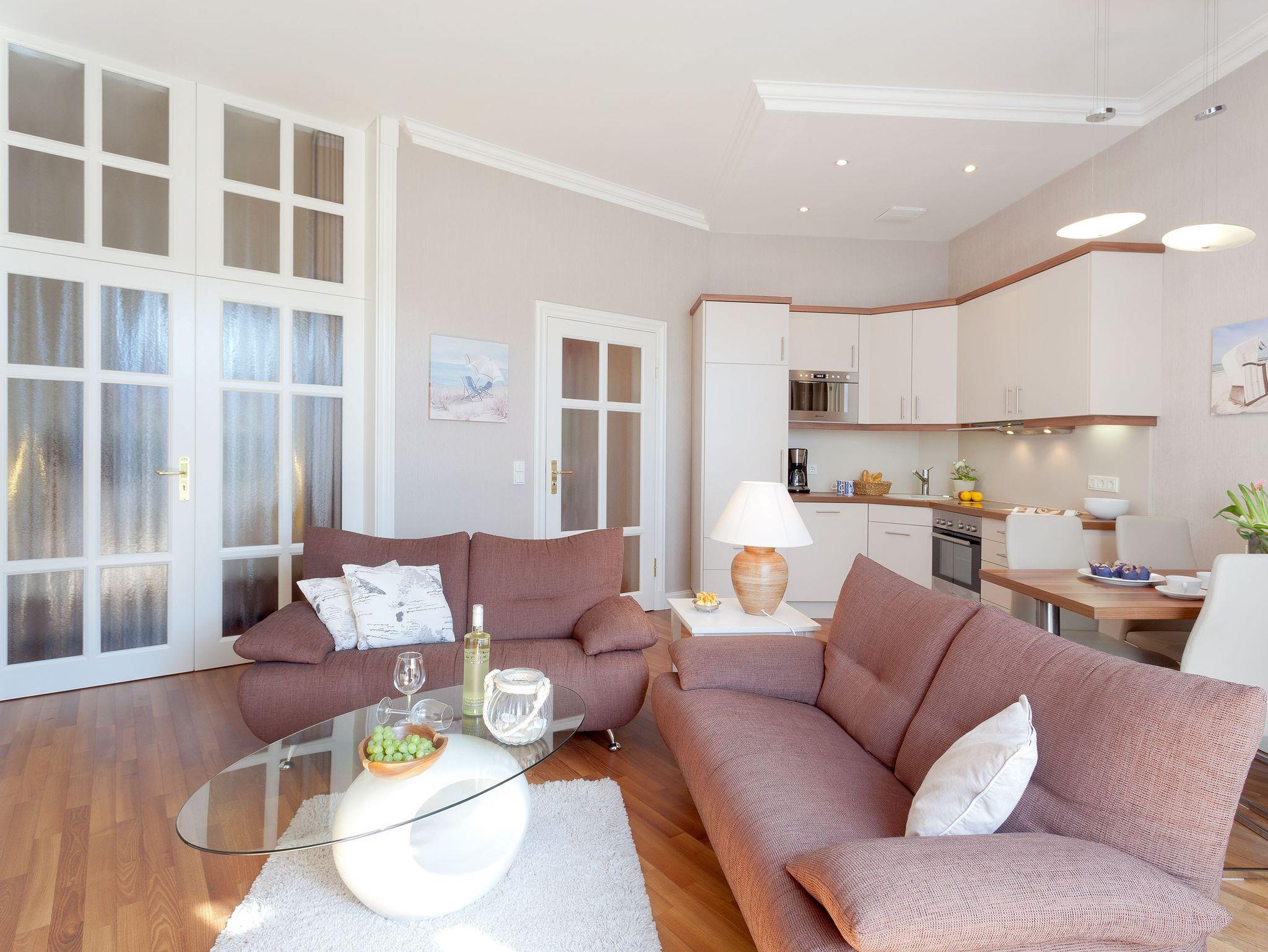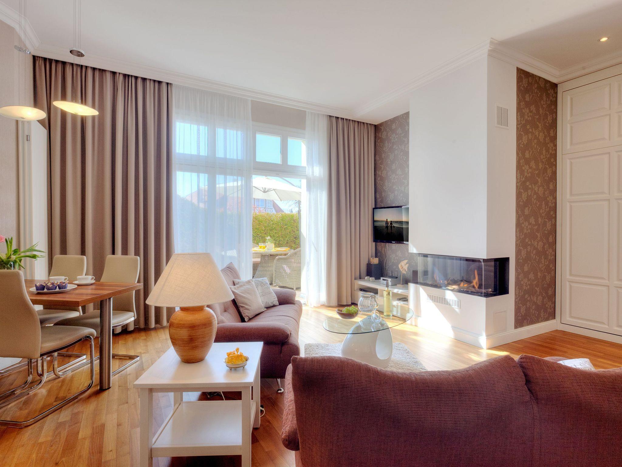 Das geschmackvolle 2 Raum-Appartement im Erdgeschoss mit einer Größe von 58 Quadratmetern ist das perfekte Urlaubsdomizil für Paare als auch wegen seiner 4 vollwertigen Betten für zwei Paare und Familien. Der moderne Wohnbereich mit Gaskamin, Flat-TV und komfortabler Küchenzeile (Geschirrspüler, Kühlschrank mit Gefrierfach, Backofen, Mikrowelle, Wasserkocher, Toaster, Kaffeemaschine) lädt zum Verweilen ein.