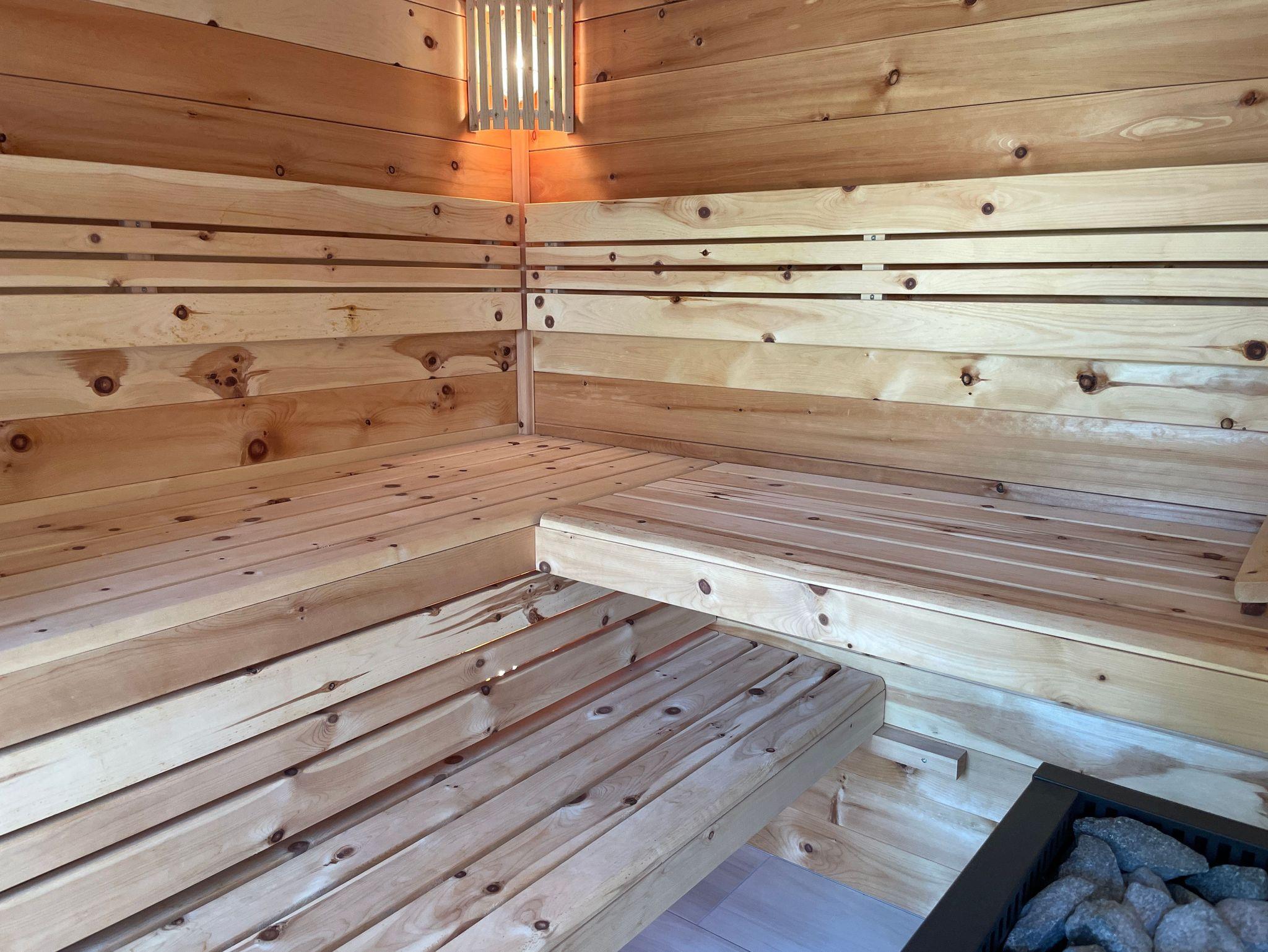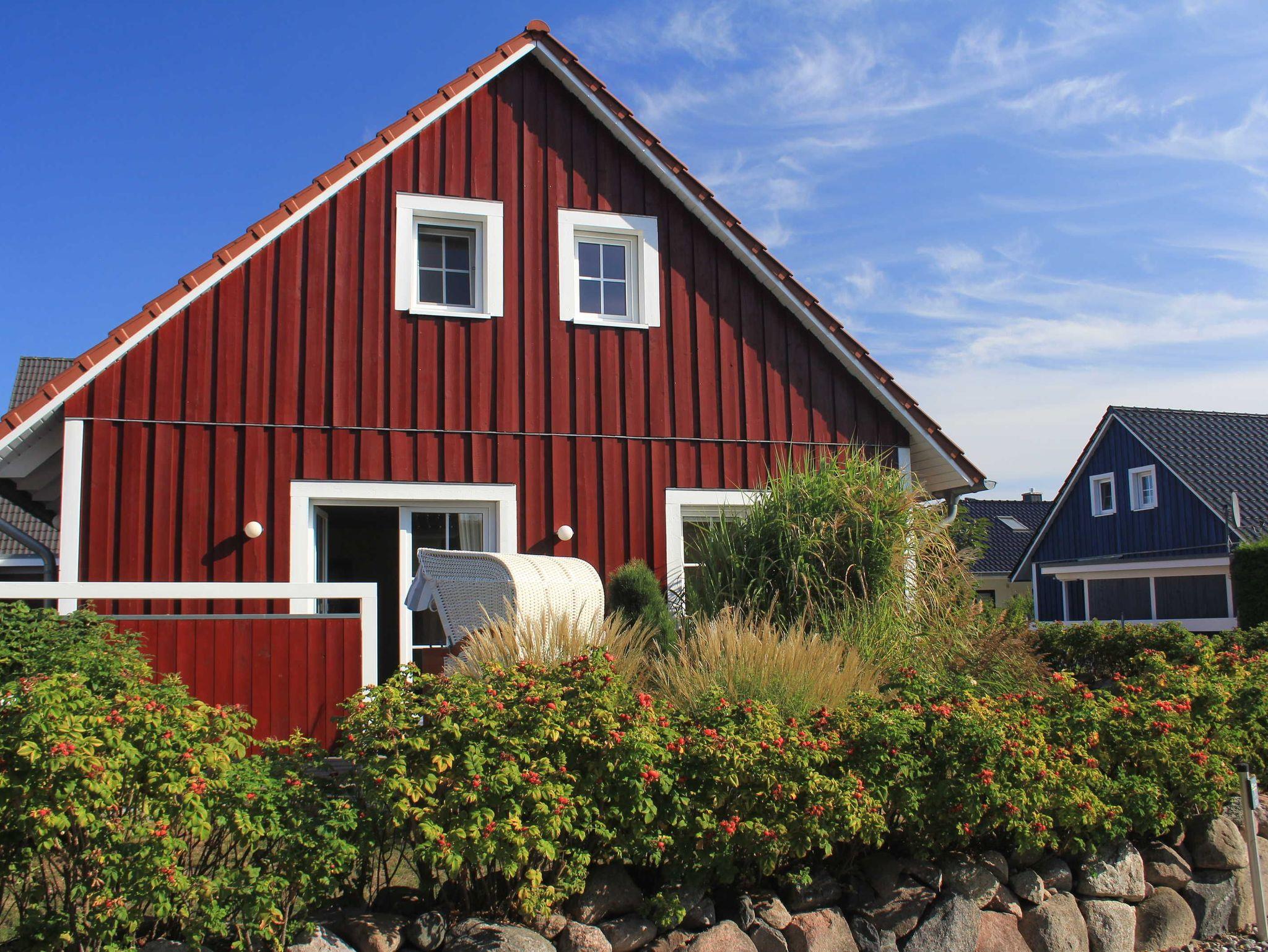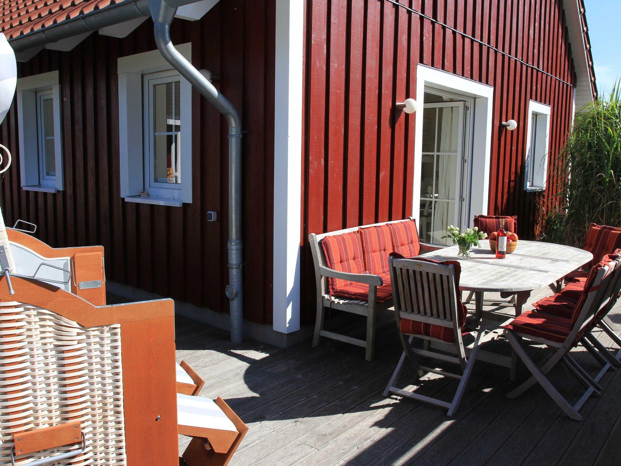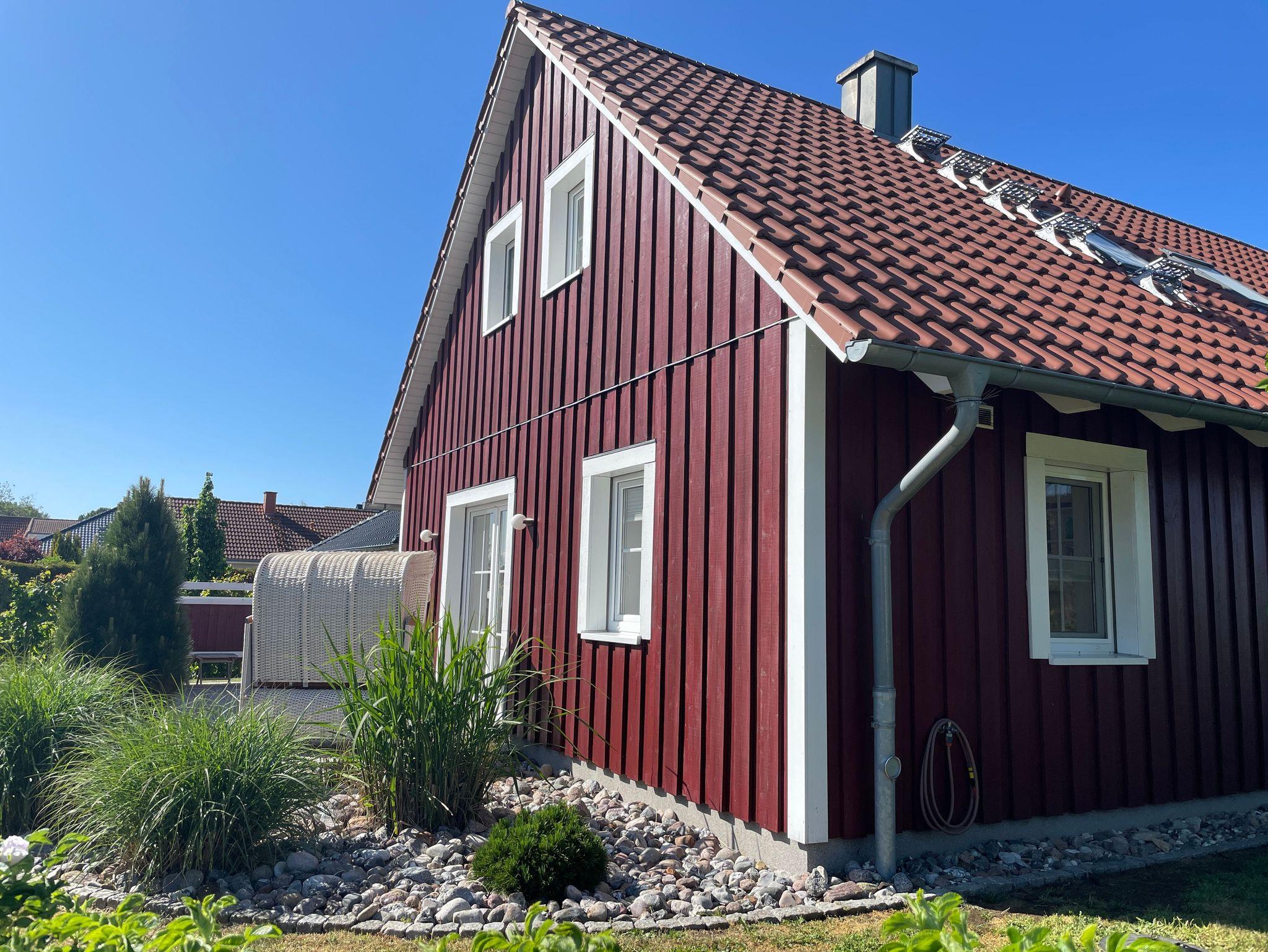Ferienhaus Nordic Red in Zinnowitz: Art des Hauses: Nordisch/ Skandinavischer Stil ? Holzverkleidung, sehr gutes Wohnklima (alle verwendeten Materialen sind atmungsaktiv) Ausstattung: 2 Bäder (Bad-EG: Badewanne + Dusche, WC, Bad-DG: Dusche, WC) 3 Schlafzimmer: 2 Doppelbetten, 2 Einzelbetten, 1 richtiges Kinderbett mit Wickelkomode und Babywanne, 1 großzügiger Wohn- und Essraum mit Ausgang zur Terrasse, Kaminofen mit Holz, Essplatz mit großen Esstisch und Stühlen + Kinderhochstuhl, Einbauküche: E-Herd, Cerankochfeld, Geschirrspüler, Kühl- und Gefrierschrank, Mikrowelle, Geschirr / Besteck, Kleinküchengeräte, Kaffeekapselautomat, W-LAN, Fernseher, DVD, Sattelitenanschluss, Radio mit CD-Spieler, Stereoanlage und Dolby-Surround, Lektüre, Waschmachine, Süd-Terrasse mit Teakmöbeln, Edelstahl-Grill, 1 x Stellplatz für PKW + 1 x Stellplatz für PKW unter einem Carport, Zentralheizung, Garten mit Bäumen und Büschen, Zirbenholz Sauna und Aussendusche im Garten,Nichtraucherdomizil!