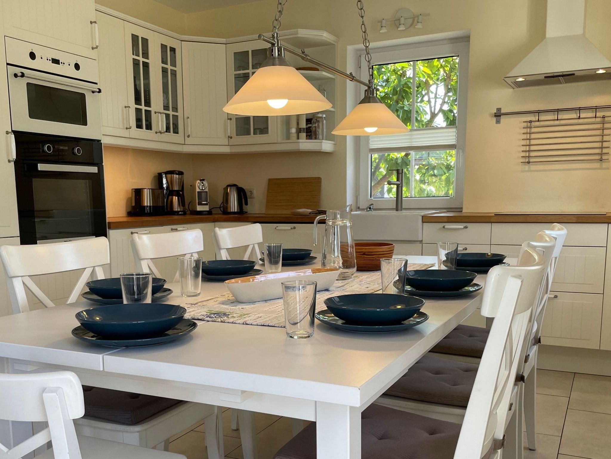 Art des Hauses: Nordisch/ Skandinavischer Stil ? Holzverkleidung, sehr gutes Wohnklima (alle verwendeten Materialen sind atmungsaktiv) Ausstattung: 2 Bäder (Bad-Erdgeschoss: Badewanne + Dusche, WC; Bad-Dachgeschoss: Dusche, WC), 3 Schlafzimmer vorhanden: 2 Schlafzimmer mit Doppelbetten (1xEG, 2xOG), 1 Schlafzimmer mit 2 Einzelbetten (OG), 1 richtiges Kinder-Babybett und Wickelkommode mit Wickelauflage im Elternschlafzimmer (OG), Kleinkinderausstattung: Töpfchen, WC-Sitz und Tritthocker, 1 großzügiger Wohnraum und Essraum mit Ausgang zur Terrasse, Kaminofen mit Kaminholz inkl., Essplatz mit großen Esstisch und Stühlen + Kinderhochstuhl, Einbauküche: E-Herd, Induktionskochfeld, Geschirrspüler, Kühlschrank und Gefrierschrank, Mikrowelle, viel Geschirr/Besteck, Kleinküchengeräte, Küchenelektrogeräte, Kapsel Kaffeeautomat, Kaffeemaschine, Toaster, Wasserkocher, W-LAN,Telefon mit Festnetzflat,