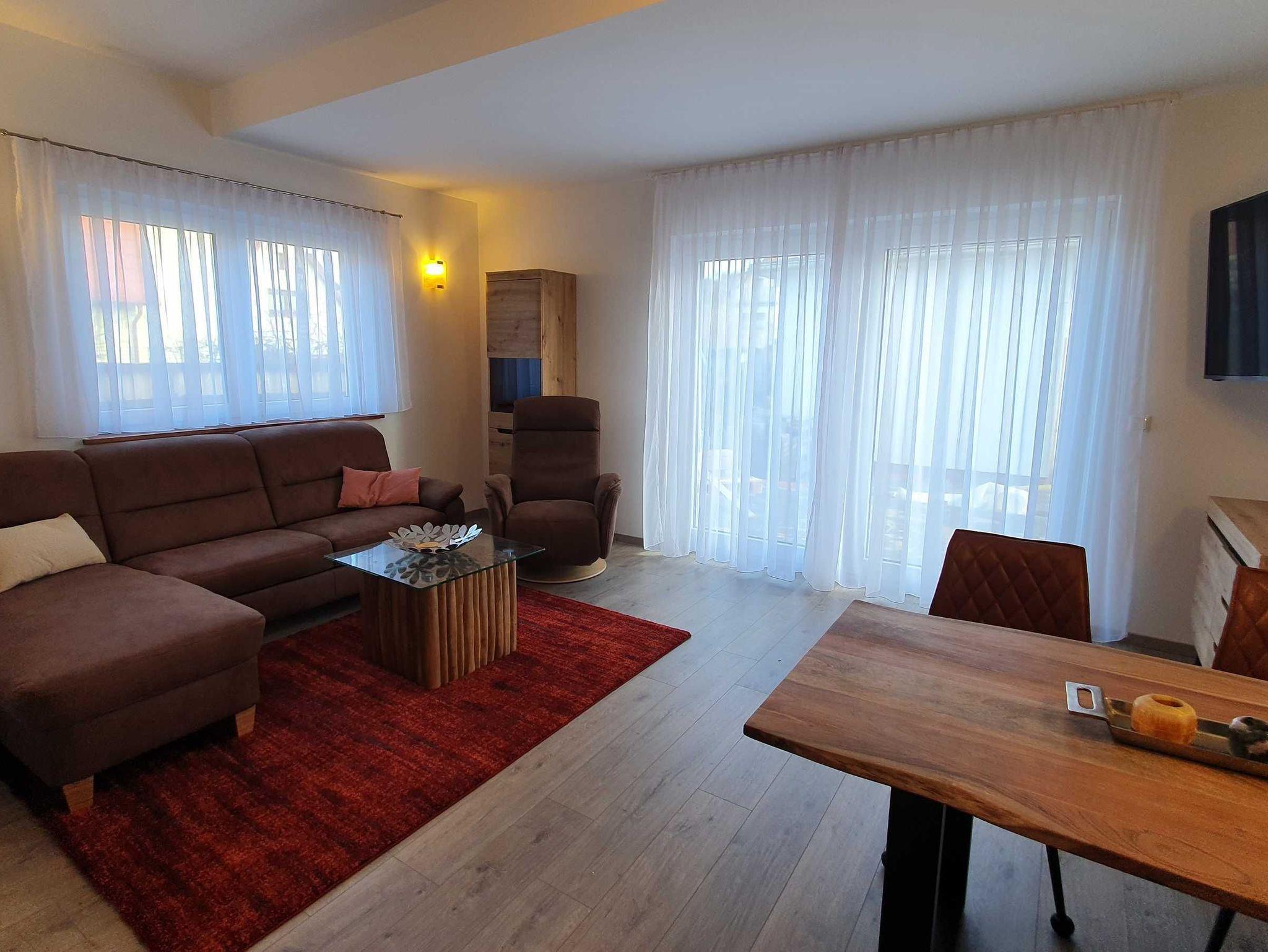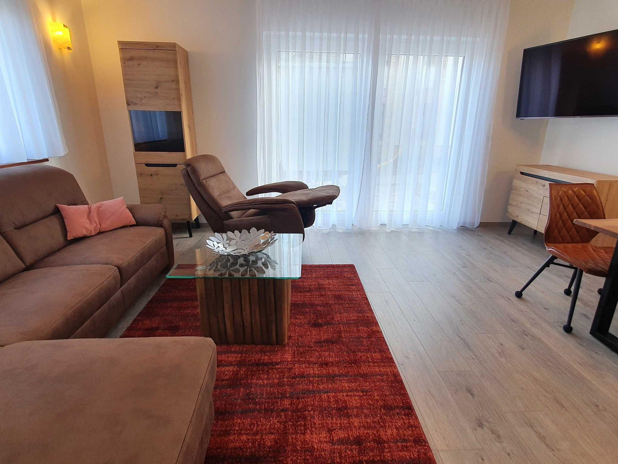 Entspannung finden sie im Wohlfühlbereich der Wohnung. Hier halten wir eine hochwertige und bequeme Polsterecke, einen Relaxsessel und einen Smart TV für sie bereit. Zusätzlich bieten wir Gästen dieser Wohnung eine eigene möblierte Terrasse an.