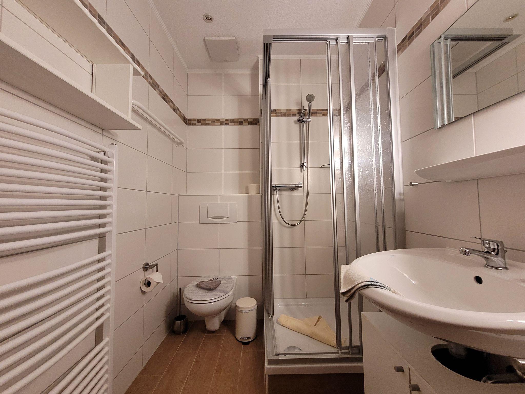 Die komplett eingerichtete Ferienwohnung mit Wohnzimmer, ein Schlafzimmer mit einem Ehebett und einer Liege, Küchenzeile, Dusche, WC, Flur und großem Balkon würde für Sie bereitstehen. Zur Ausstattung gehören weiter Radio, Sat-Fernseher, einmalig Bettwäsche und Handtücher. In der Küchenzeile sind Mikrowelle, Kaffeemaschine und Toaster, Eier- und Wasserkocher sowie ein 2- Platten-Kocher, Kühlschrank und Geschirr vorhanden. Wir möchten Sie darauf hinweisen, dass es sich bei unseren Ferienwohnungen um Nichtraucherwohnungen handelt. Natürlich dürfen Sie auf dem Balkon oder der Terrasse rauchen. Die Waschmaschinen- und Trocknerbenutzung ist nach vorheriger Absprache möglich.