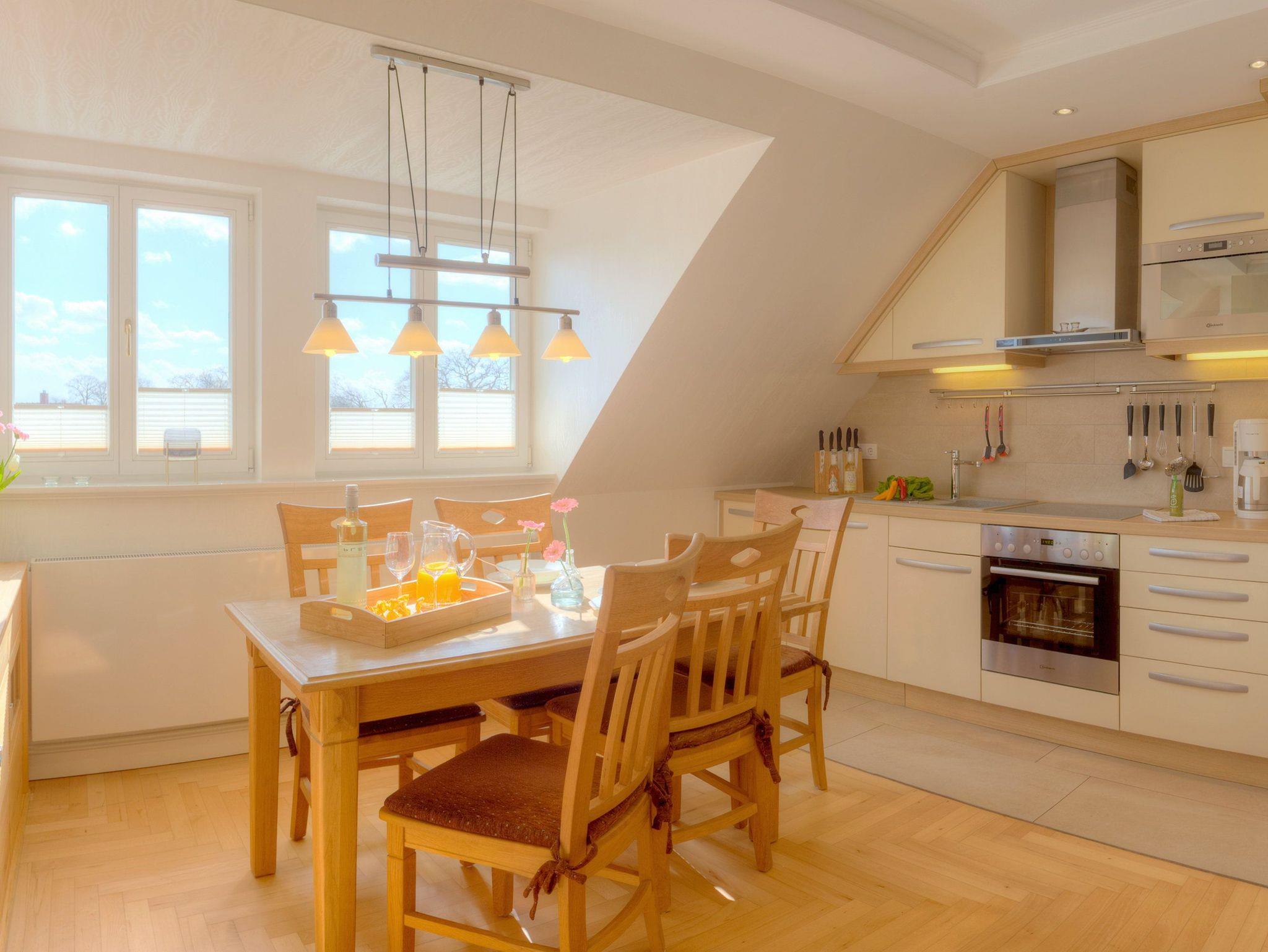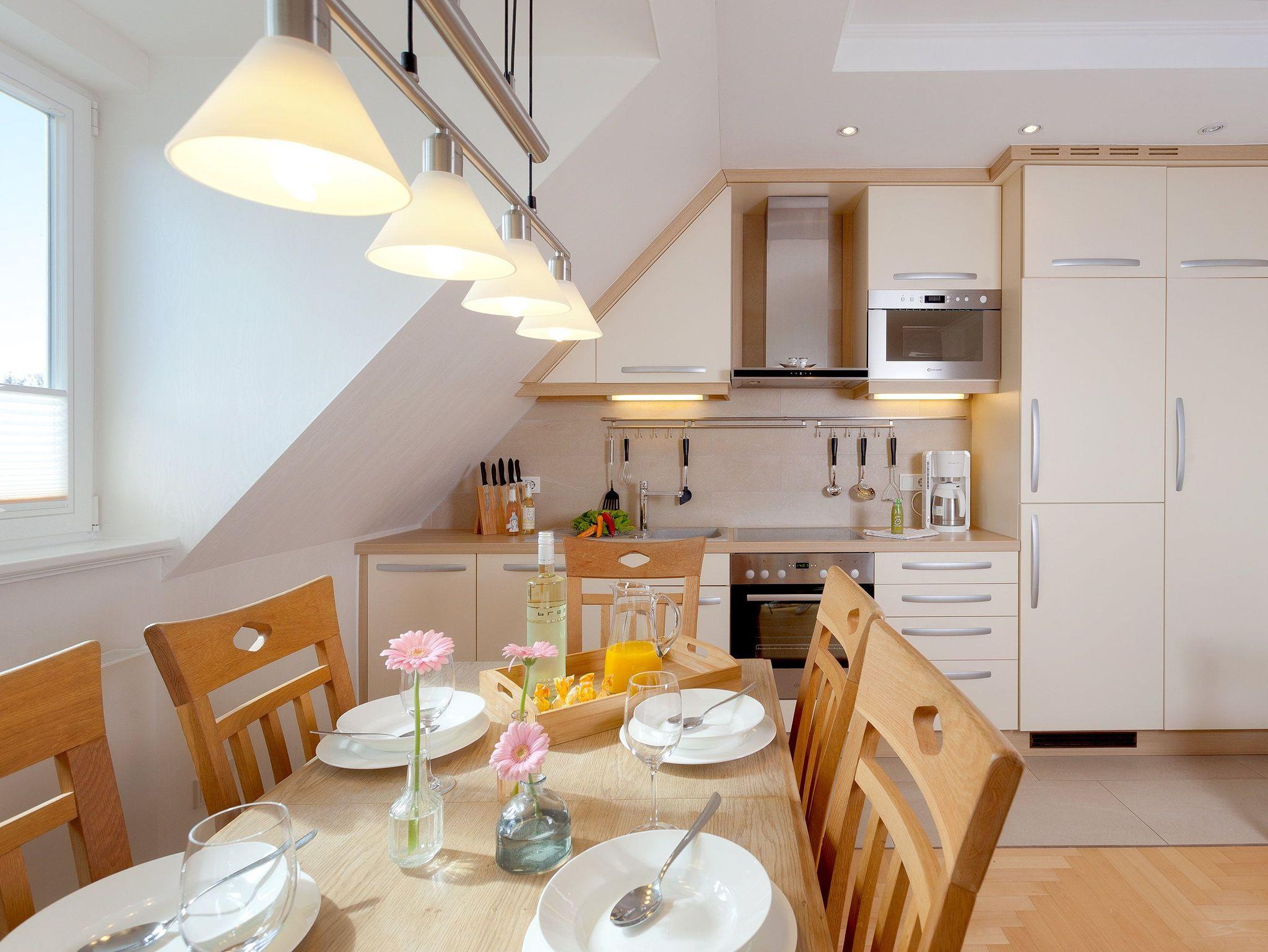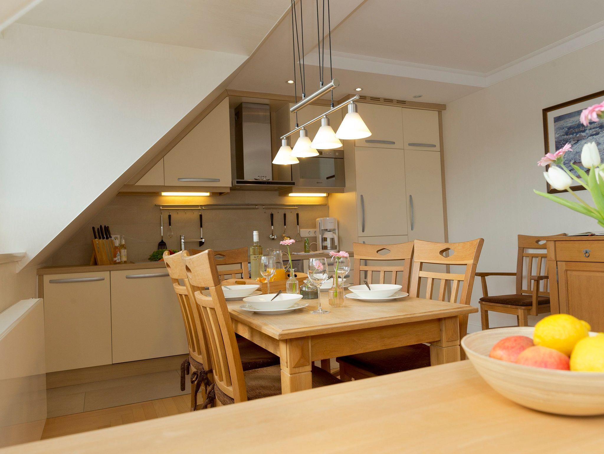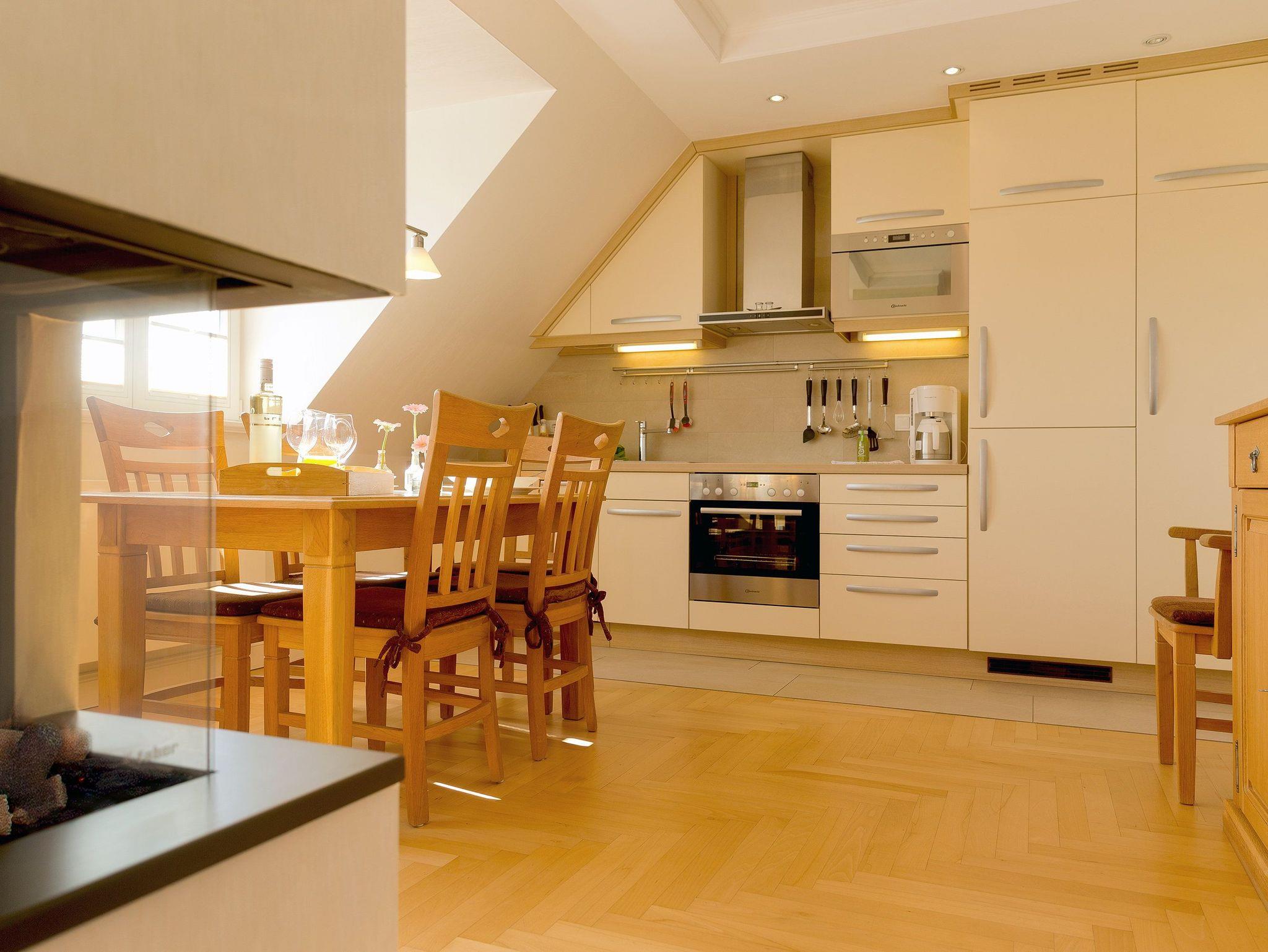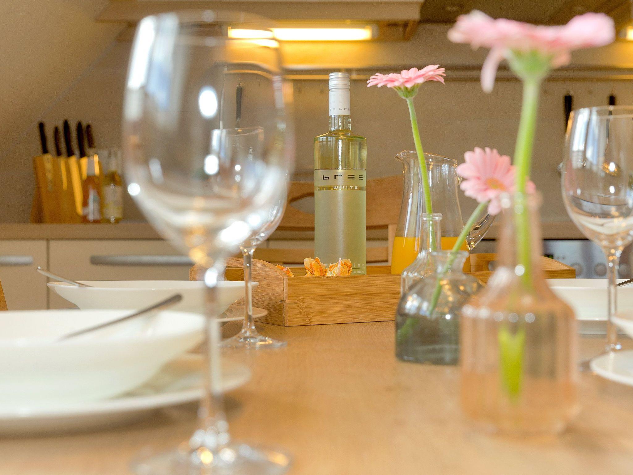 Technisch lässt das Wohnzimmer mit 40 Zoll-LED-TV und WLAN-Anschluss keine Wünsche offen. Die im Wohnzimmer integrierte hochwertige Küchenzeile ist mit allen Extras (Backofen, Kühlschrank mit Gefrierfach, Geschirrspüler, Mikrowelle, Wasserkocher, Toaster, Kaffeemaschine) ausgestattet, so dass einem Perfekten Dinner nichts im Wege steht.