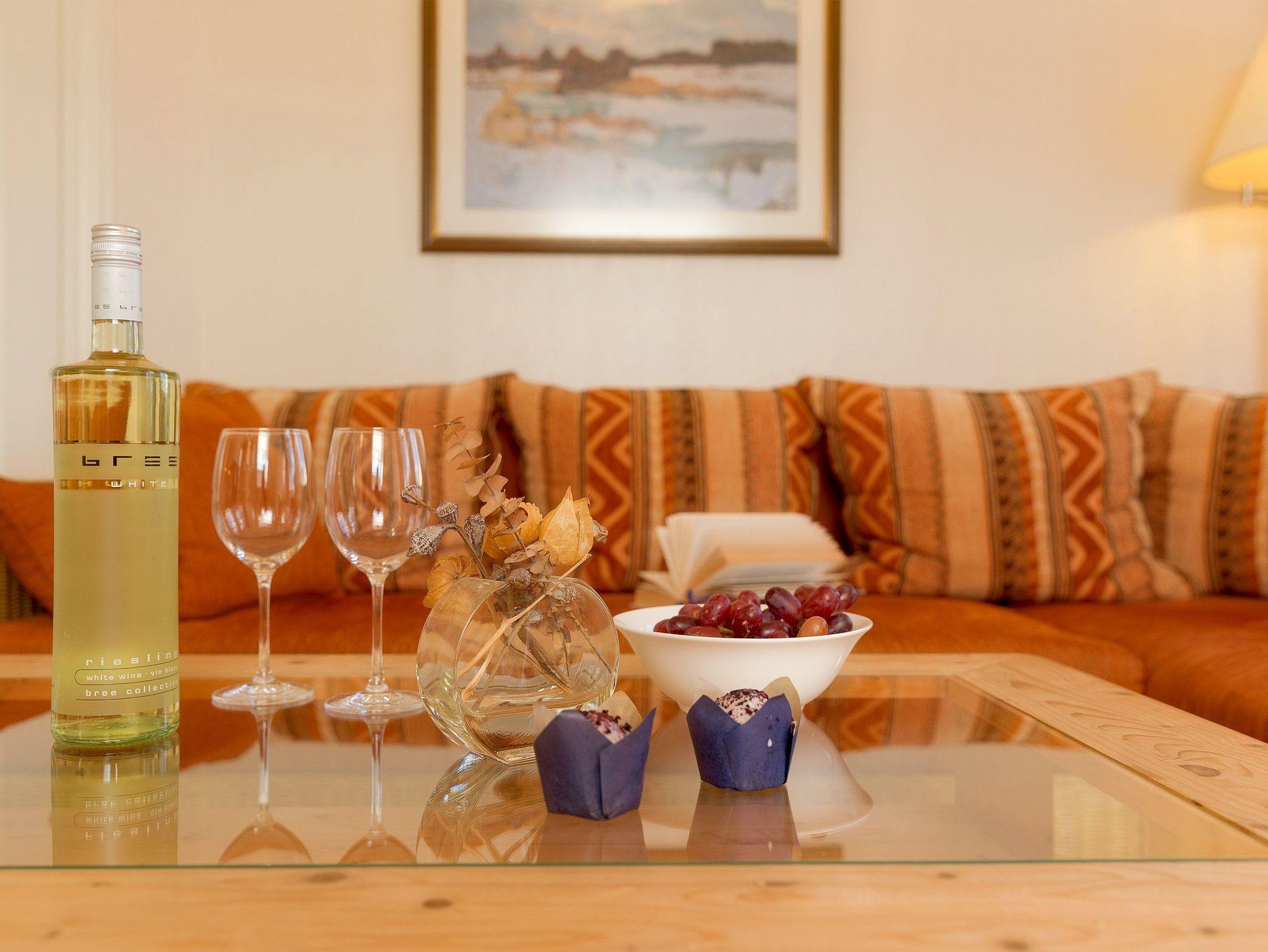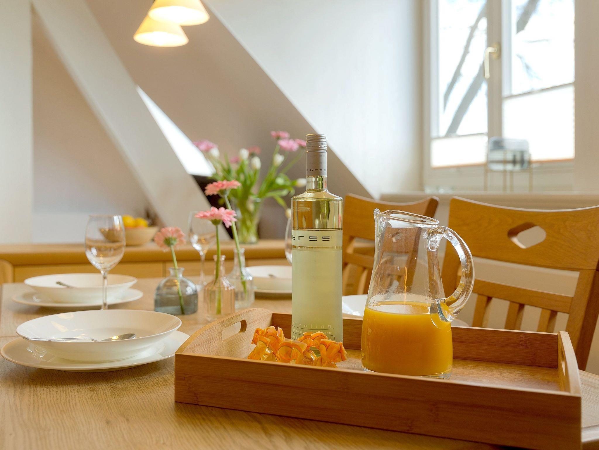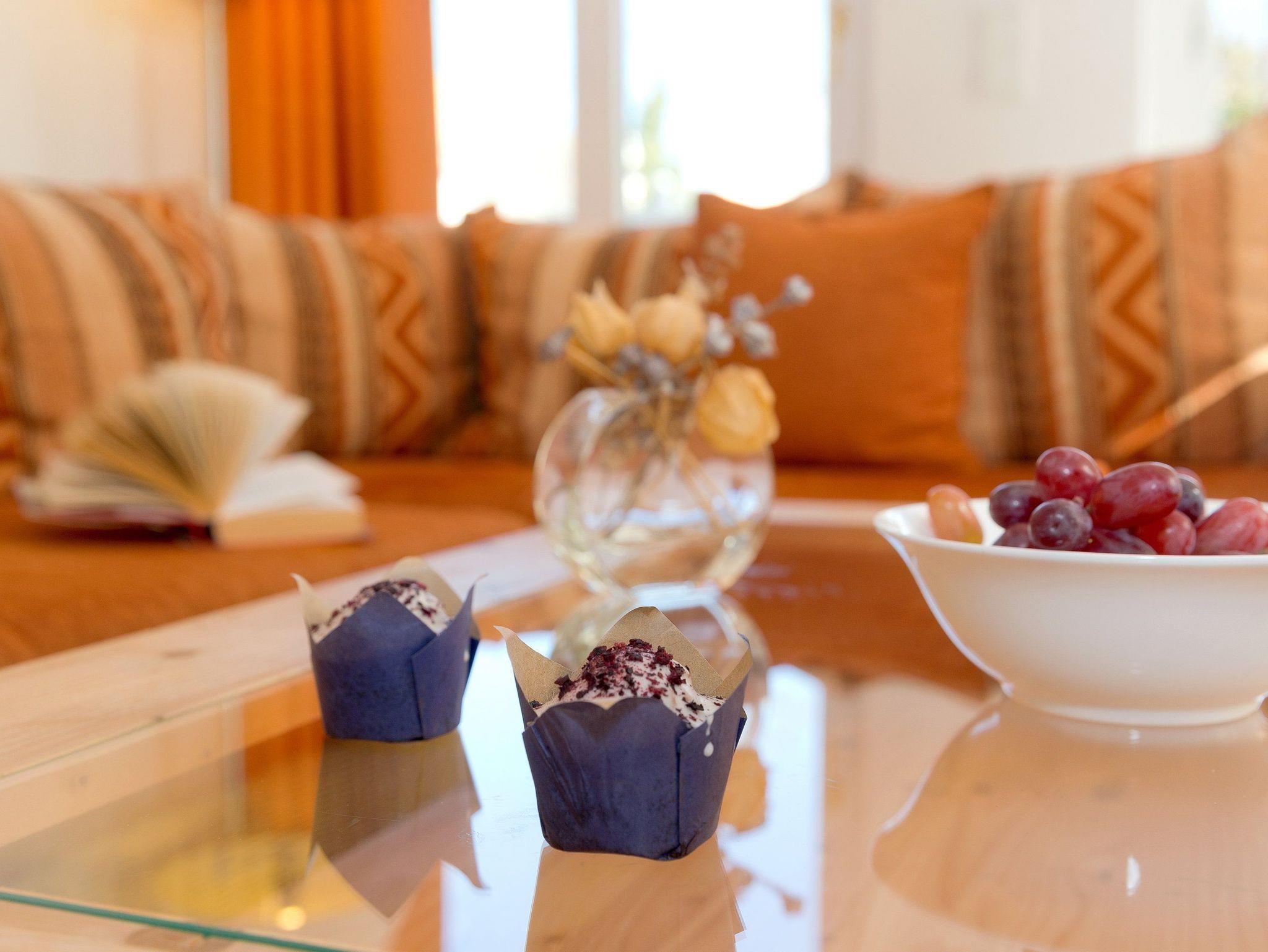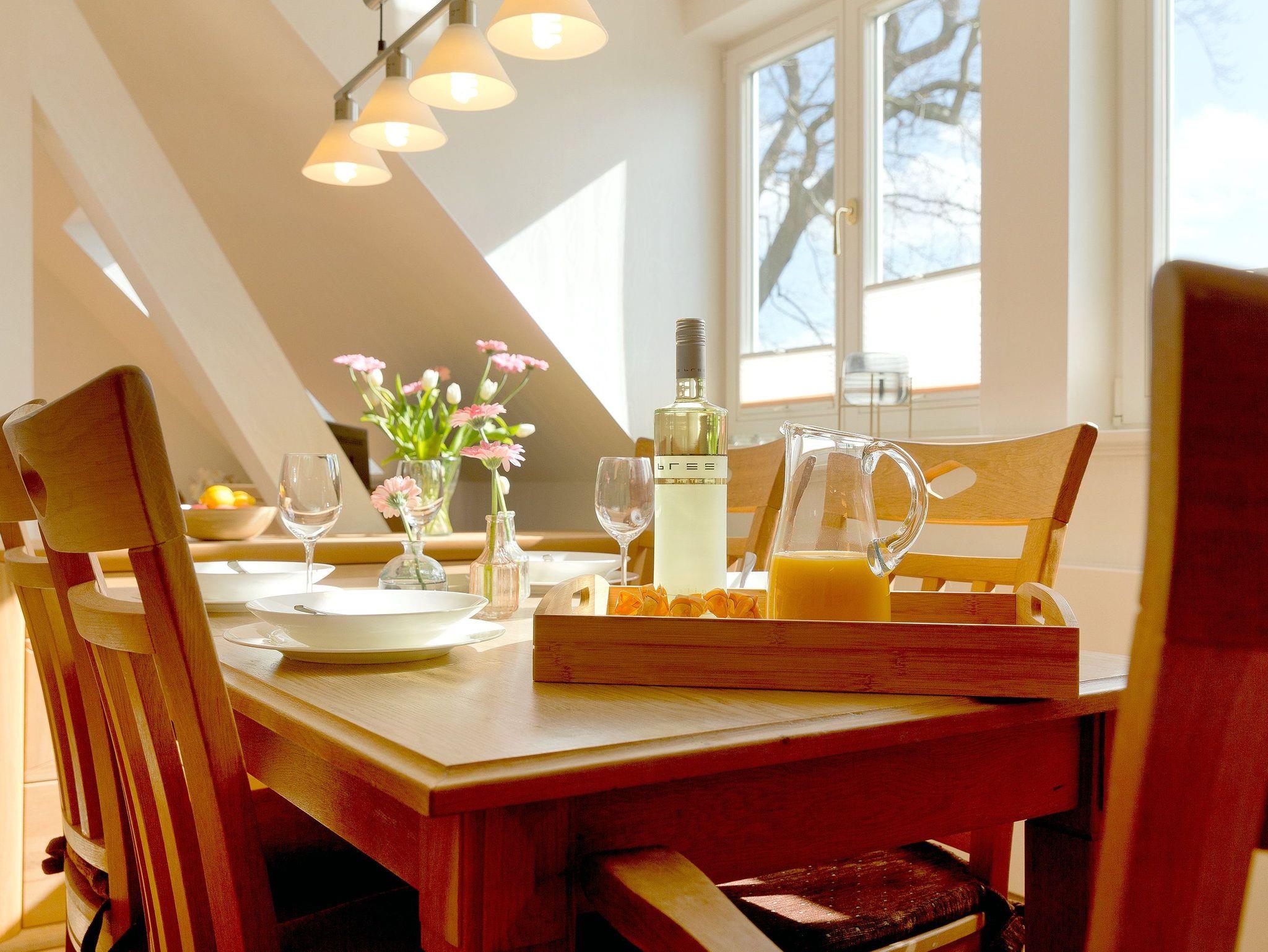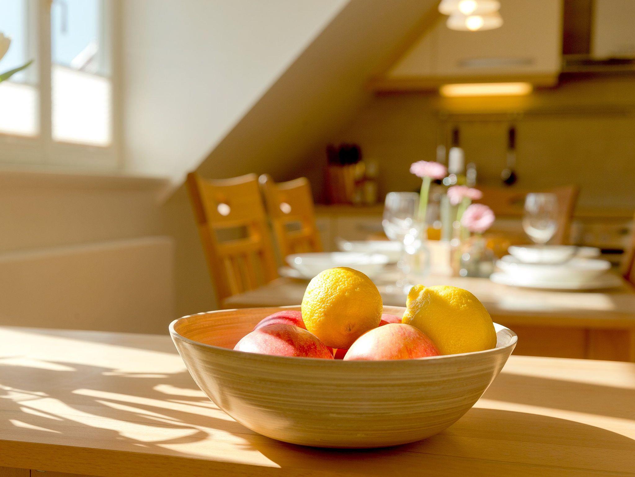 Technisch lässt das Wohnzimmer mit 40 Zoll-LED-TV und WLAN-Anschluss keine Wünsche offen. Die im Wohnzimmer integrierte hochwertige Küchenzeile ist mit allen Extras (Backofen, Kühlschrank mit Gefrierfach, Geschirrspüler, Mikrowelle, Wasserkocher, Toaster, Kaffeemaschine) ausgestattet, so dass einem Perfekten Dinner nichts im Wege steht.