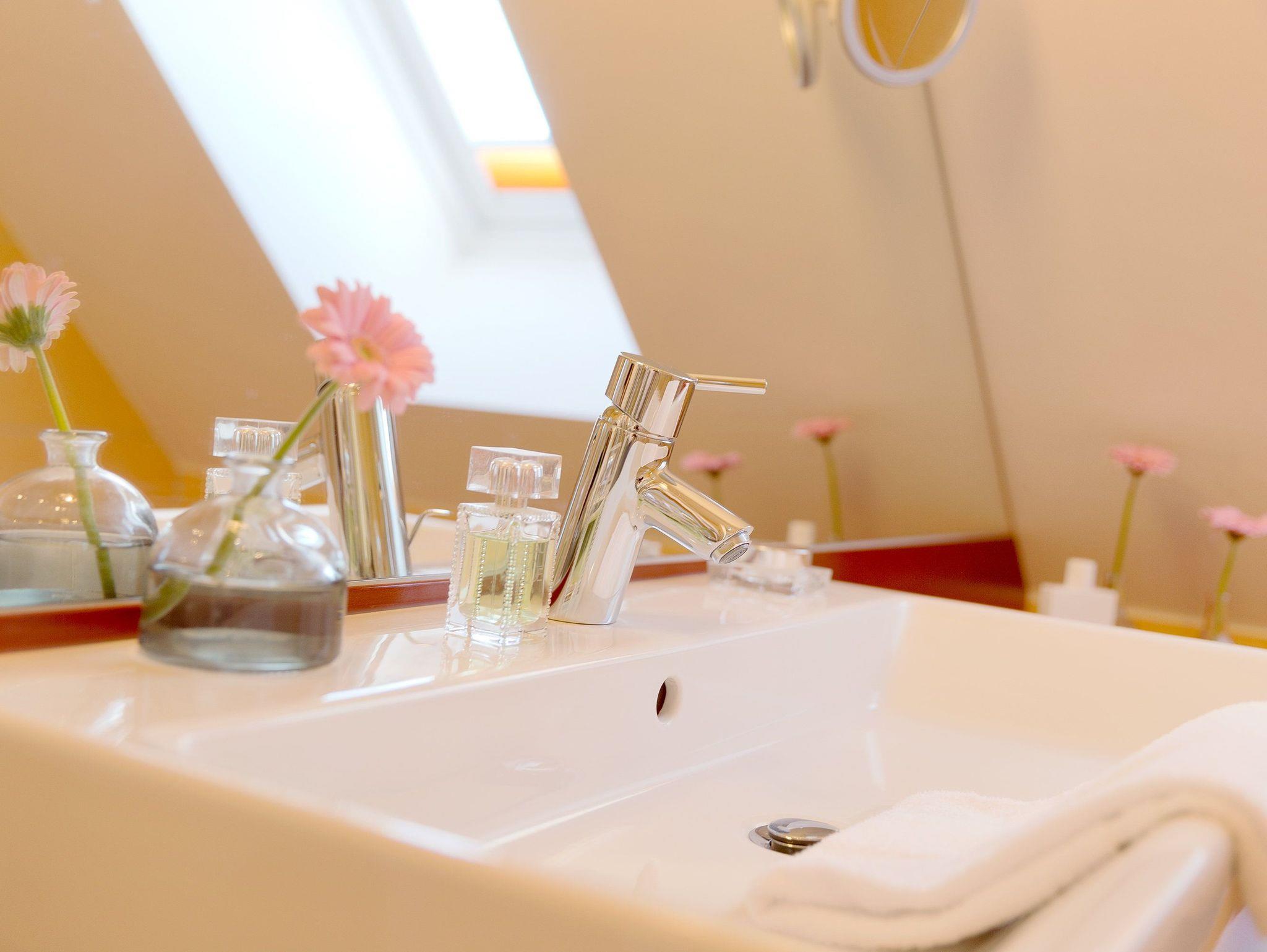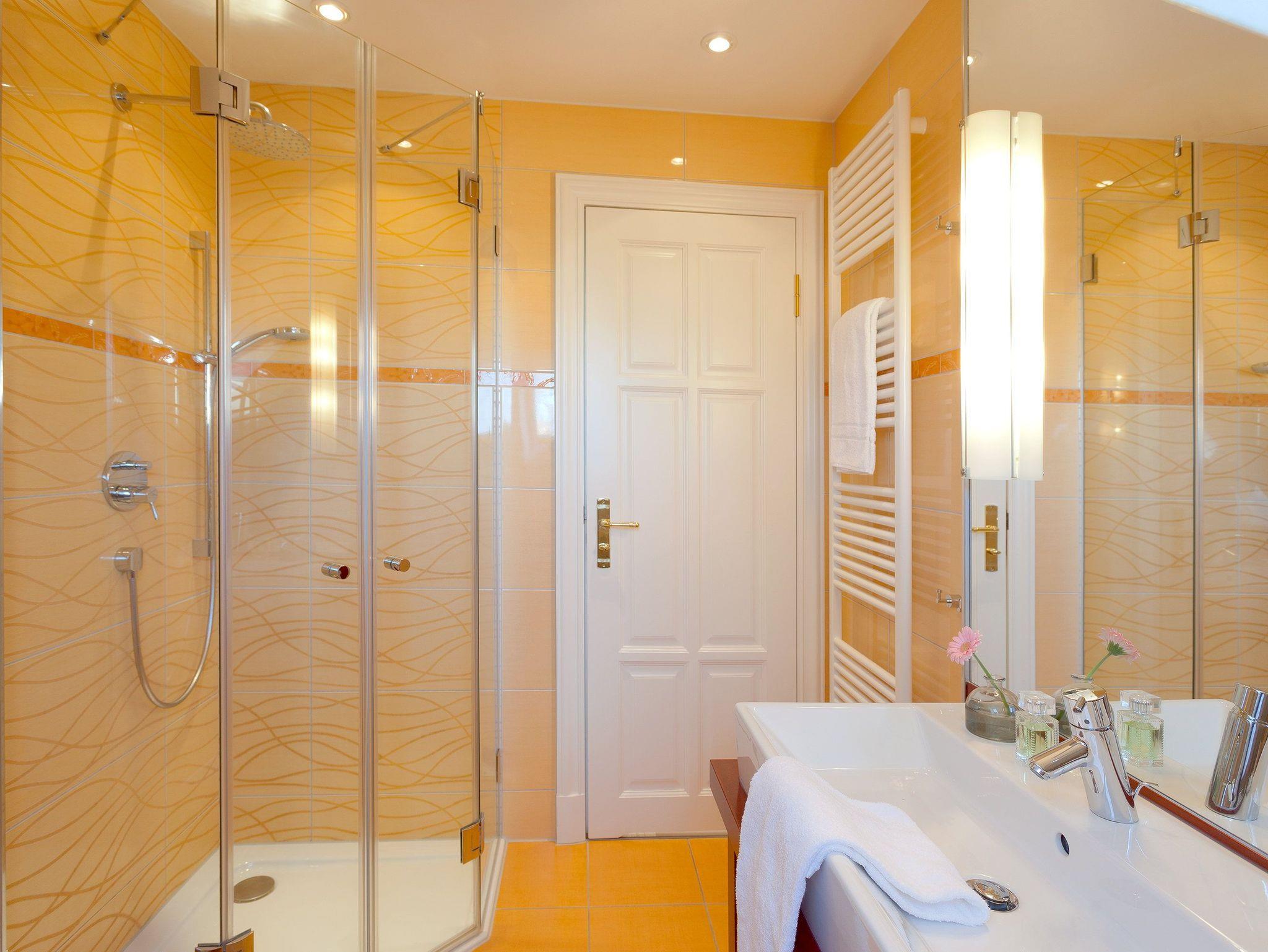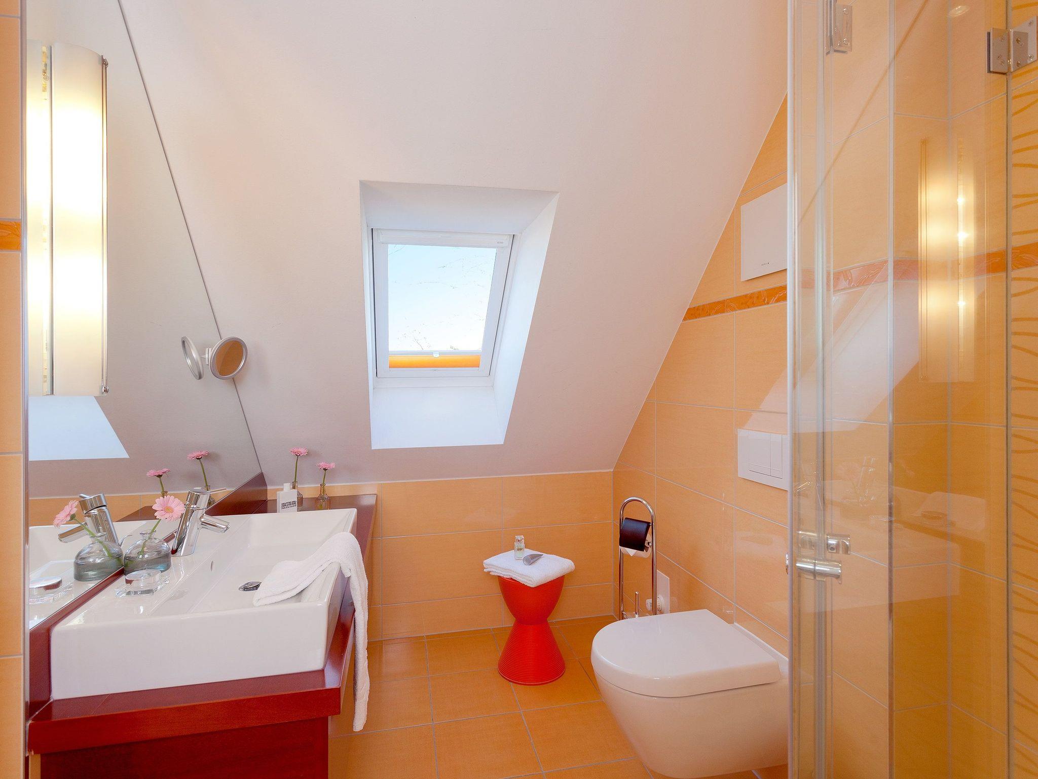 Damit Sie Ihre wohlverdiente Urlaubszeit bereits am Anreisetag in vollen Zügen genießen können, haben wir das Bett für Sie und das für Ihre lieben Mitreisenden bereits bezogen und ein Duschtuch sowie ein kleines Handtuch bereitgelegt. Das Badezimmer mit Fenster ist mit einer superflachen Duschtasse und einer Echtglas-Dusche, WC und einem Fön ausgestattet.