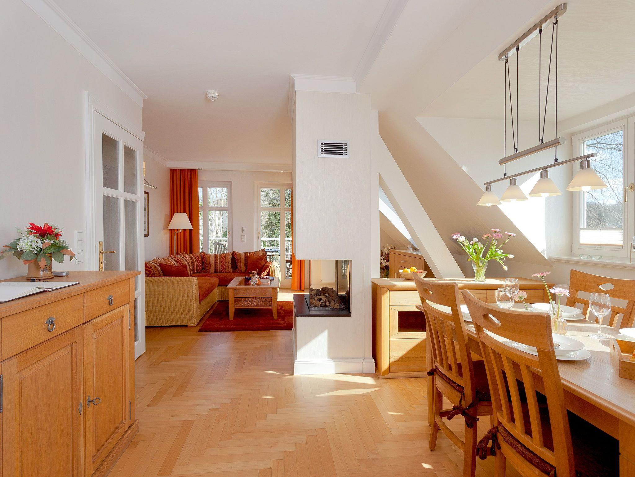 Im großzügigen Wohnbereich wartet eine gemütliche Sitzecke mit bequemen Polstermöbeln, Flat-TV und Gaskamin zum Entspannen auf Sie. Für die Nachtruhe aber auch für ein Schlummerstündchen zwischendurch lässt sich die Couch bequem als Schlafstätte umfunktionieren. Der angrenzende Südost-Balkon lädt zum Sonnenbaden ein.