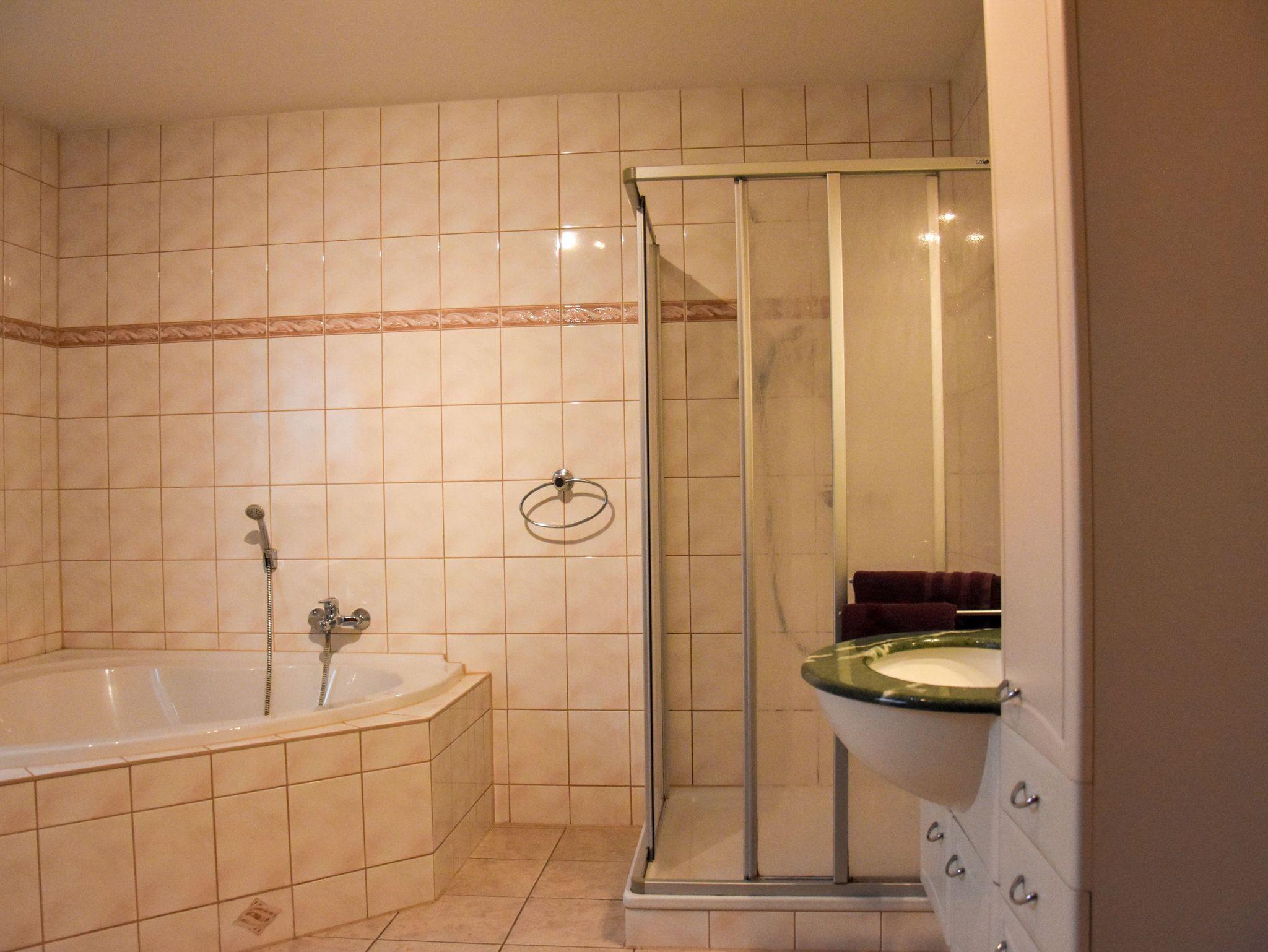 Weiterhin befinden sich im Erdgeschoss ein Schlafzimmer mit Doppelbett und ein Badezimmer mit Eckbadewanne und WC. Zusätzlich ist ein Gäste-WC vorhanden.
