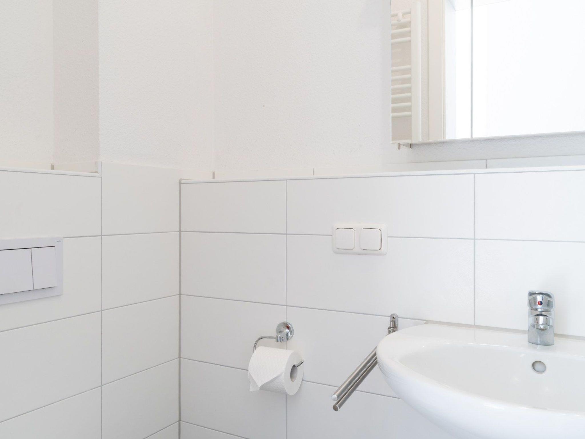 Das Badezimmer verfügt über eine Dusche (mit Absatz) und WC.