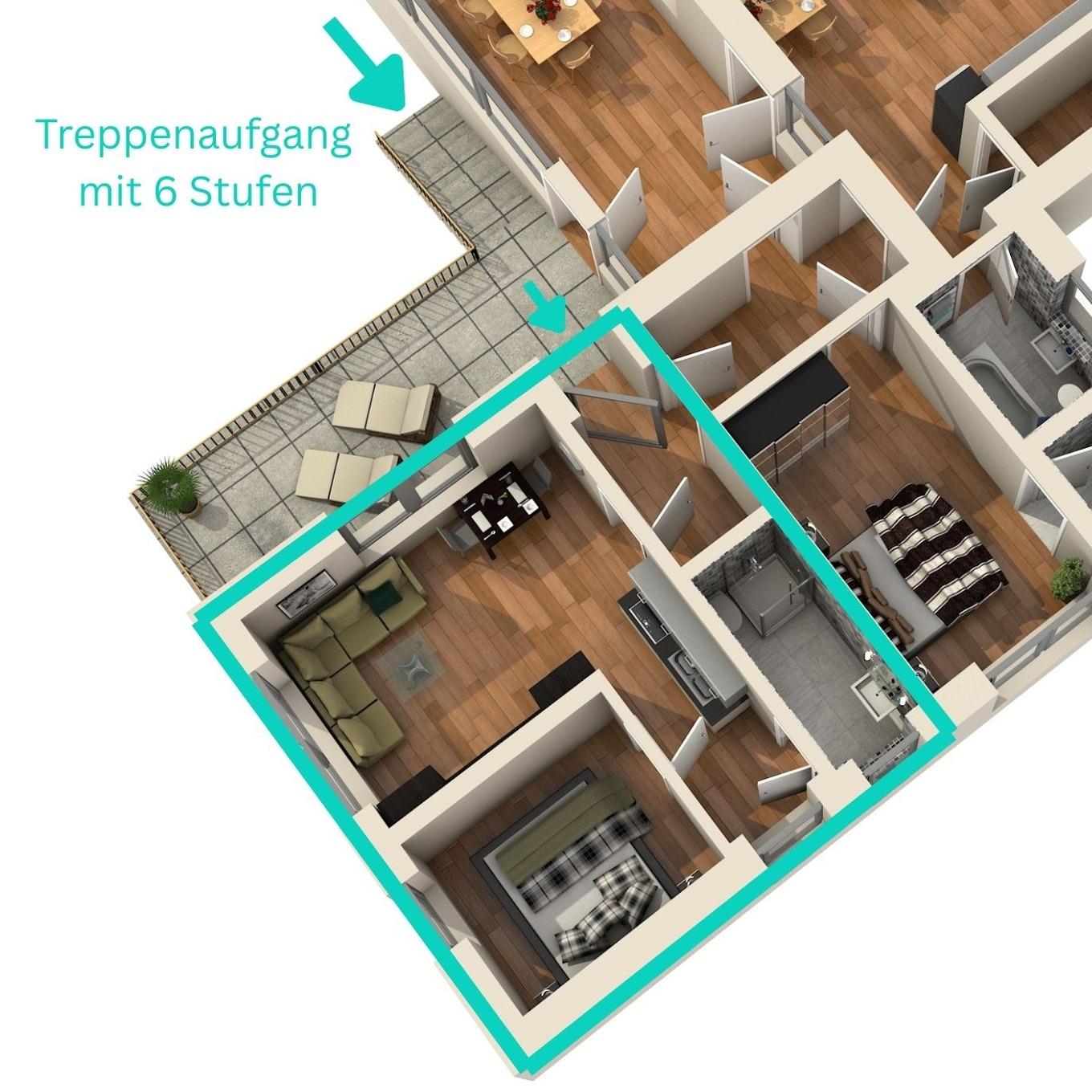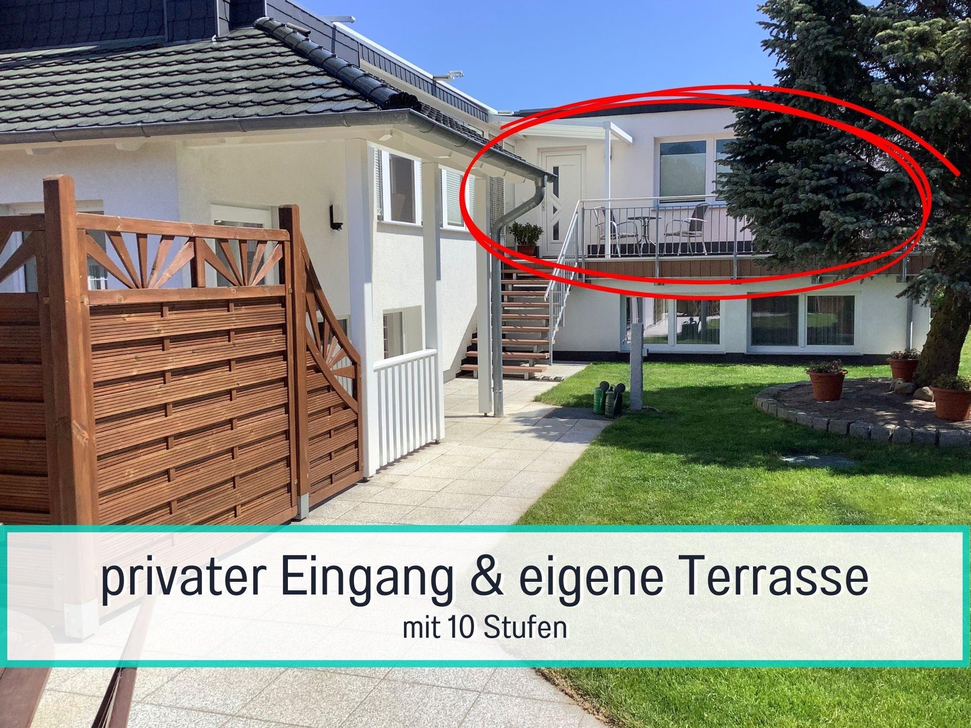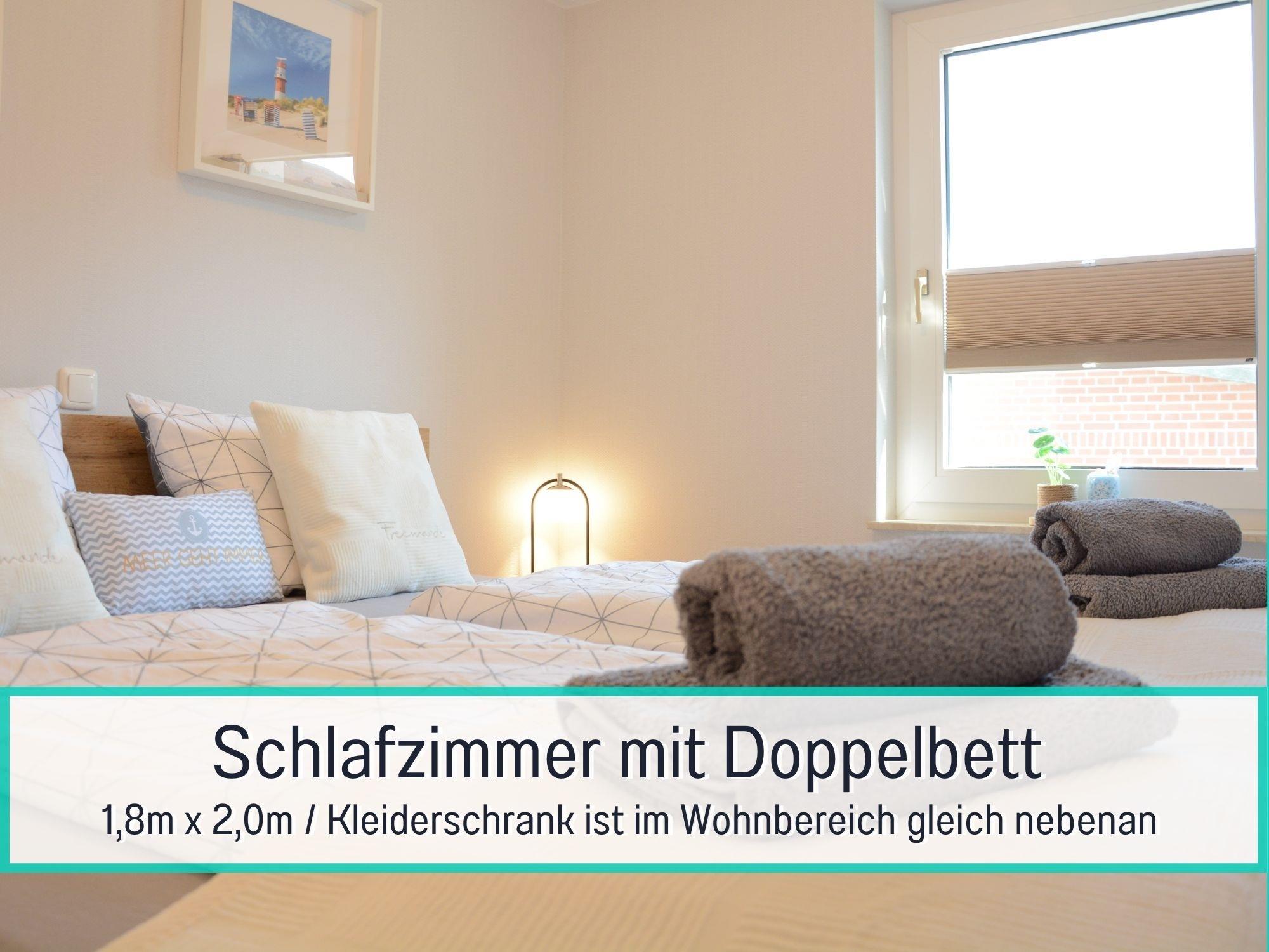 Moderne Ferienwohnung mit Schlafzimmer und Doppelbett, Bad mit Dusche sowie eigenem Fahrradabstellraum. Ein privater Parkplatz gehört zur Wohnung dazu. Die große Terrasse mit Sitzmöglichkeit lädt besonders im Sommer zum Entspannen und Genießen ein.