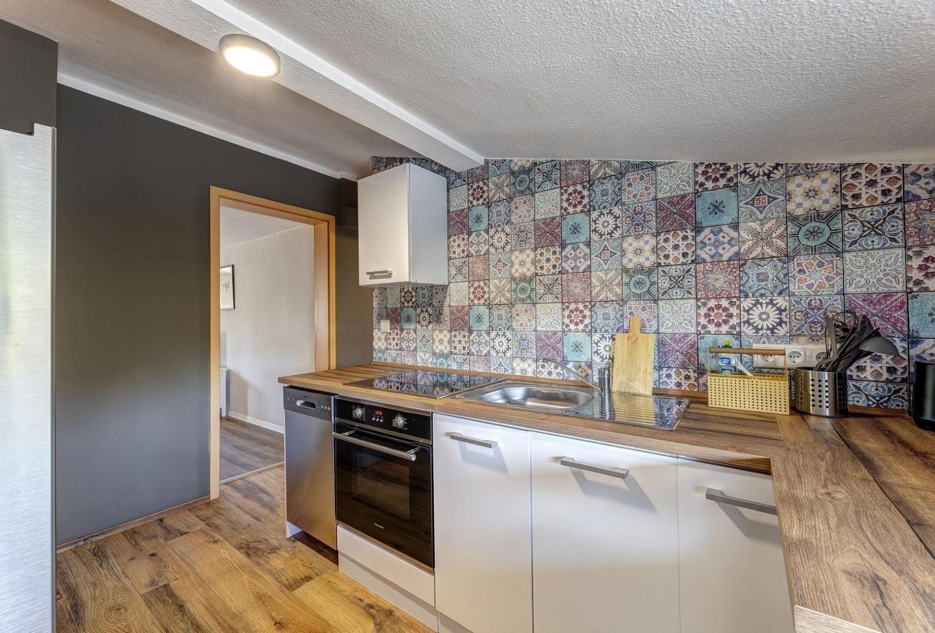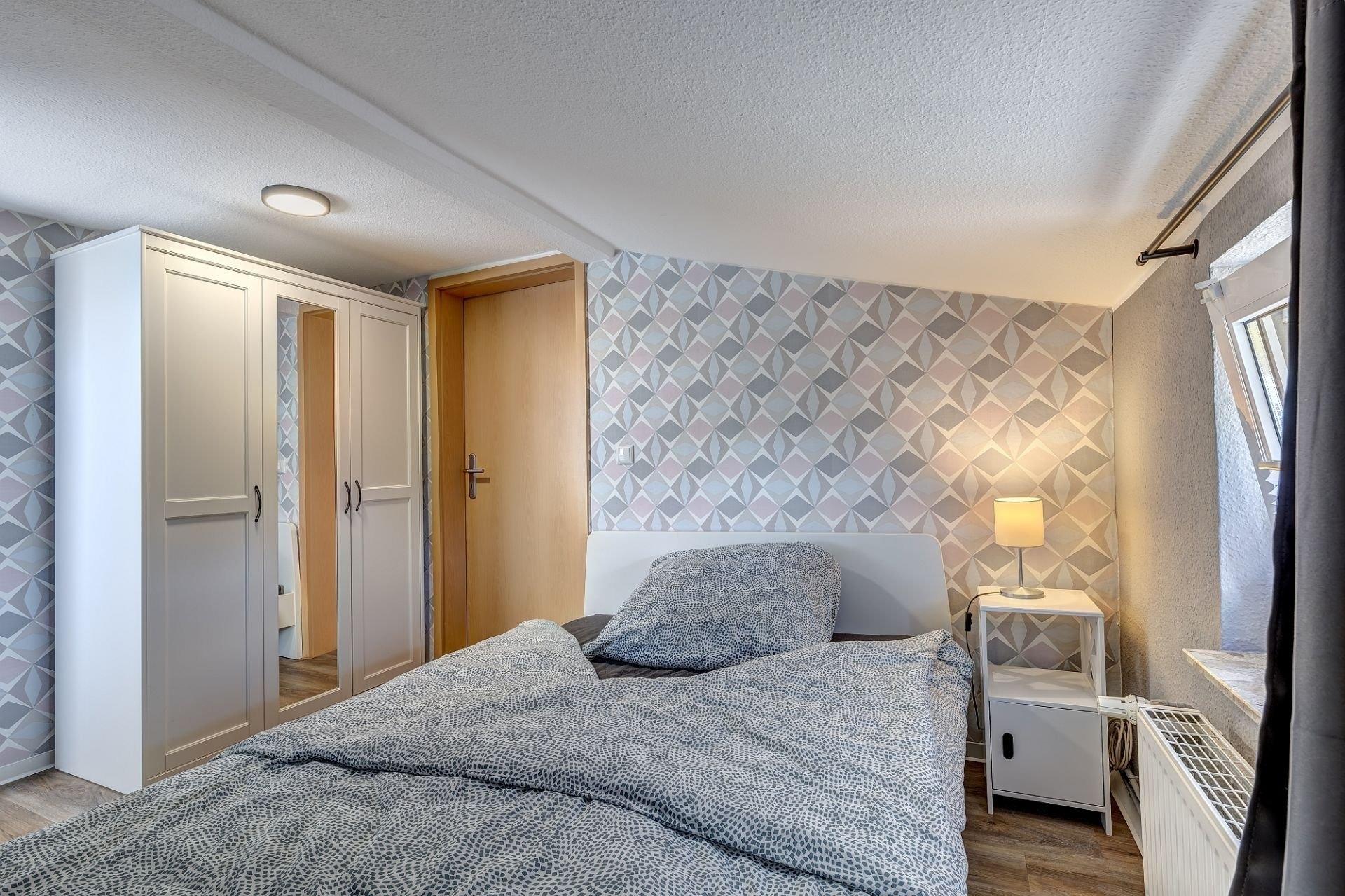 Die 57 qm große Ferienwohnung verfügt über ein helles Wohn- und Esszimmer (mit einer möglichen Aufklapp-Aufbettung 200 x 90 cm), ein Schlafzimmer (mit einem Bett für zwei Personen 200 x 140 cm), ein kleines Schlafzimmer (mit einem Einzelbett 200 x 80 cm), eine Küche, ein großes Bad mit Dusche sowie ein kleines Bad. Im Wohn-/Essbereich sind ausreichend Sitzgelegenheiten vorhanden, um das in der voll ausgestatteten Küchenzeile (Backofen, Spülmaschine, Spüle, Kaffeemaschine) zubereitete Essen zu sich zu nehmen. Neben dem Treppenzugang befindet sich ein separates mit Hecken und Zaun eingefasstes Grundstück, das für Federball und vieles mehr geeignet ist.