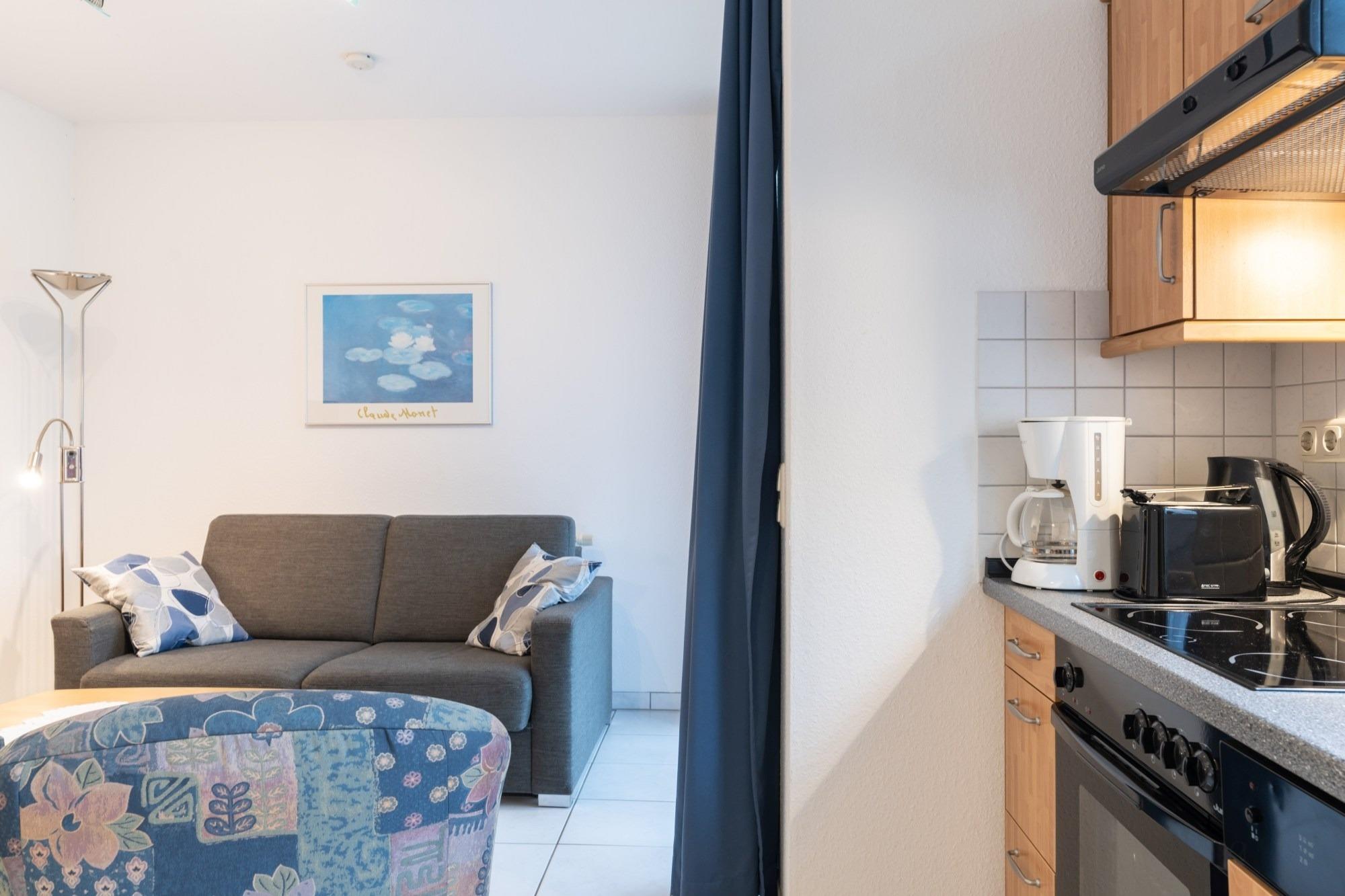 Die hier angrenzende Küchenzeile ist mit einem Kühlschrank mit Gefrierfach, einem Geschirrspüler und einem Backofen mit Cerankochfeld ausgestattet. Eine Kaffeemaschine, ein Toaster und ein Wasserkocher stehen Ihnen hier selbstverständlich zur Verfügung.