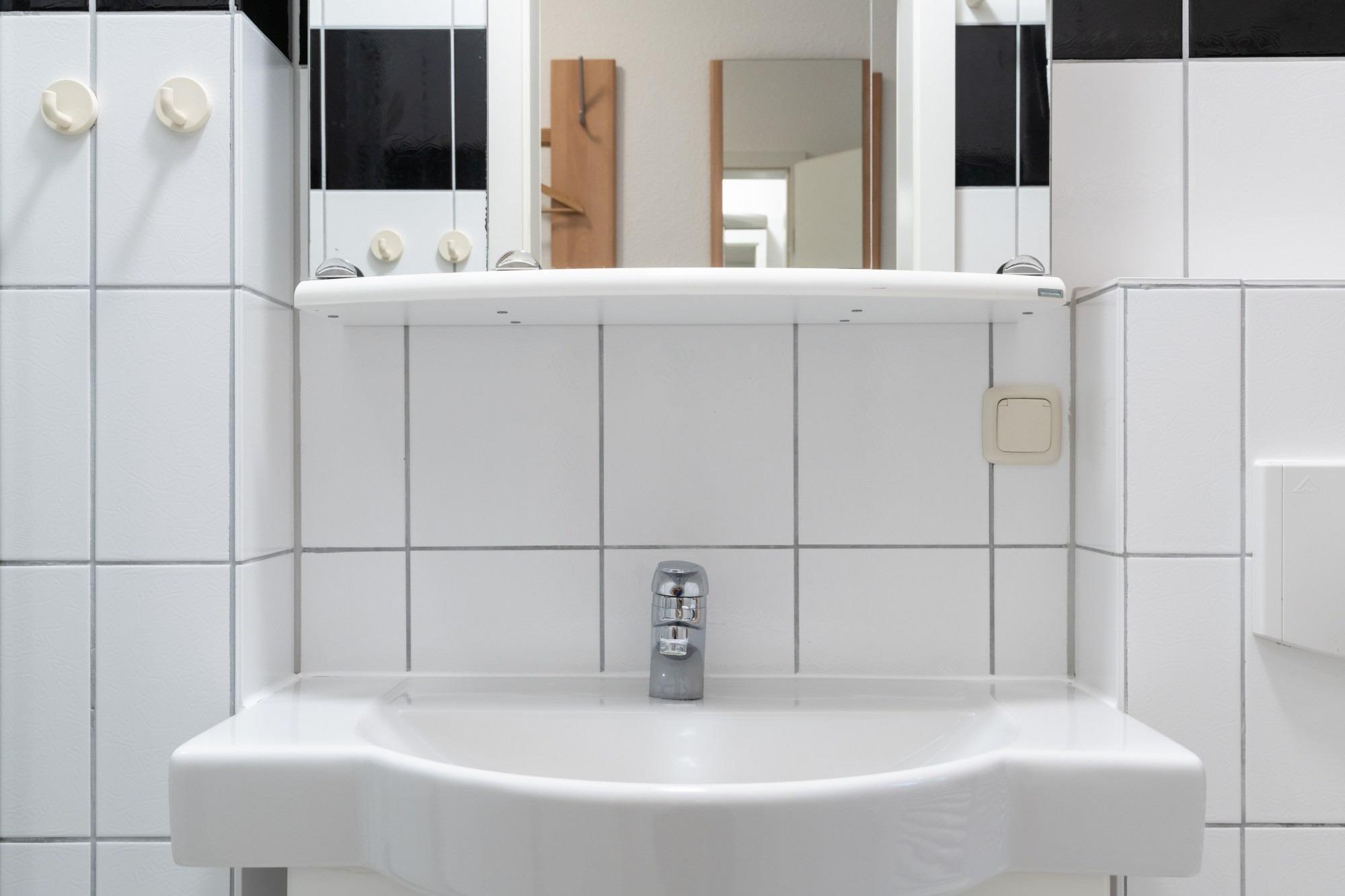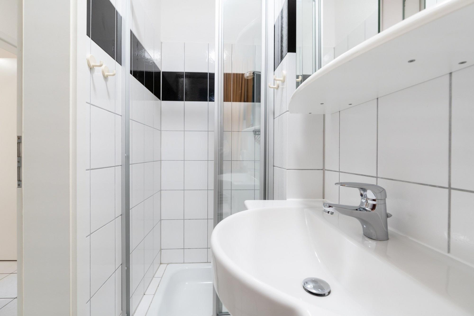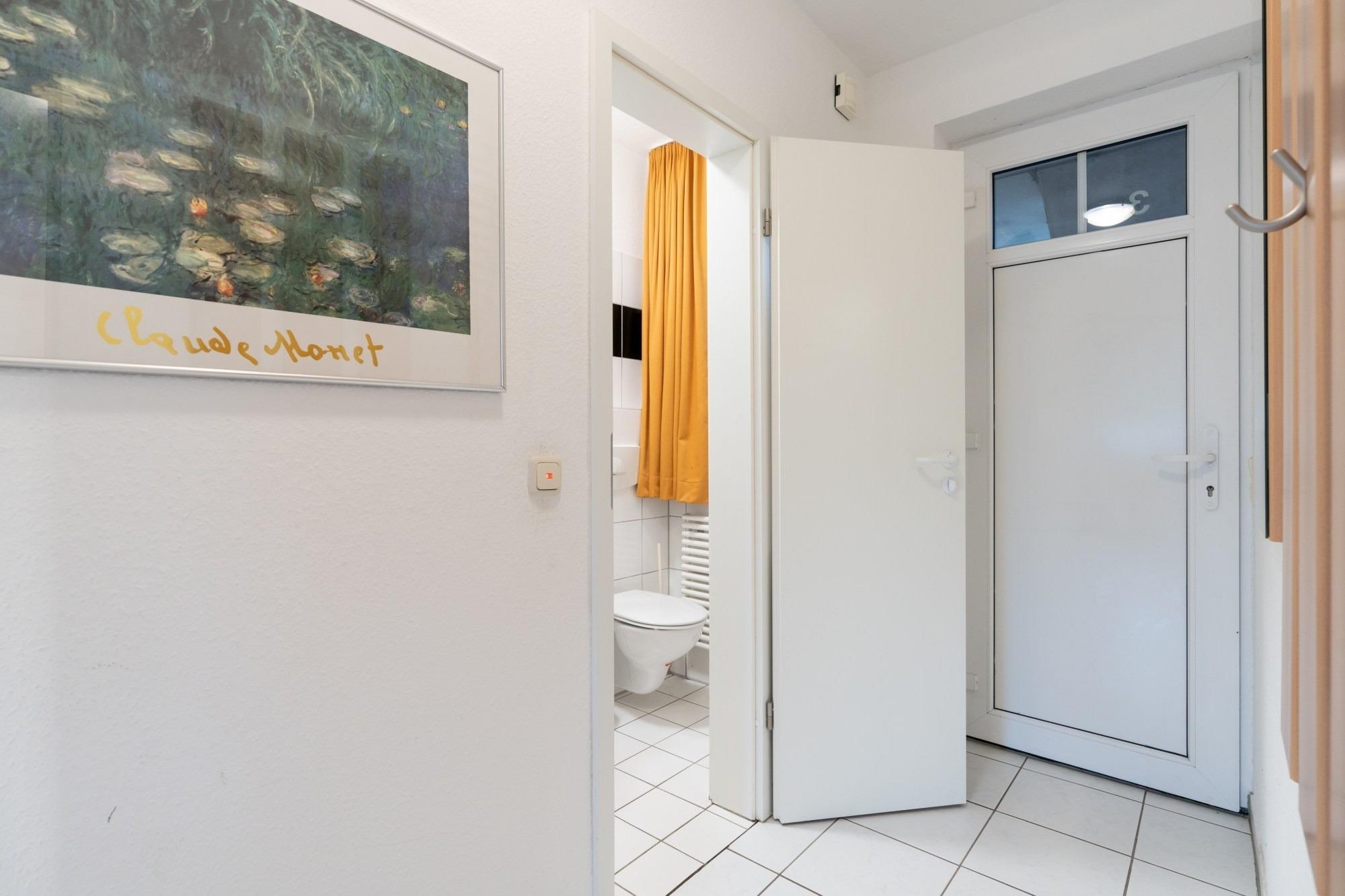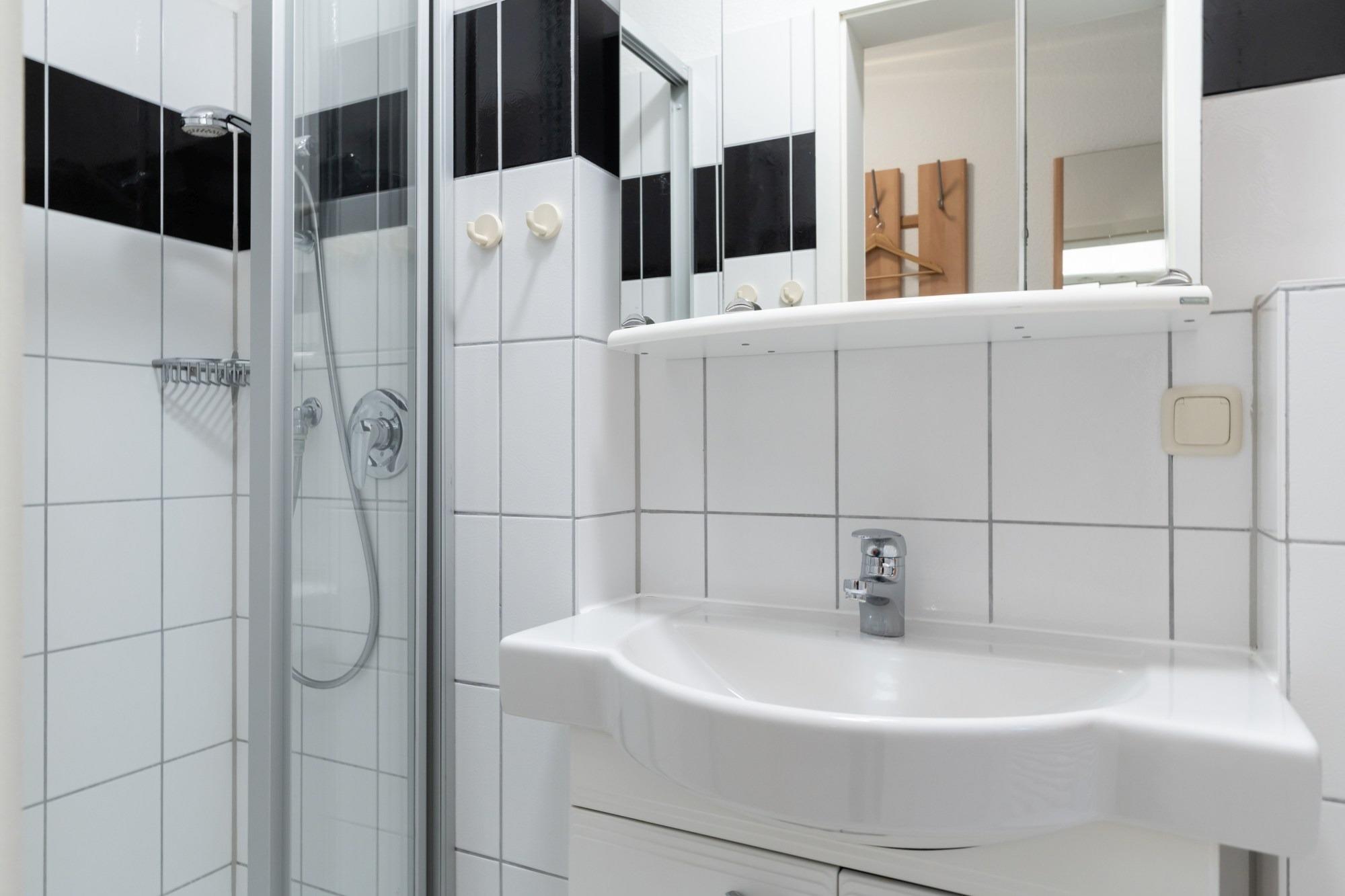 Das Badezimmer verfügt über eine Dusche und WC.