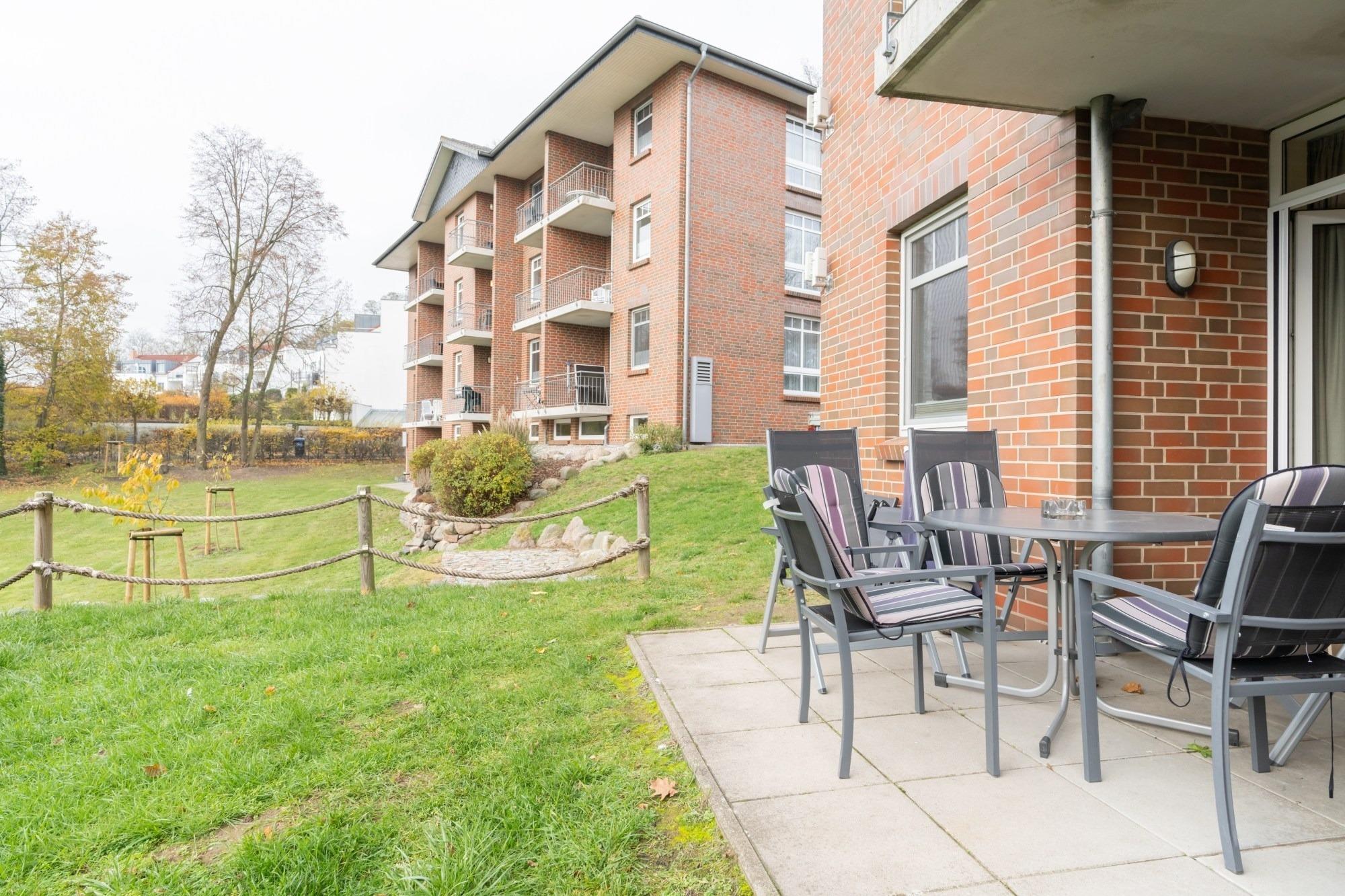 Die 61 m ² große Ferienwohnung 19 befindet sich im Erdgeschoss im Haus Roland (linkes Gebäude vom Parkplatz aus gesehen). Sie bietet mit ihren drei Zimmern ausreichend Platz für bis zu 6 Personen.