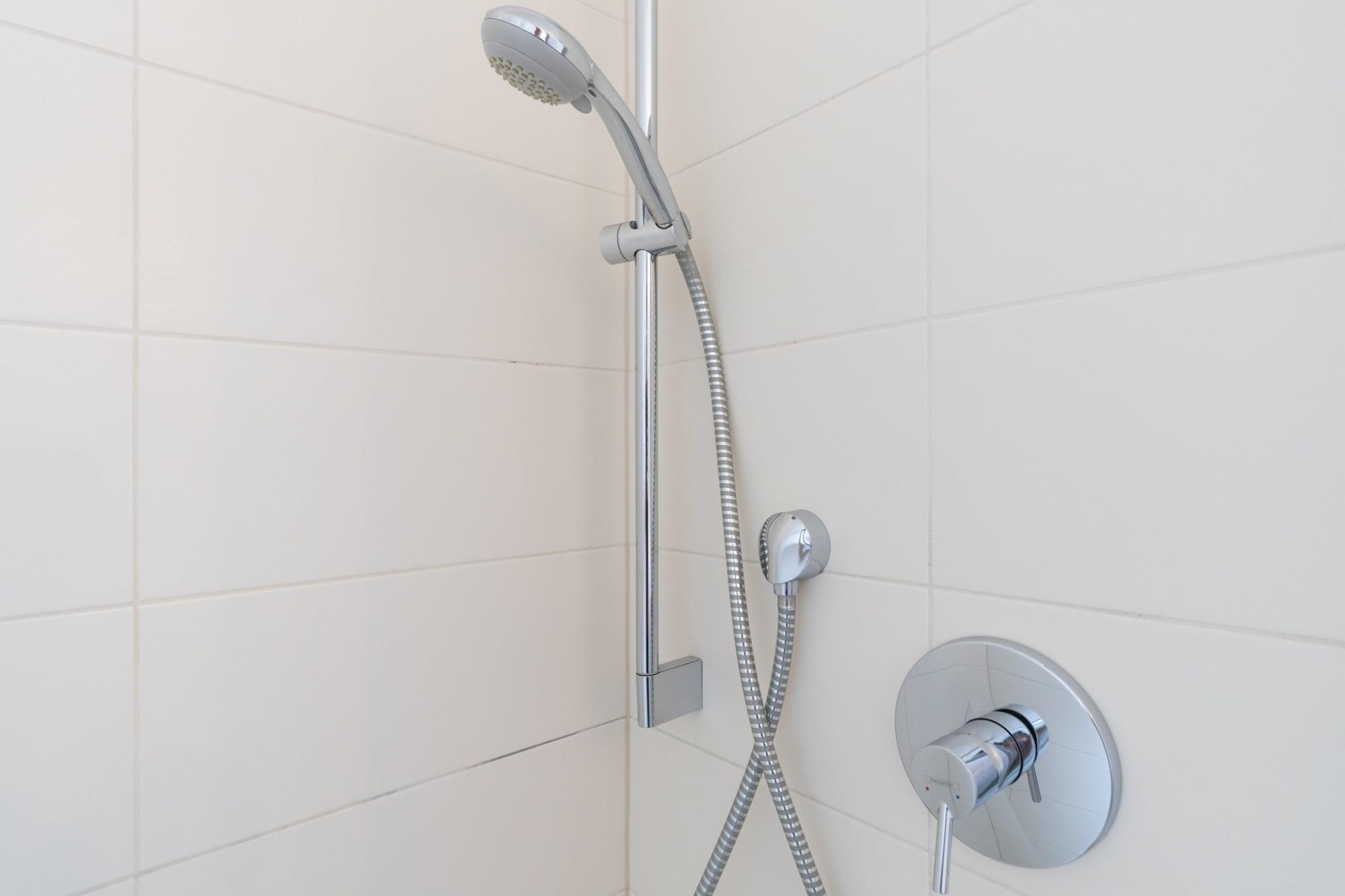 Das Badezimmer verfügt über eine Dusche und WC.