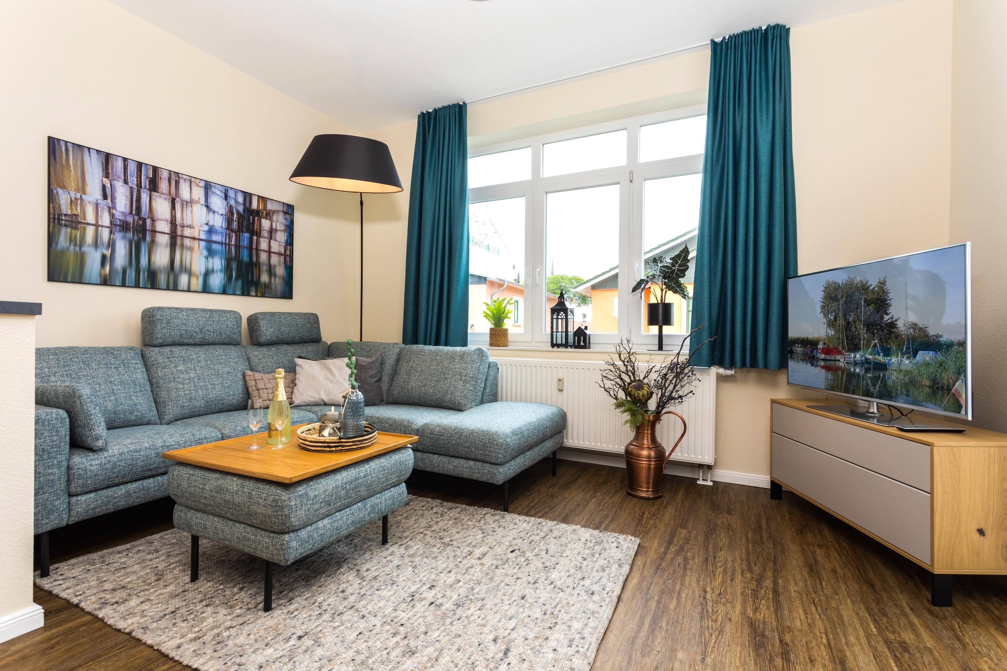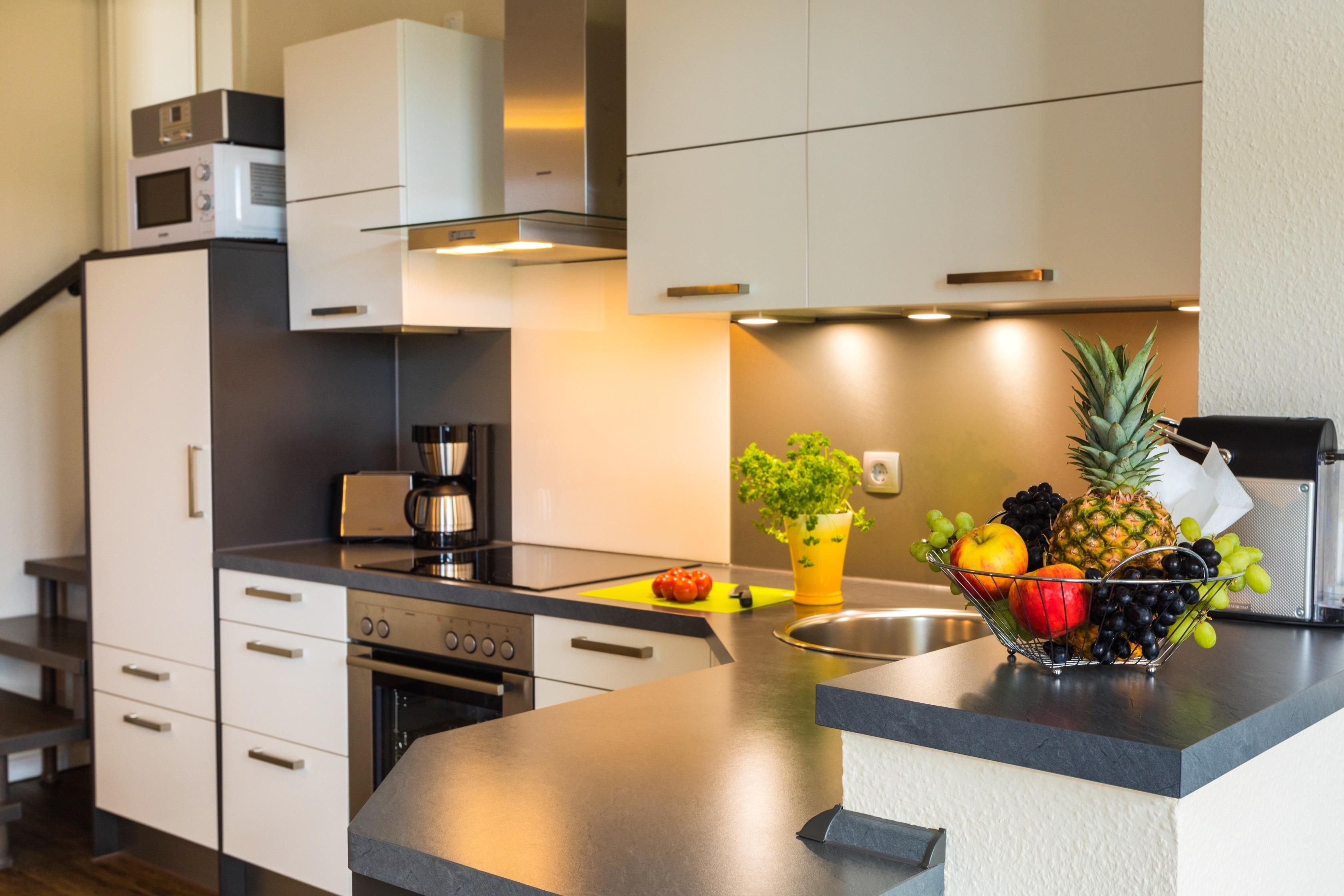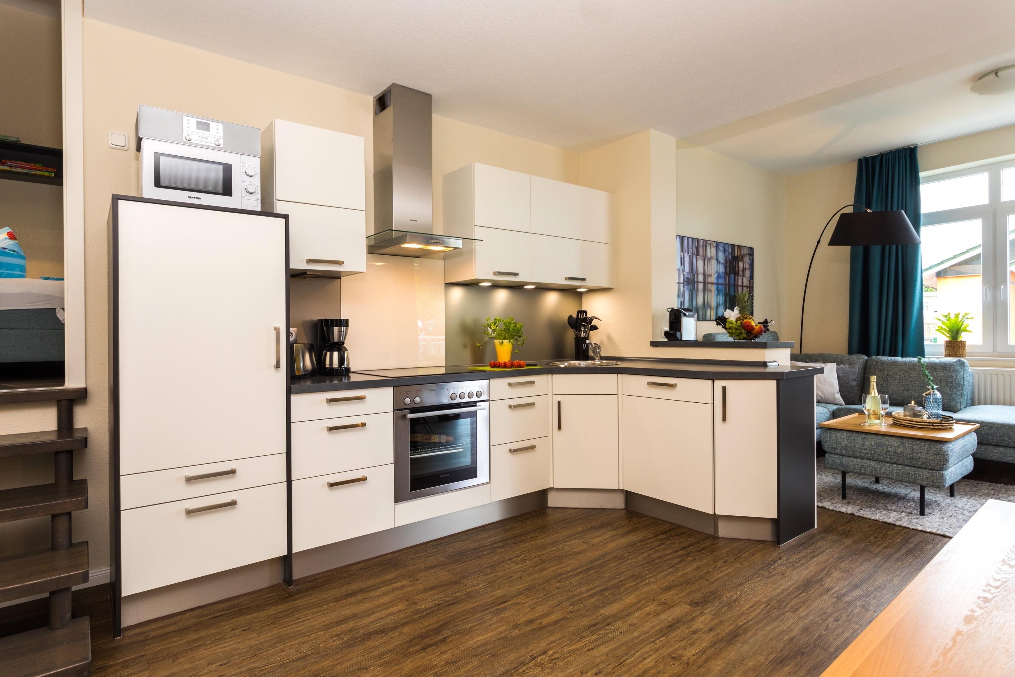 Der Wohnbereich bietet Ihnen ein gemütliches Ecksofa, Smart-TV, einen DVD-Player und ein digitales Radio. Zudem ist Internet über WLAN kostenfrei vorhanden. Die offene Küche ist modern ausgestattet. Ein Küchensofa und bequeme Drehstühle am Esstisch runden jedes Essen ab.