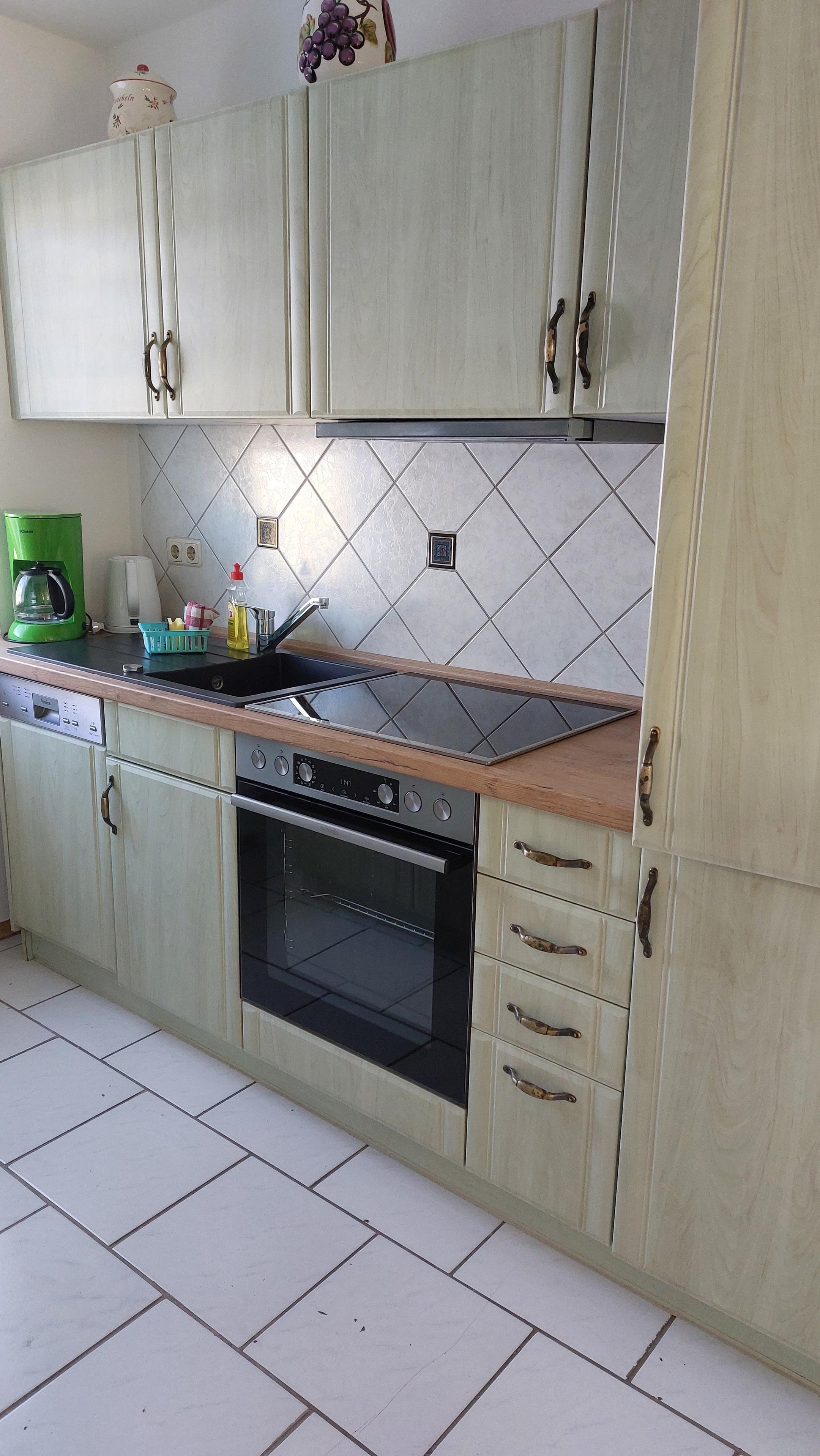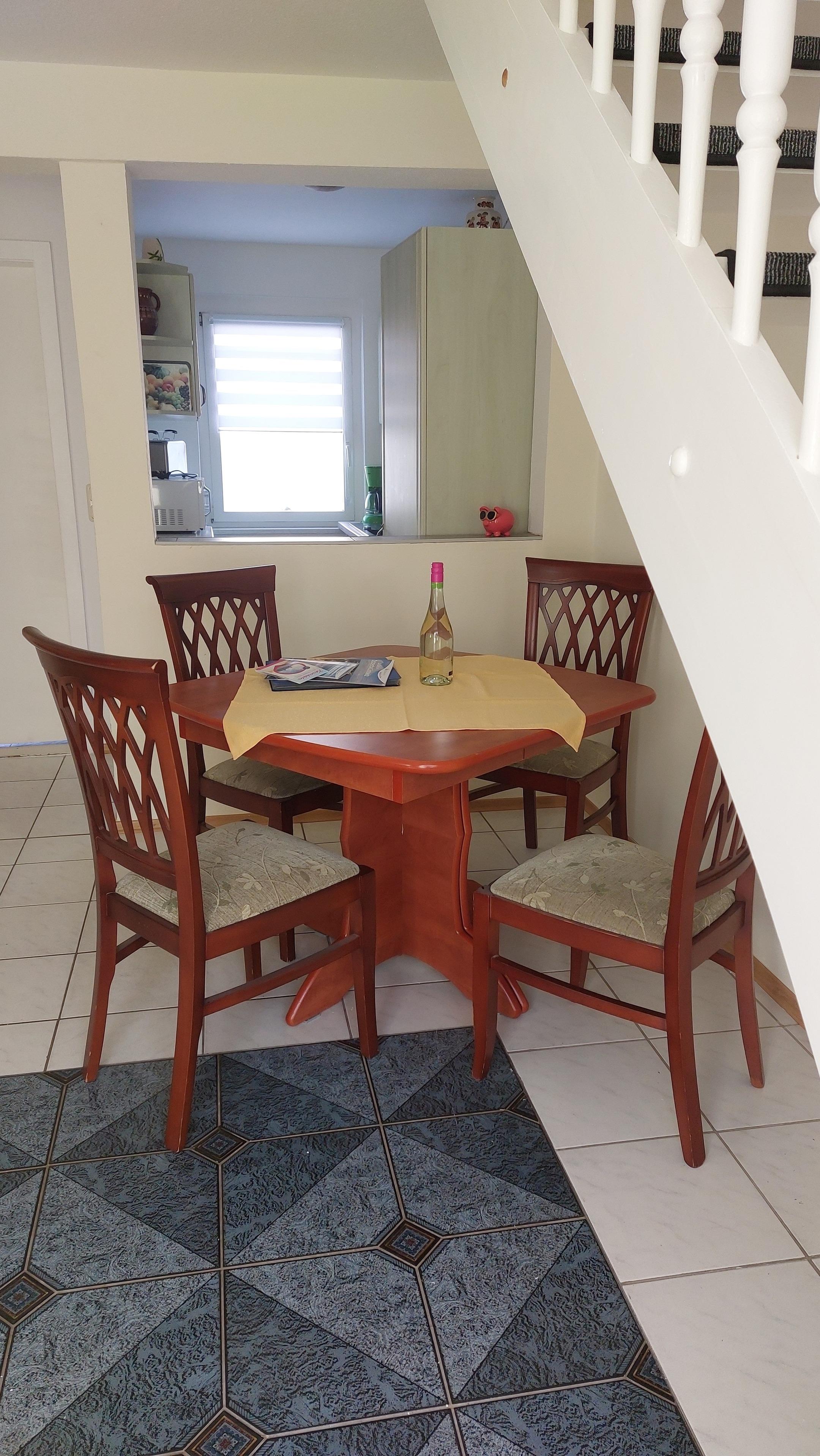 Im Erdgeschoß befindet sich der Wohnraum mit der Sitzecke +TV , der Essbereich und die gut ausgestattete Küchenzeile. Diese verfügt über Herd mit Ceranfeld, Backofen, Dunstabzughaube, Kühl - Gefrierkombination, Geschirrspüler, Wasserkocher, Kaffeemaschine, Toaster und Mikrowelle.