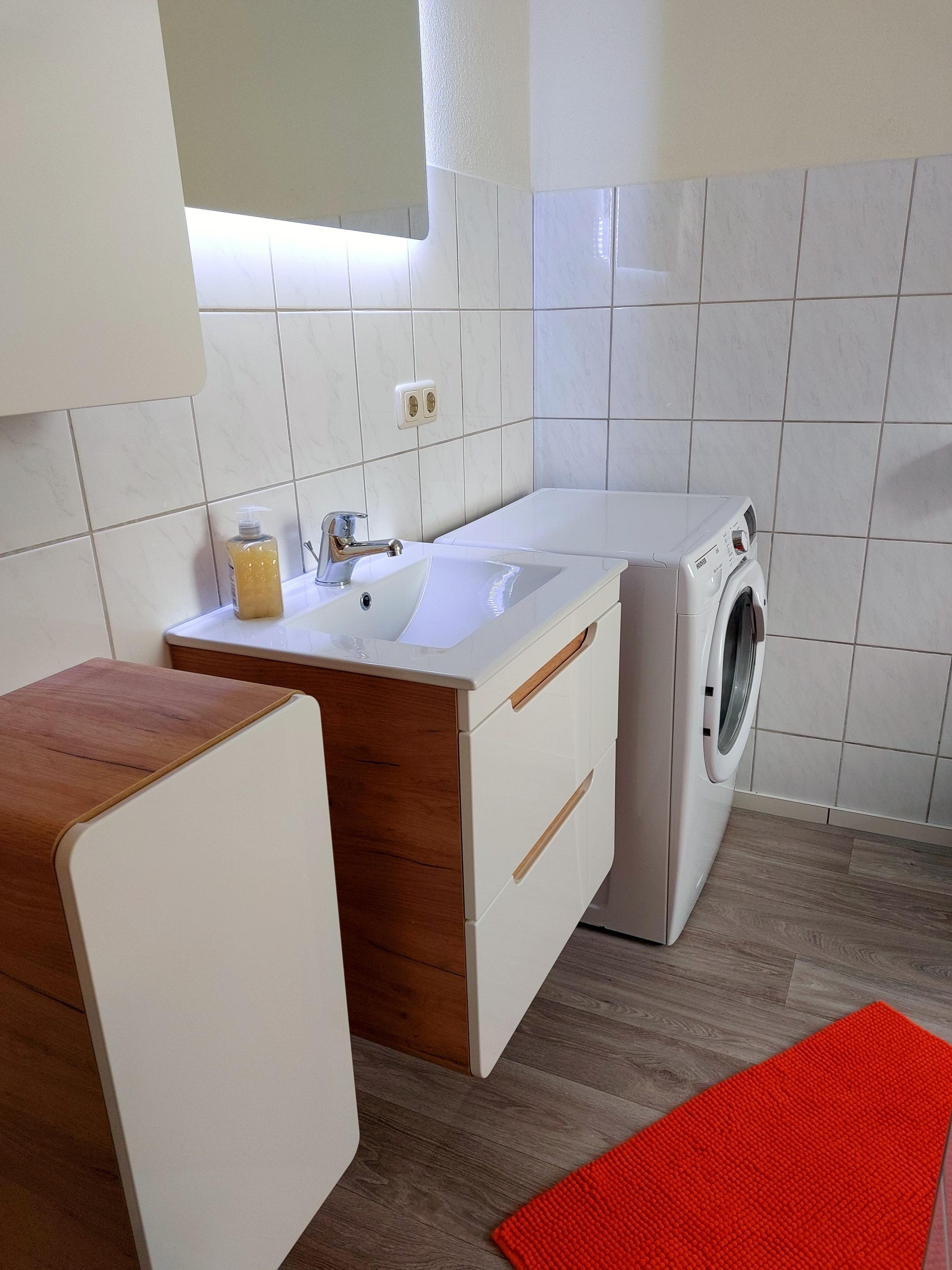 Auserdem gibt es im unteren Bereich der Wohnung das Bad mit Dusche, WC und Waschmaschine.