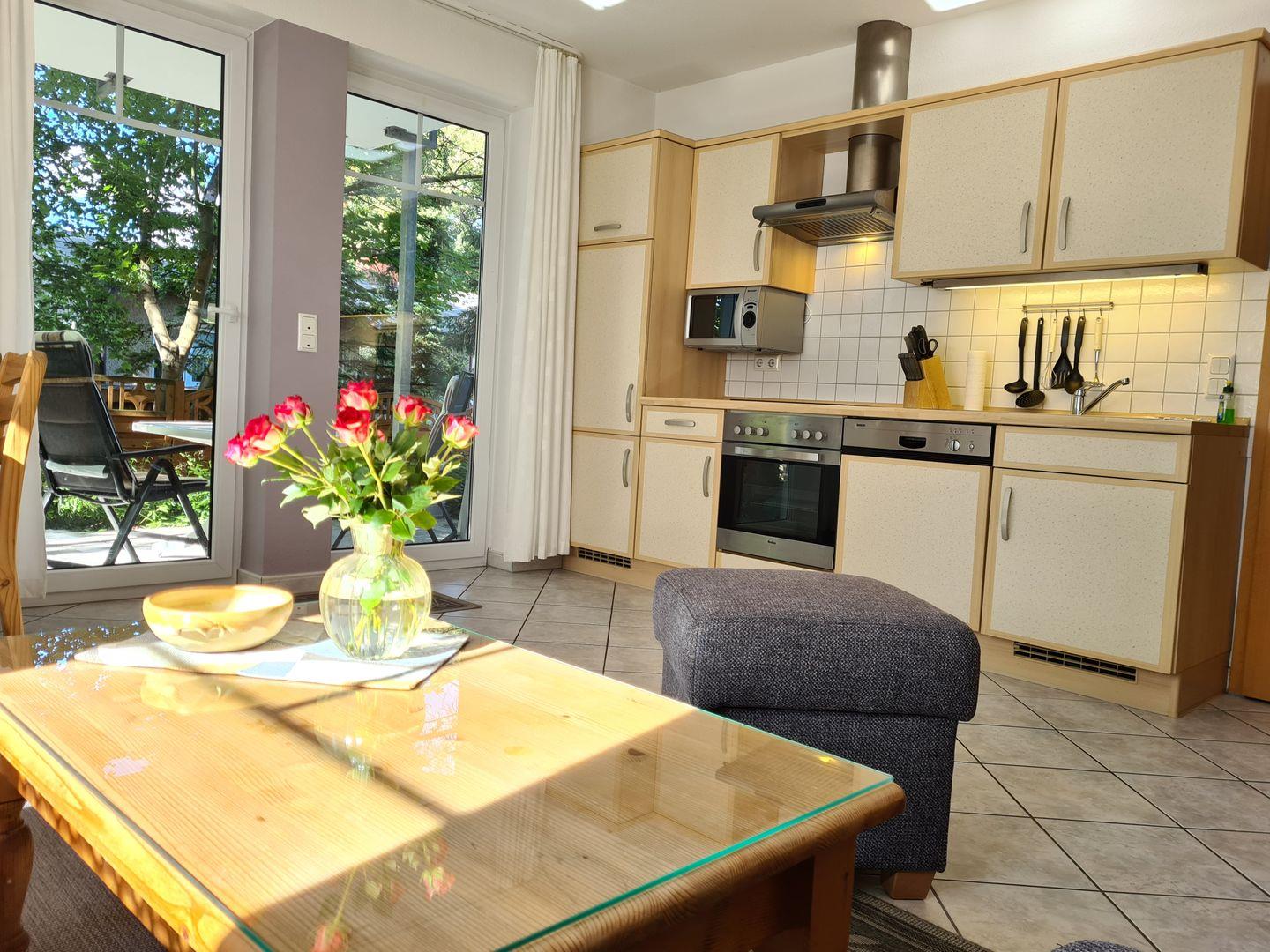 Der einladende Wohnbereich mit einer gut ausgestatteten, offenen Küche bildet das Herzstück der Wohnung. Vom Wohnzimmer aus gelangen Sie auf die überdachte Terrasse, die zum Entspannen und Verweilen einlädt.