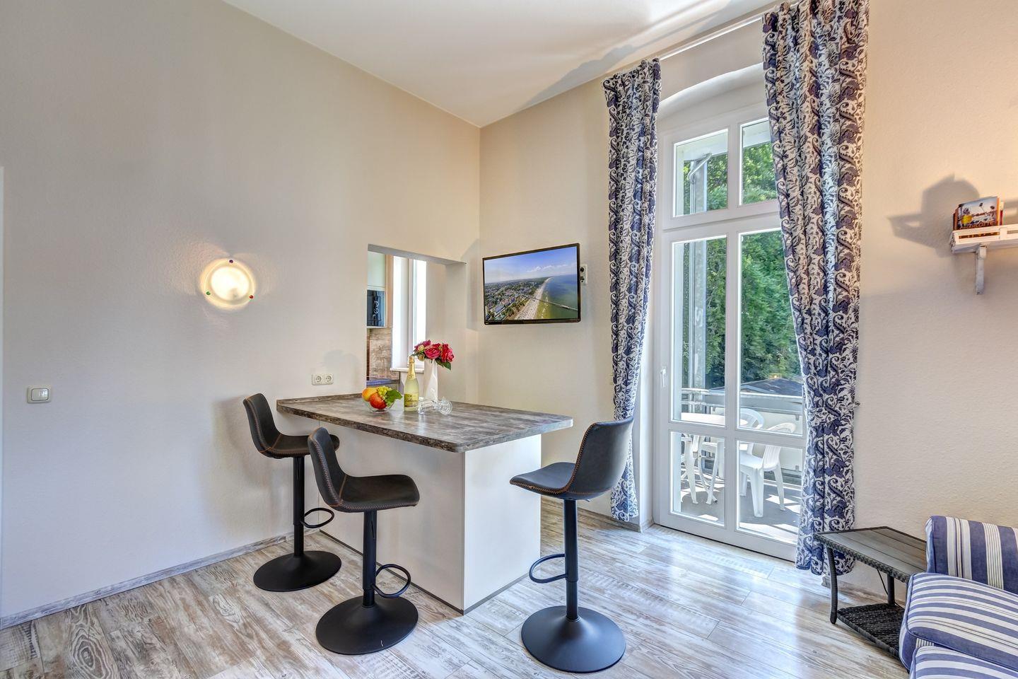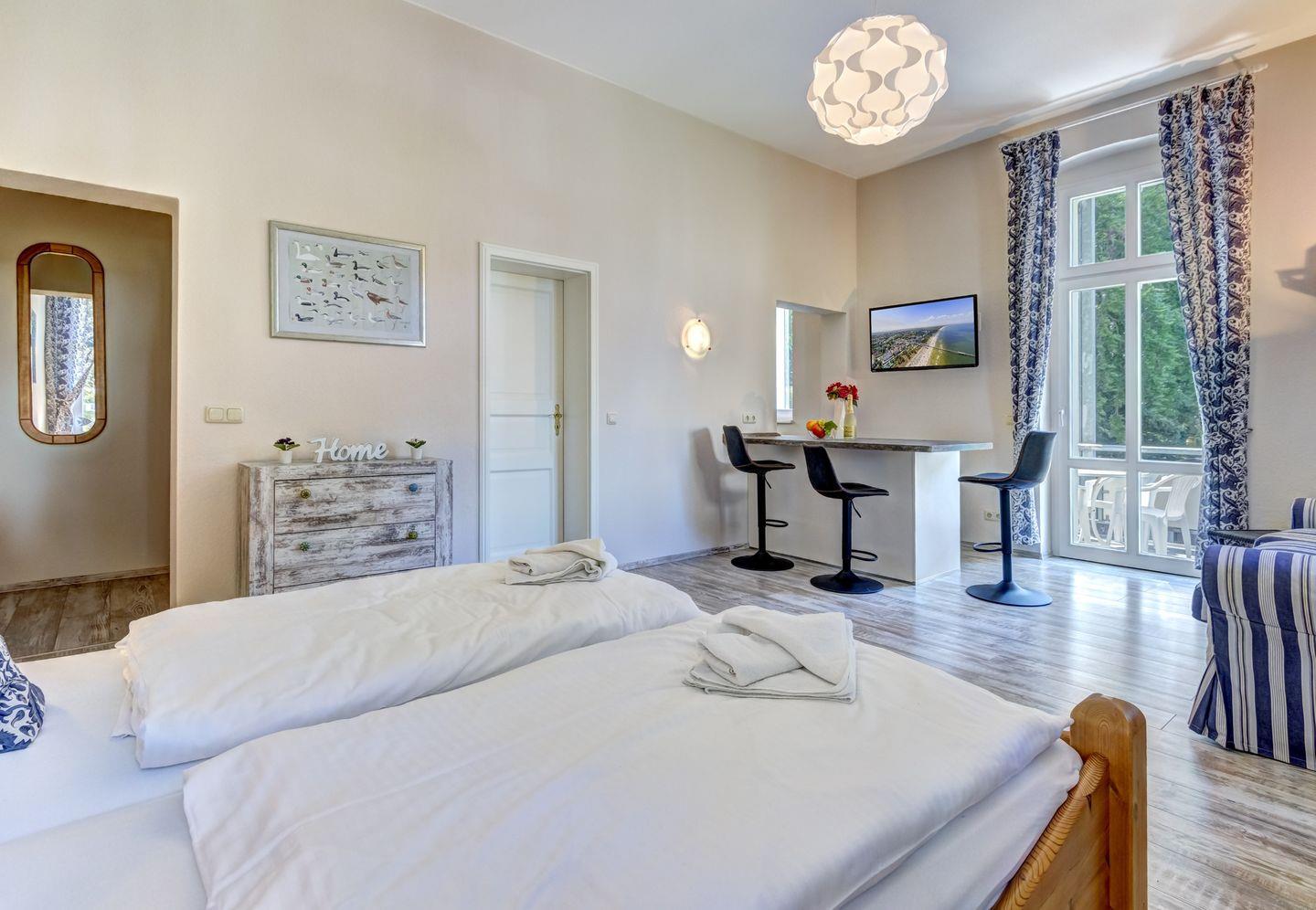 Das gemütliche Appartement „Küstenwald“ bietet einen Südbalkon mit Blick zur Waldseite des Palais.