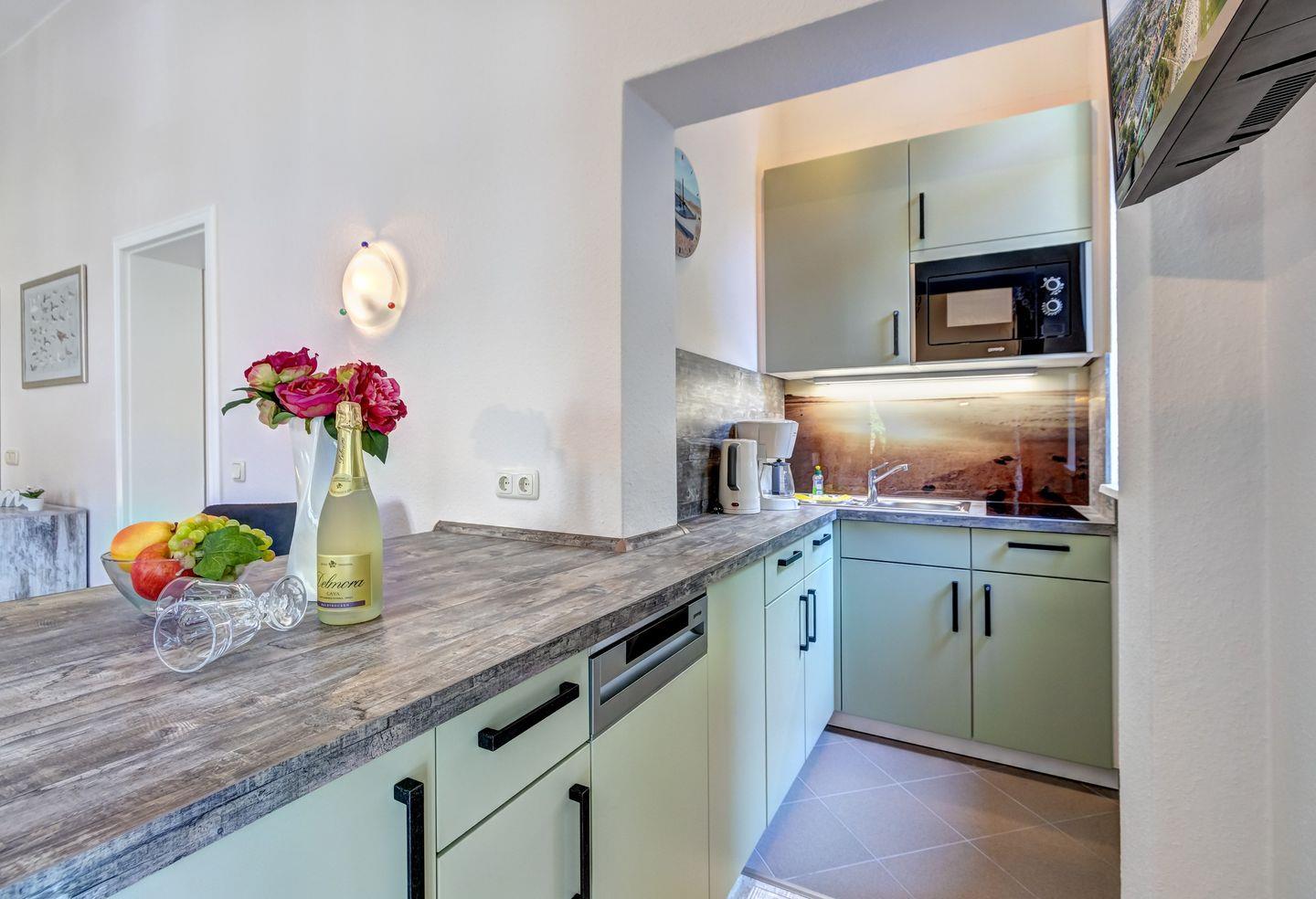 Das gemütliche Appartement „Küstenwald“ bietet ein Doppelbett, eine ausklappbare Doppelcouch, einen Full-HD-TV mit Sat-Empfang und ein Radio mit CD-Player. Es verfügt über ein Bad mit Dusche sowie einen Südbalkon zur Waldseite des Palais. Die gut ausgestattete Küchenzeile bietet Kaffeemaschine, Wasserkocher, Toaster, Kleinkühlschrank und Kochmöglichkeit.