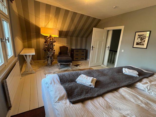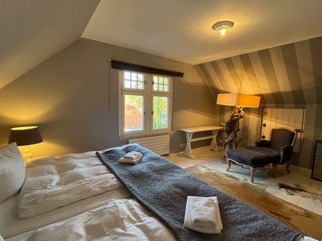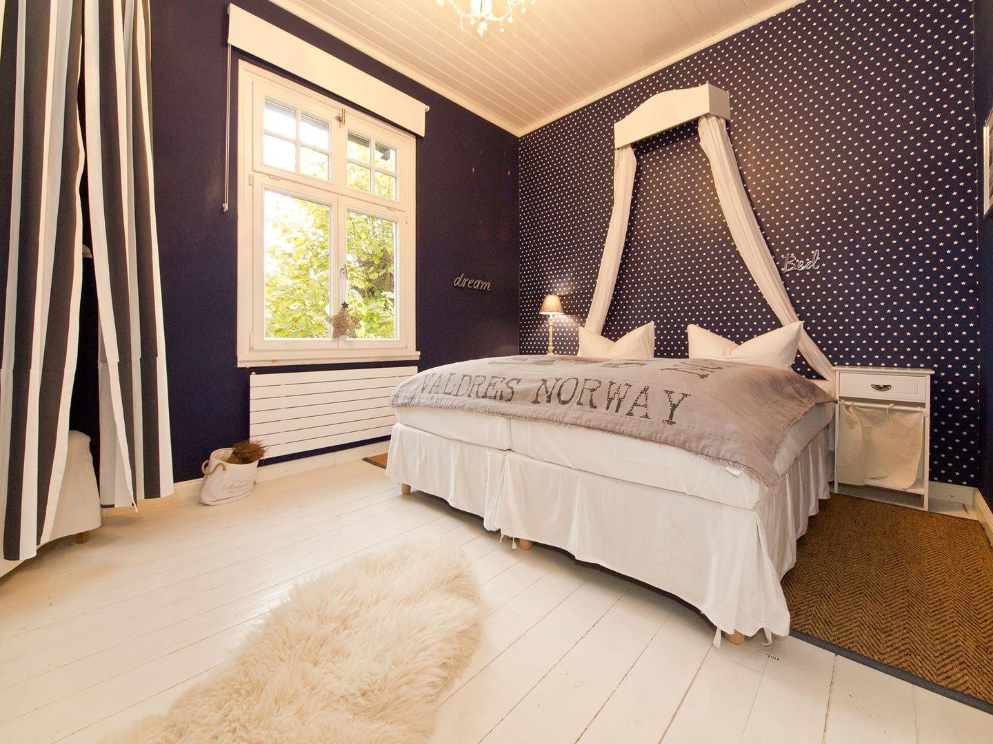 Im Erdgeschoss befindet sich zudem eines von drei Schlafzimmern, ausgestattet mit einem Boxspringdoppelbett (1,80 m x 2,00 m) und einem weiteren Flat-TV.