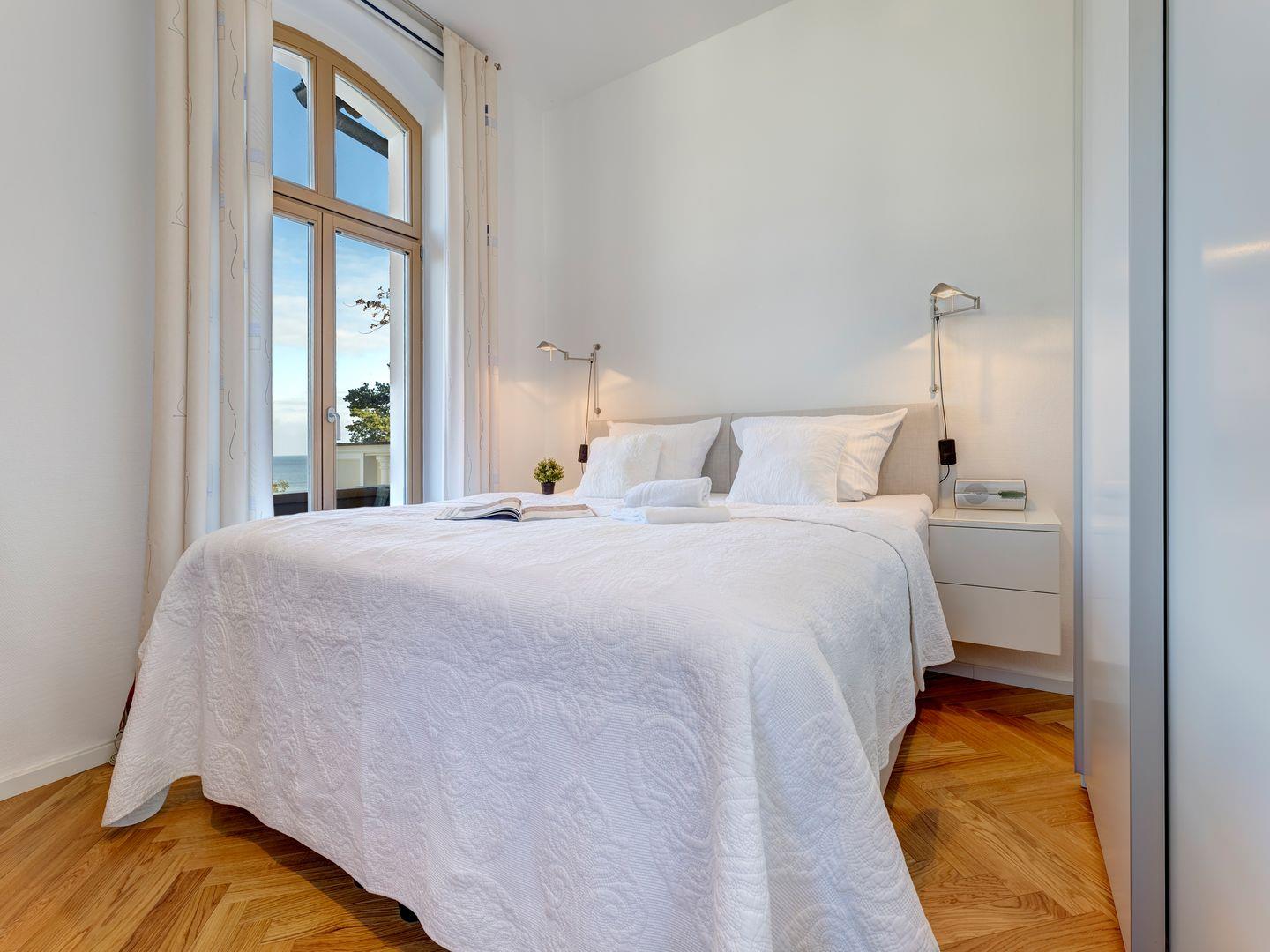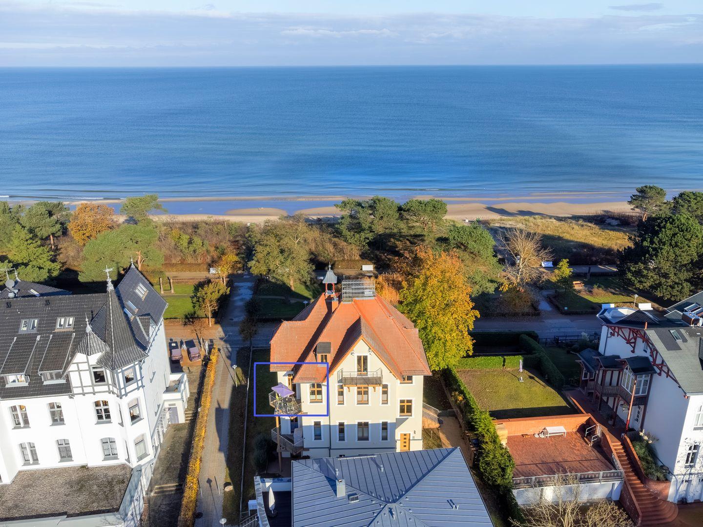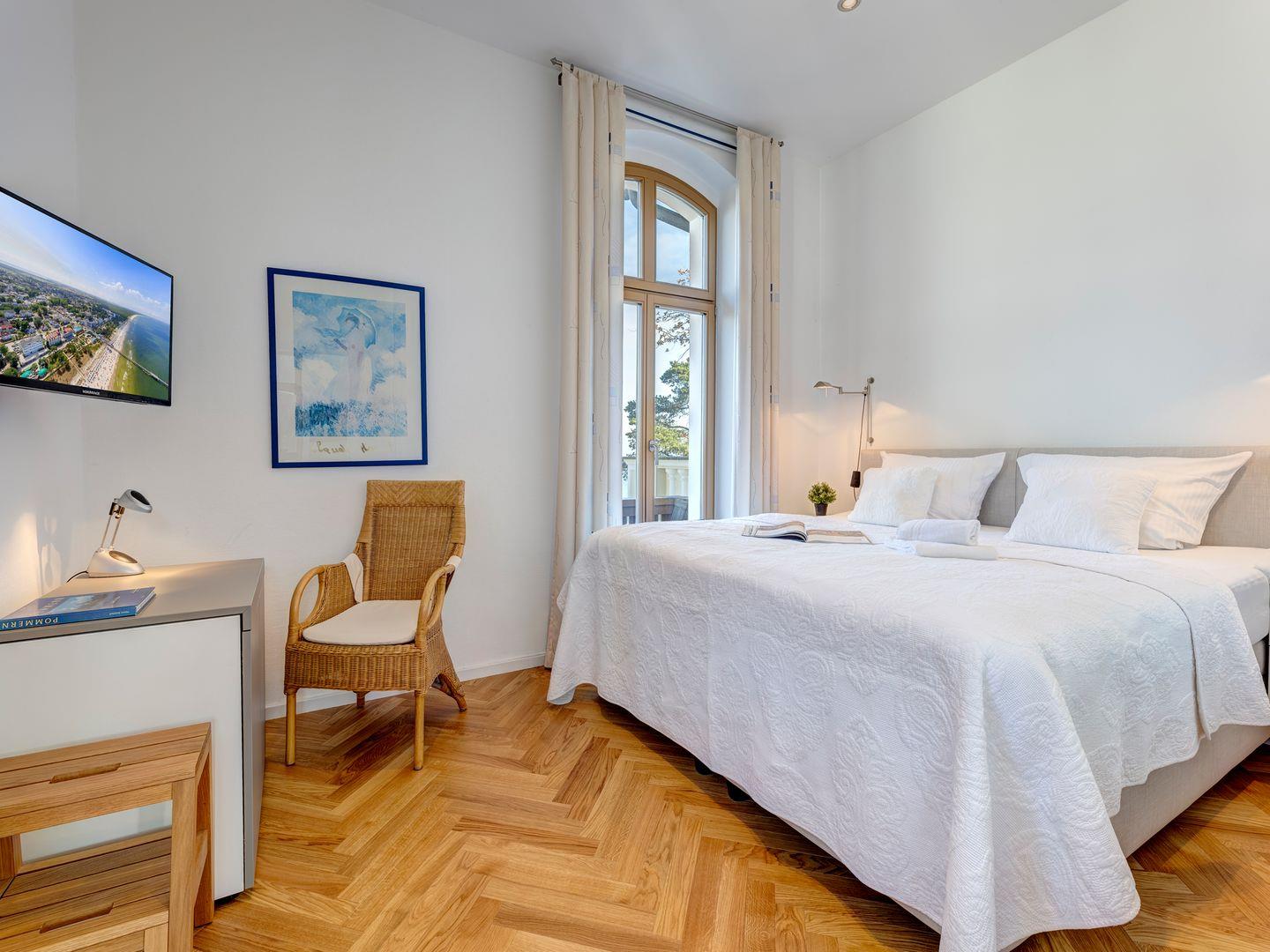 Die lichtdurchflutete Appartementwohnung mit herrlichem Seeblick befindet sich im 1. Obergeschoss der imposanten, denkmalgeschützten Villa „Tusculum“, direkt an der idyllischen Zinnowitzer Strandpromenade.
