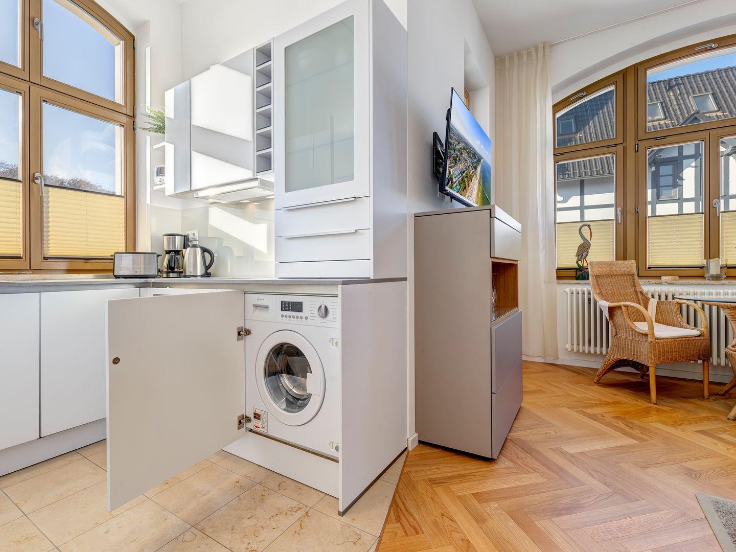 Die moderne Einbauküche sorgt für kulinarische Genüsse.