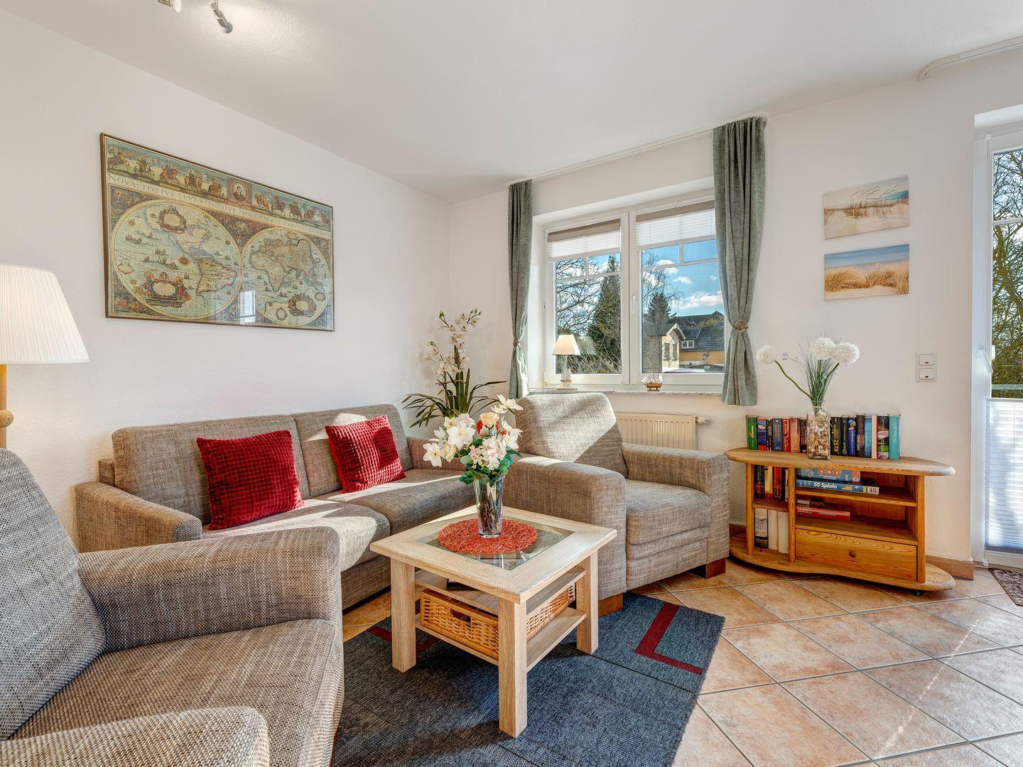 Das Wohnzimmer lädt mit einer bequemen Sitzgruppe zum Verweilen ein. Das Sofa lässt sich zudem ausklappen und bietet eine Schlafmöglichkeit für Ihre Kinder.