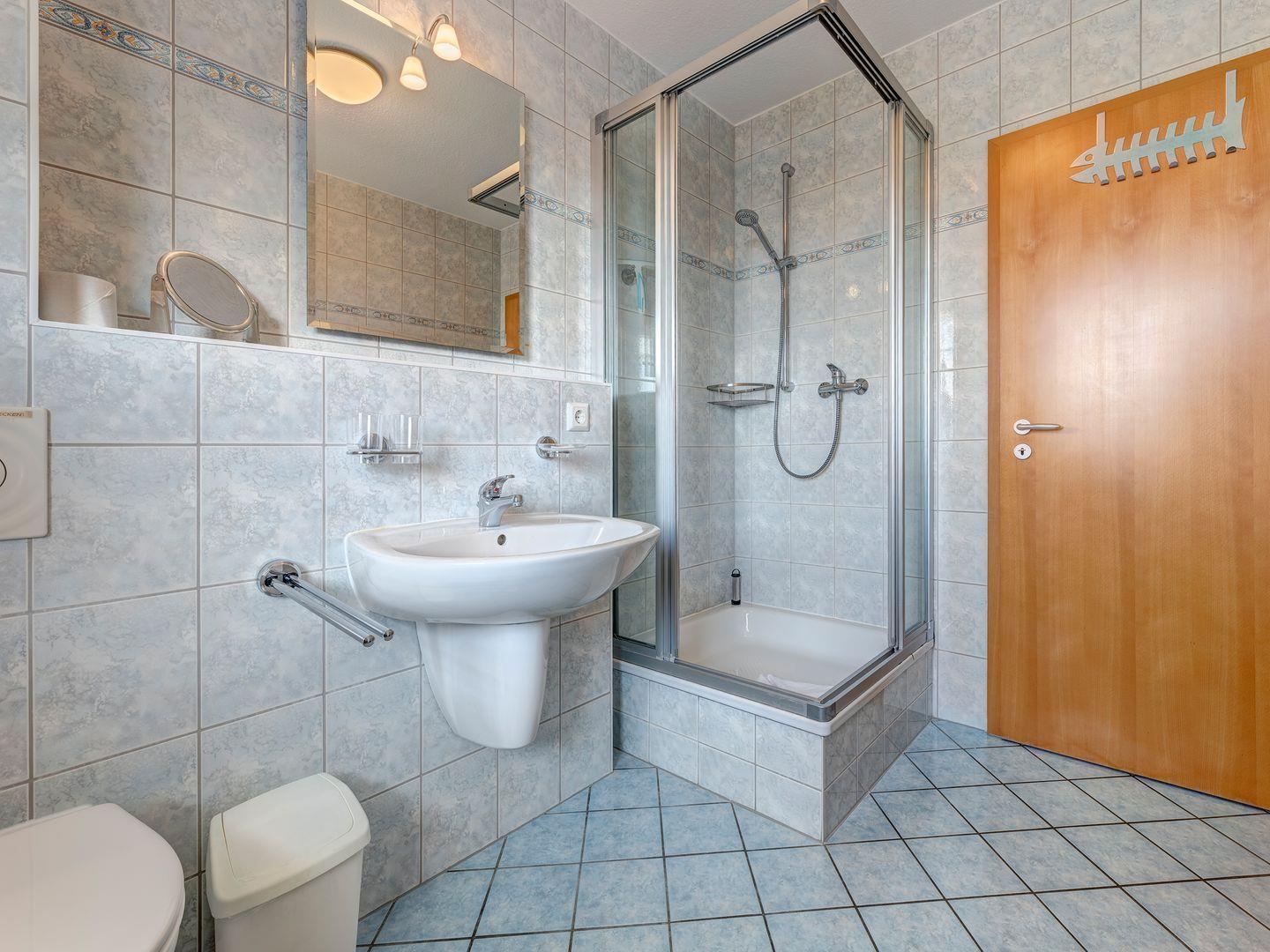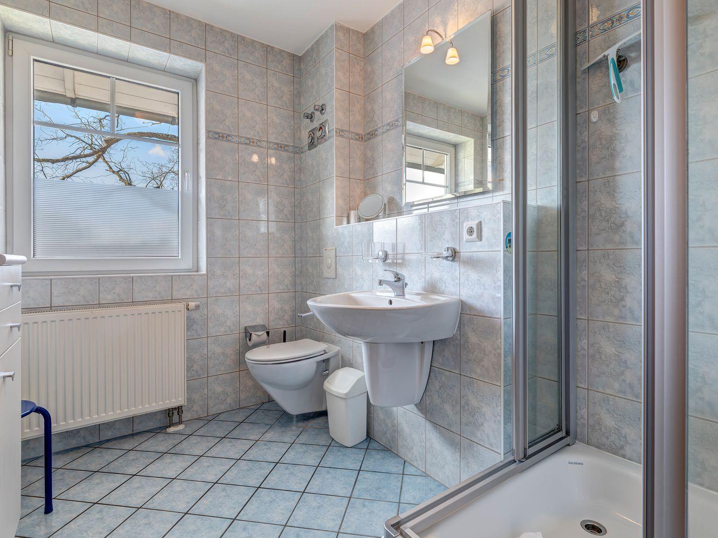 Das großzügige Duschbad verfügt über eine geräumige Dusche, ein Waschbecken und ein WC.