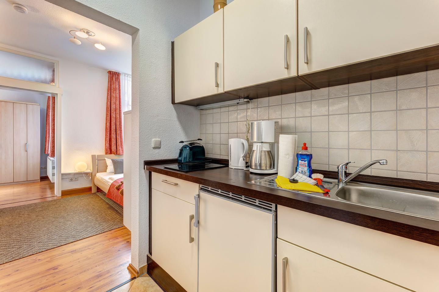 Die Ferienwohnung Stranddistel, Haus Gudrun: Ferienwohnung 2 in Zinnowitz bietet auf 33 m² ein Schlafzimmer, ein offenes Wohnzimmer mit Küche, WLAN und einen eigenen Parkplatz. Die Unterkunft ist Nichtraucher geeignet, kinderfreundlich und mit Laminatböden ausgestattet. Zur Küche gehören u.a. Kaffeemaschine und Toaster.