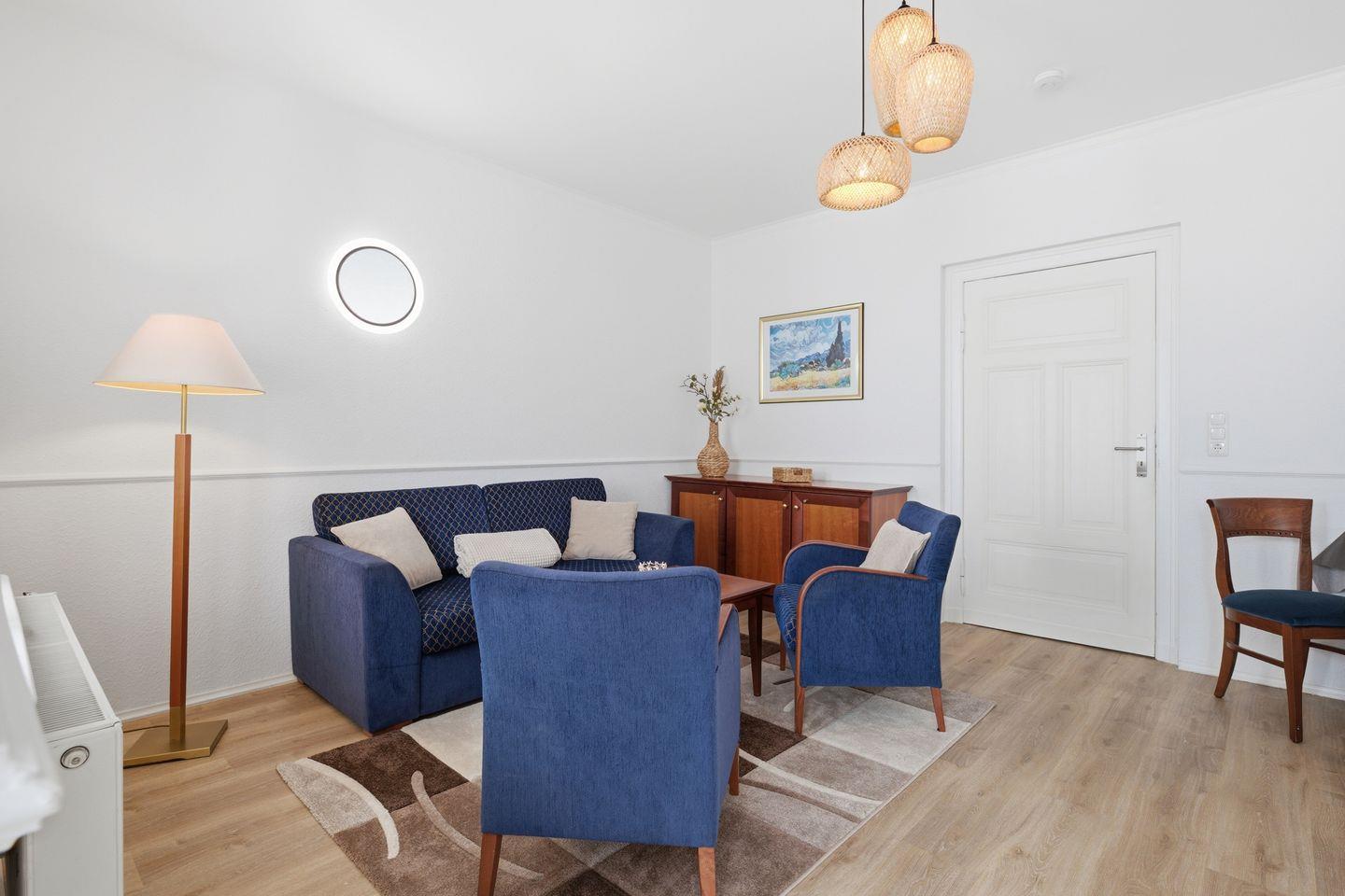 Wohn- und Schlafzimmer sind mit massiven Möbeln ausgestattet, die den Charakter des Hauses unterstreichen und eine warme, behagliche Atmosphäre schaffen. Ein besonderes Highlight ist die lichtdurchflutete Veranda – atmosphärisch wie ein blauer Salon.