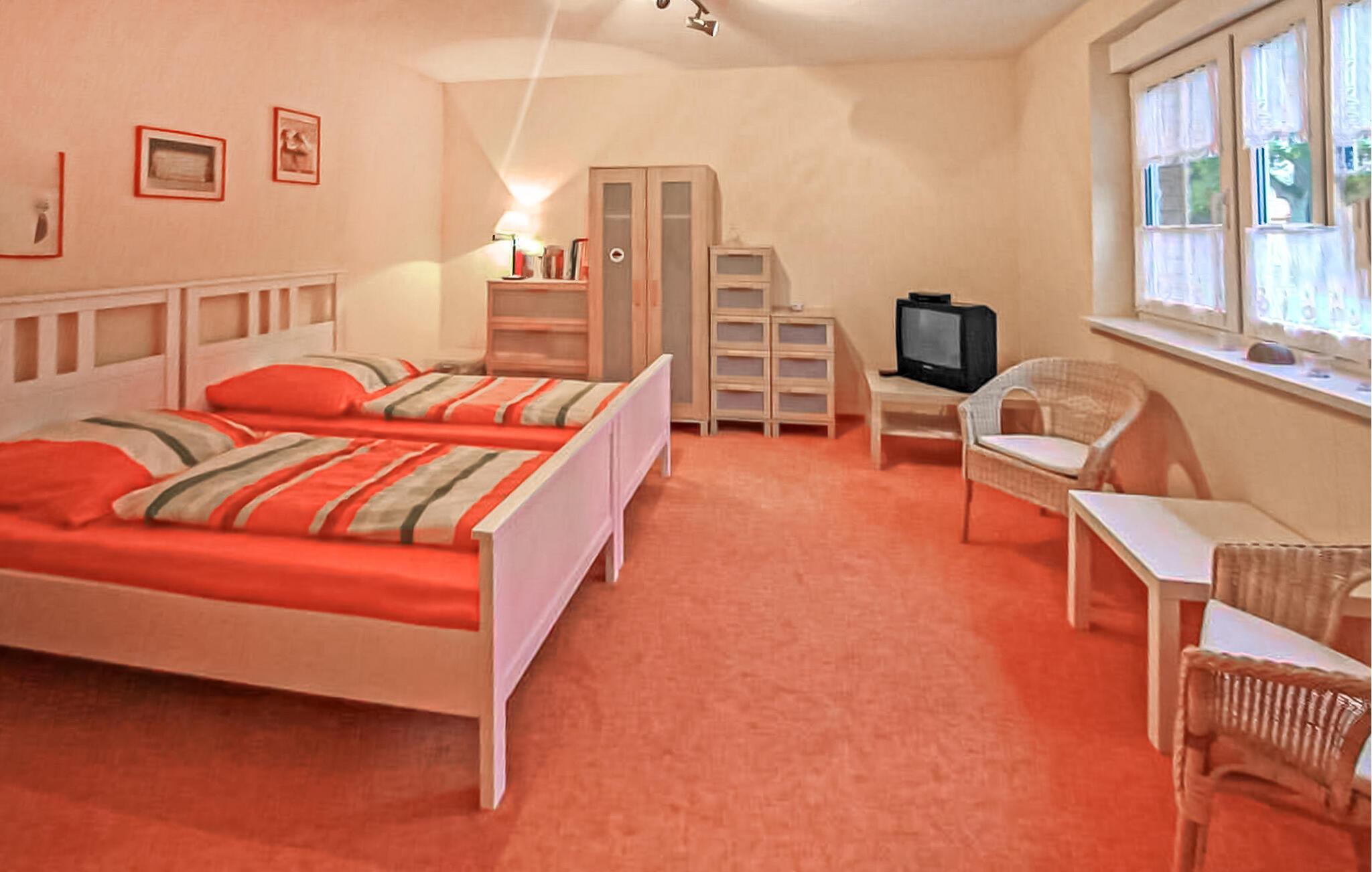 Die großräumige Ferienwohnung mit separatem Zugang erstreckt sich über das gesamte Erdgeschoss eines Wohnhauses auf dem 4000 qm großen Wohngrundstück des Eigentümers. Sie ist ausgestattet mit: Wohnraum (Polstermöbel, TV, Radio, CD/DVD), Schlafraum (Doppelbett), Kinderschlafraum (2 zusammenstellbare Einzelbetten, Kinderbett, Sitzecke, TV, Kinderspielzeug), große Küche (komplett mit E-Herd, Backofen, Kühlschrank mit Tiefkühlteil, Spülmaschine, Mikrowelle, Esstisch, Kinderhochstuhl), DU/WC, Zentralheizung.Zur Verfügung stehen: Möblierte Sitzecke bzw. Terrasse (überdacht), Grill, Sonnenliegen, Kinderspielplatz, Fahrradunterstellmöglichkeit und Parkplatz. Am Rätzsee kann ein Tretboot kostenlos genutzt werden. Im Gesamtpreis enthalten sind Bettwäsche, Handtücher, Wasser- u. Energieverbruch und Endreinigung. Vor Ort zu zahlen: Kurabgabe (April-Oktober).