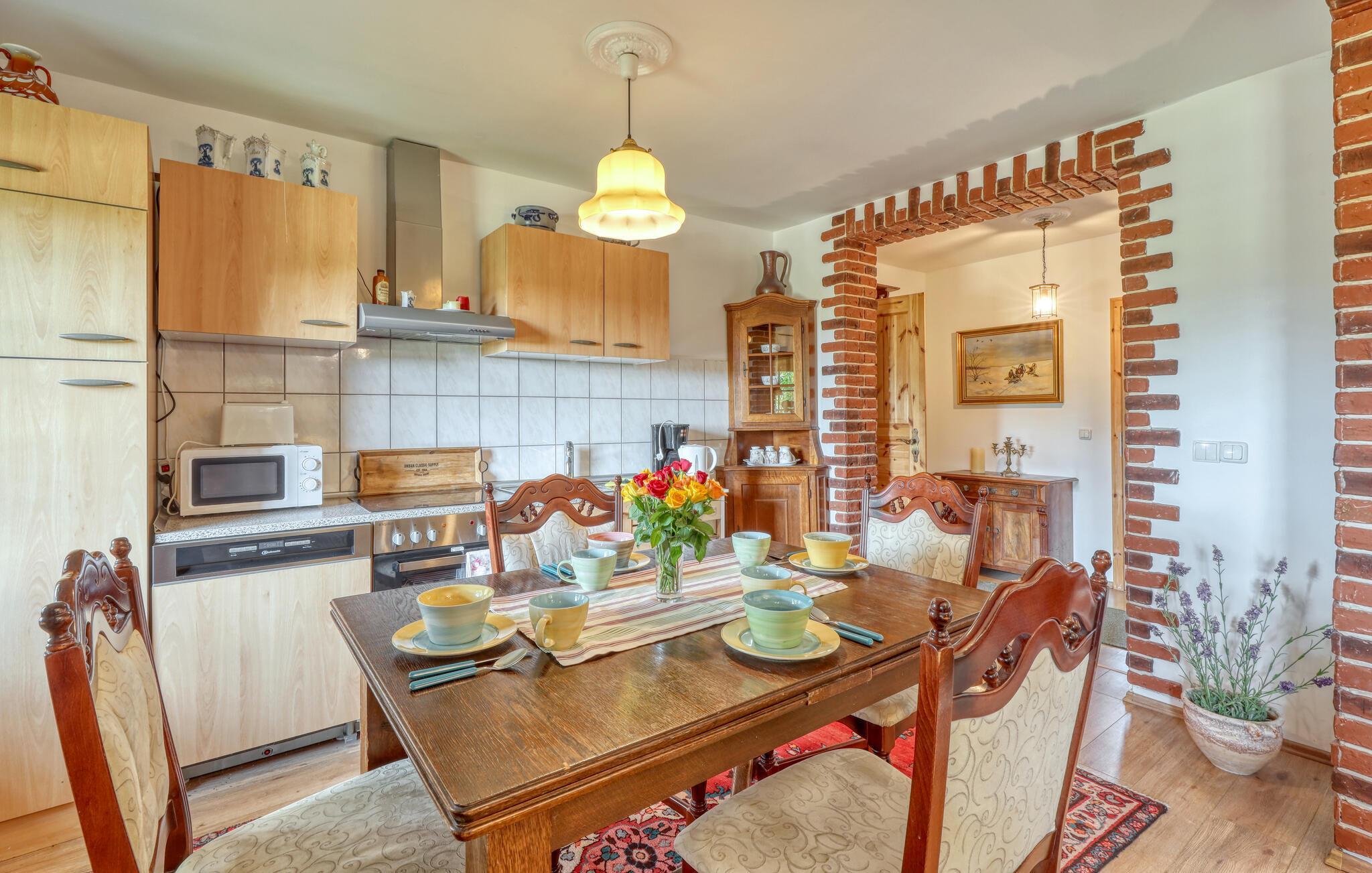 Ihre Unterkunft verbindet Tradition und Behaglichkeit miteinander. Hier erleben Sie entspannte Urlaubstage, an denen Sie die Natur genießen und den Alltag hinter sich lassen können. Machen Sie es sich auf den Sofas im Wohnzimmer bequem und nutzen Sie den Fernseher für einen entspannten Abend. Bewundern Sie die sichtbaren Backsteinbögen, die dem Raum einen rustikalen Charme verleihen, und bereiten Sie Ihre Mahlzeiten in der heimeligen Küche mit Esstisch zu.