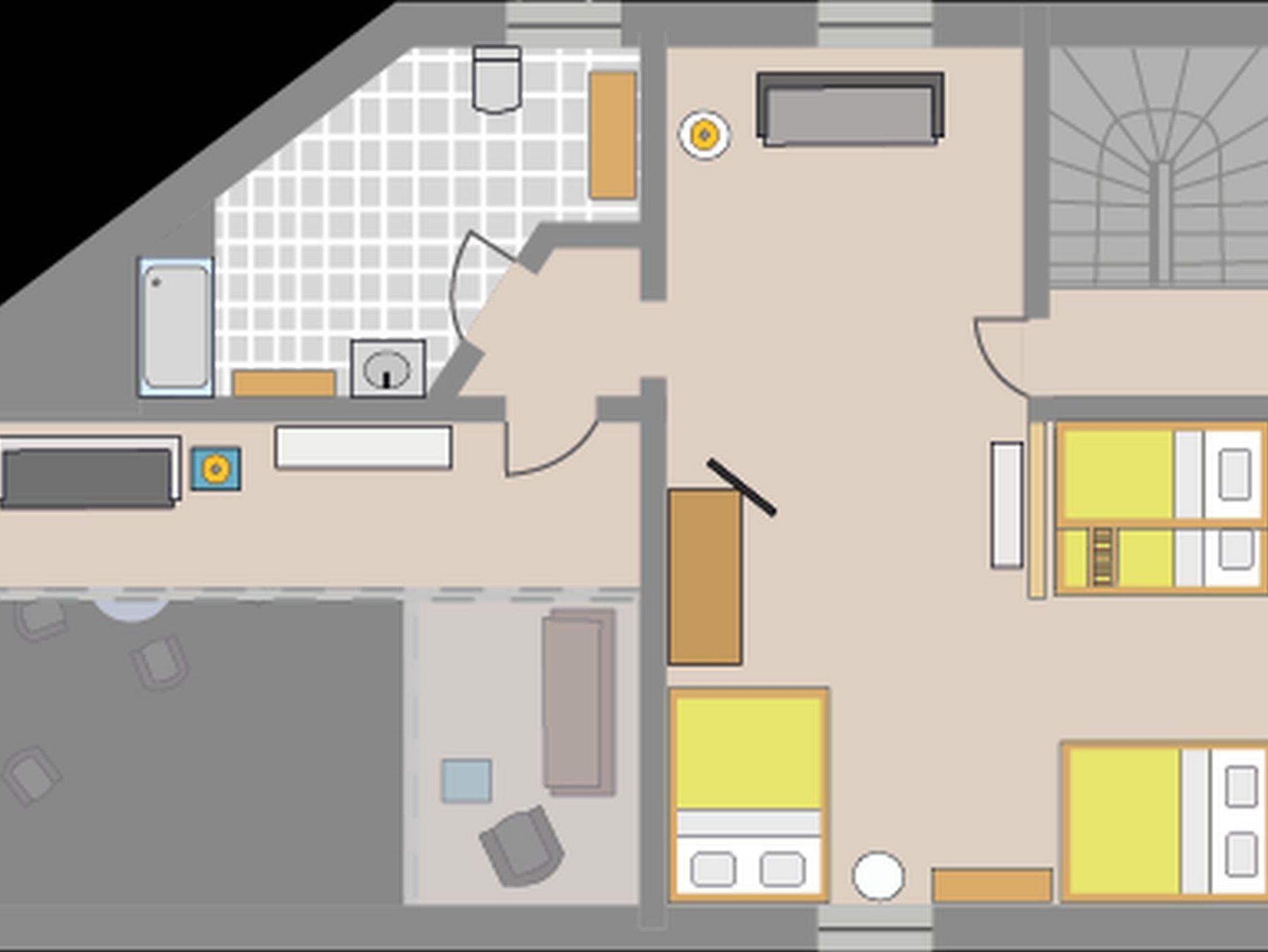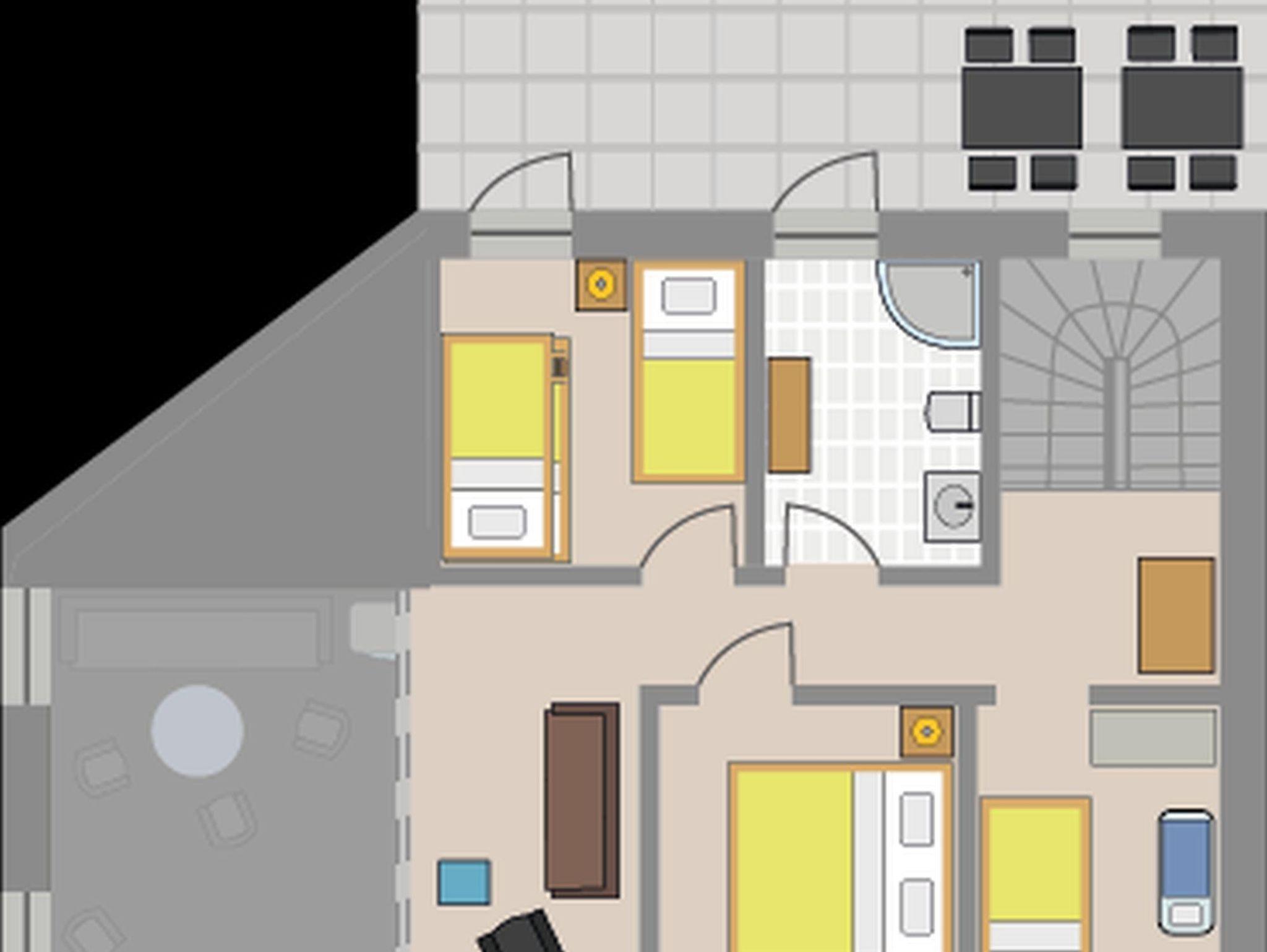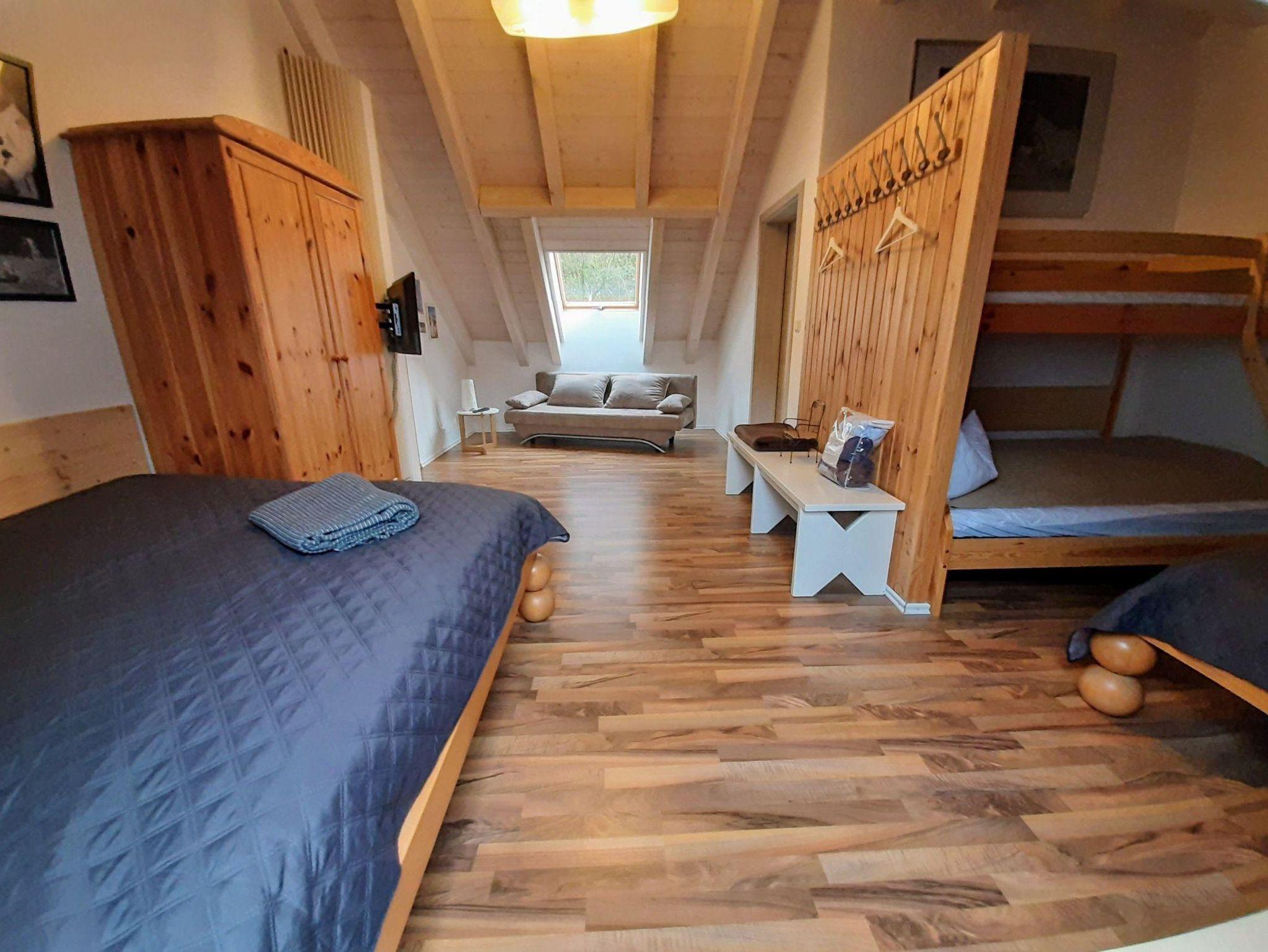 Insgesamt finden in dem Haus 16 Personen Platz, davon maximal 14 Erwachsene. Es gibt zwei Zweibettzimmer, zwei Dreibettzimmer und ein Mehrbettzimmer mit acht Schlafplätzen. Zusätzlich gibt es auf den beiden Emporen noch eine Schlafcouch.