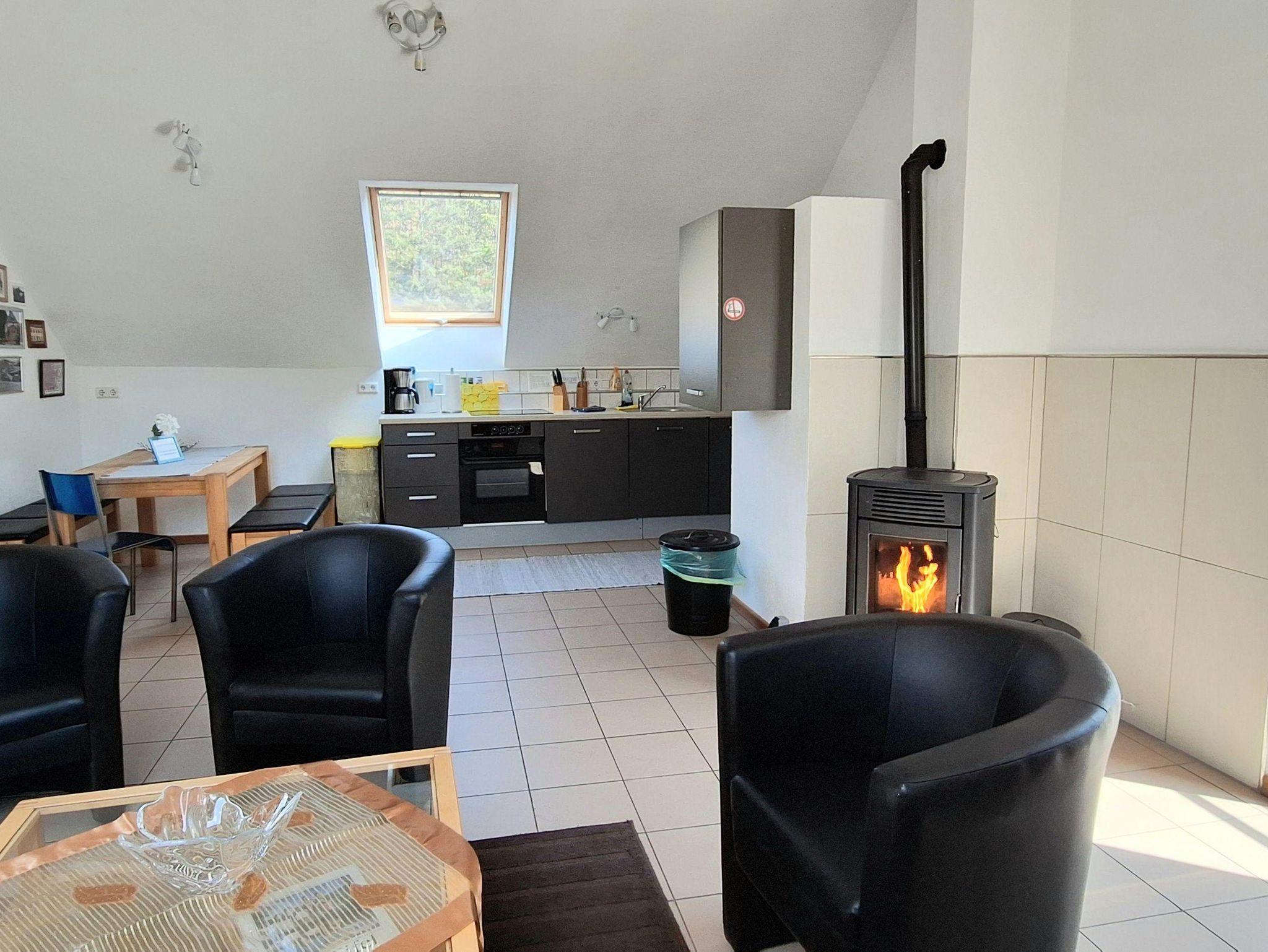 Das Ferienhaus Eifel Landhaus verfügt über eine großzügige separate Küche im Erdgeschoss sowie ein kombiniertes Küchen-, Ess- und Wohnzimmer mit Küchenzeile im Dachgeschoss. Die große Küche im EG ist für bis zu 21 Personen voll ausgestattet, sodass ausreichend Geschirr, Besteck und Töpfe vorhanden sind. Der zweite Küchenbereich ist für bis zu zehn Personen ausgestattet.Der große Gemeinschafts- und Essraum im Erdgeschoss bietet Platz für insgesamt über 22 Personen an zwei Tischen. Eine markante, mächtige Bruchsteinwand schafft eine besonders angenehme und behagliche Atmosphäre, die mit der indirekten Beleuchtung besonders gut zur Geltung kommt. Ein großzügiger Esstisch bietet Platz für 14 Gäste. Ein weiterer kleinerer Tisch bietet nochmals Platz für acht Gäste.