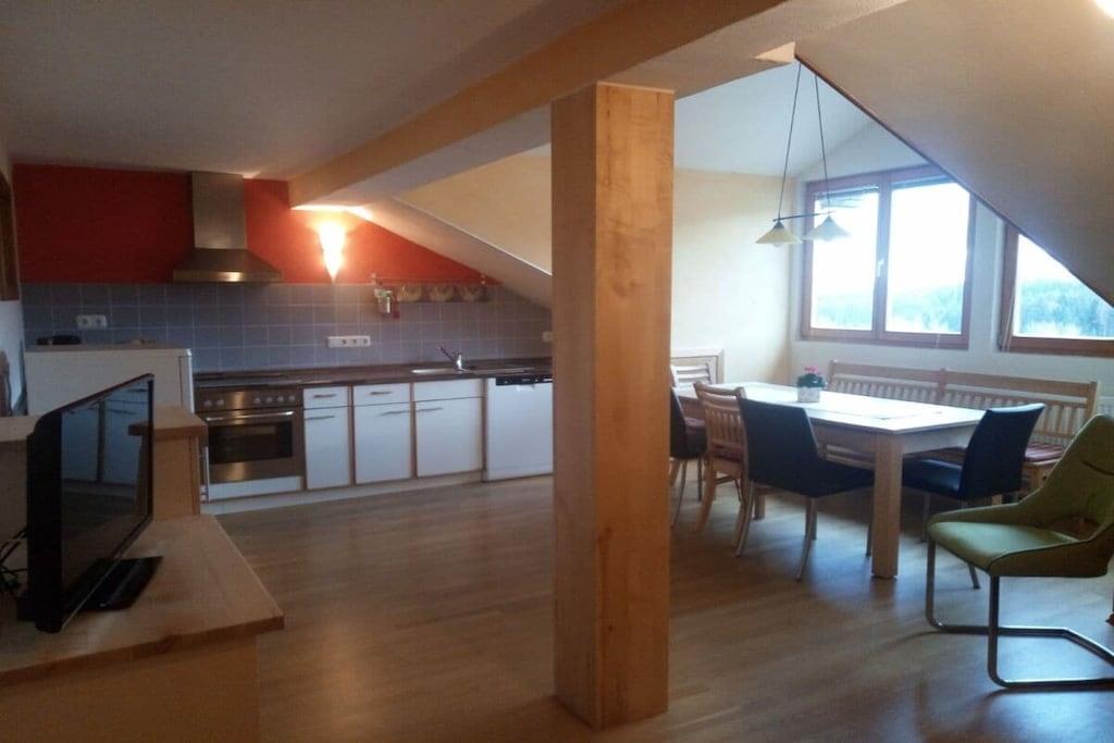 Our cozy 4-room holiday apartment is furnished with custom-made furniture and features hardwood floors. The eat-in kitchen includes a fully equipped kitchen and a dining table with seating for up to 8 people. A high chair is available. The apartment also includes a small summer kitchen with a washing machine, a covered terrace, and access to the garden with a barbecue area and playground equipment. The apartment is also available as a smaller version with 2 bedrooms and 1 bathroom. Please inquire about our rates. We are a partner of the Bavarian Active Card program – over 50 benefits are included with your guest card – free access to swimming pools in the region, the Bavarian Forest sauna in Zwiesel, the treetop walkway, various museums, and events – AND free travel on buses and trains!