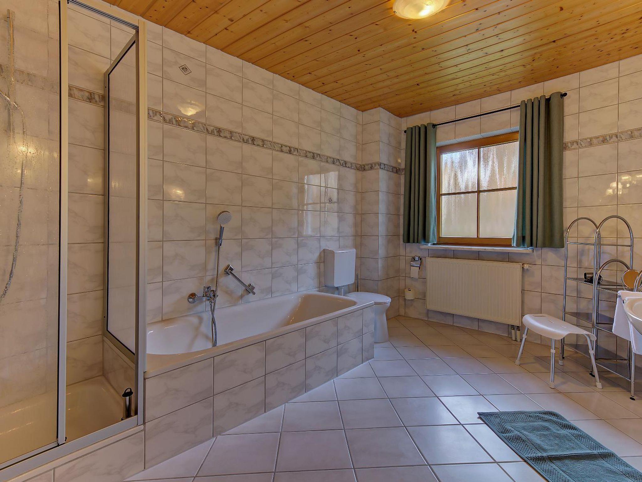Unsere extra große 120m² große Ferienwohnung für viel Platz für bis zu 8 Personen. Sehr gemütlich eingerichtet, hell und sonnig Stockwerk 1. Etage mit Südbalkon ( Tisch und Stühle, Balkonliegen, Wäscheständer und Weber Elektrogrill) und Traumblick auf Wald und Wiesen. Großzügige Wohnküche mit Couch, sehr großer Holz-Esstisch mit viel Platz zum Zusammensitzen, großen Flachbild-SAT-TV, Radio, WLAN, sehr gut ausgestattete Küchenzeile mit Geschirrspüler, Kühlschrank mit Gefrierfach, Herd und Backofen, Wasserkocher, Toaster, Kaffeemaschine, Dolce Gusto Kaffeemaschine, Kaffeevollautomat.... und genügend Geschirr. Bettwäsche, Handtücher und Geschirrtücher sind inklusive. Vier separate Schlafzimmer mit Doppelbetten. Ein Schlafzimmer mit zusätzlichen Flachbild-SAT-TV zum Fernsehschauen vom Bett aus. Ein weiteres Schlafzimmer mit Safe, eigener Dusche, WC, kleiner Couch und Flachbild-SAT-TV. Zustellbett, oder Babyreisebett mit bezogenen Bettzeug, einen Hochstuhl oder einen Rausfallschutz stellen wir Ihnen auf Wunsch gerne zur Verfügung. Ein großes Bad mit Dusche, WC, Badewanne und zwei Waschbecken, Handtücher, Fön, und selbstverständlich Parkplätze direkt am Haus. Abstellmöglichkeit für Fahrräder und Ski. Sie möchten gut gestärkt in den Tag starten? Dann buchen Sie unsere liebevollen und reichhaltigen Frühstückskörbe oder Sie lassen sich verwöhnen und gehen zum Frühstücken in unsere nahe gelegenen Pension. Alternative können Sie auch unseren Semmel-Service nutzen. Ihre Kinder finden bestimmt eine Menge Spaß in unserer Spielscheune mit Kinderspielparadies! In unserem Erholungsraum mit Infrarotwärmekabine und der Whirlpool-Badewanne, mit genügend Platz für zwei Personen können Sie den Tag ausklingen lassen. Nach Eintrag in die Belegungsliste, steht Ihnen der Wellnessbereich ca. 2 Stunden exklusive gegen ein kleine Gebühr zur Verfügung. Bitte beachten Sie das Onlinebuchungen Gebühren enthalten.