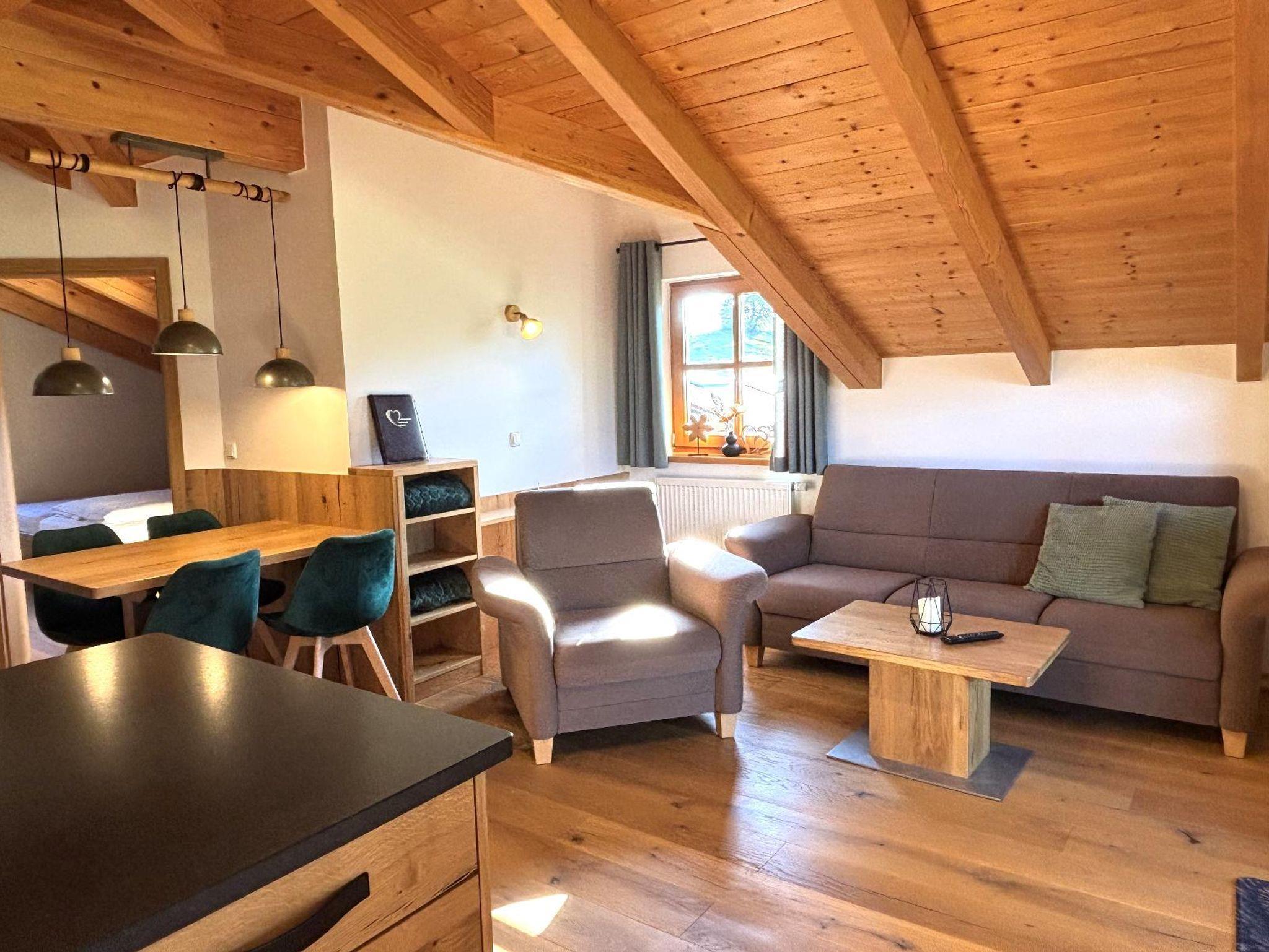 Geschmackvoll eingerichtete Zweiraumwohnung für 2-3 Personen ca. 42 m² groß. Stockwerk 1. Etage mit Südbalkon (Tisch, Stühle, Balkonliegen, Wäscheständer und Weber Elektrogrill) und Traumblick auf Wald und Wiesen. Getrennter Wohn- und Schlafraum, Schlafzimmer mit Doppelbett, Safe, Dusche, WC, Handtücher und Fön. Ein Zustellbett, Babyreisebett mit bezogenen Bettzeug, einen Hochstuhl oder einen Rausfallschutz stellen wir Ihnen auf Wunsch gerne zur Verfügung. Bettwäsche, Handtücher und Geschirrtücher sind inklusive. Wohnküche mit gemütlicher Couch, großem Flachbild-SAT-TV, Internetradio, WLAN, Esstisch, sehr gut ausgestattete Küchenzeile mit Geschirrspüler, Herd mit 4 Kochplatten und Backofen, Kühlschrank mit Gefrierfach, Kaffeevollautomat oder Filterkaffeemaschine, Wasserkocher, Toaster...., und zweiten Bad mit Dusche, WC und selbstverständlich einen Parkplatz direkt am Haus. Abstellmöglichkeit für Fahrräder und Ski. Sie möchten gut gestärkt in den Tag starten? Dann buchen Sie unsere liebevollen und reichhaltigen Frühstückskörbe oder Sie lassen sich verwöhnen und gehen zum Frühstücken in unsere nahe gelegenen Pension. Alternative können Sie auch unseren Semmel-Service nutzen. In unserem Erholungsraum mit Infrarotwärmekabine und der Whirlpool-Badewanne, mit genügend Platz für zwei Personen können Sie den Tag ausklingen lassen. Nach Eintrag in die Belegungsliste, steht Ihnen der Wellnessbereich ca. 2 Stunden exklusive gegen ein kleine Gebühr zur Verfügung. Bitte beachten Sie das Onlinebuchungen Gebühren enthalten.