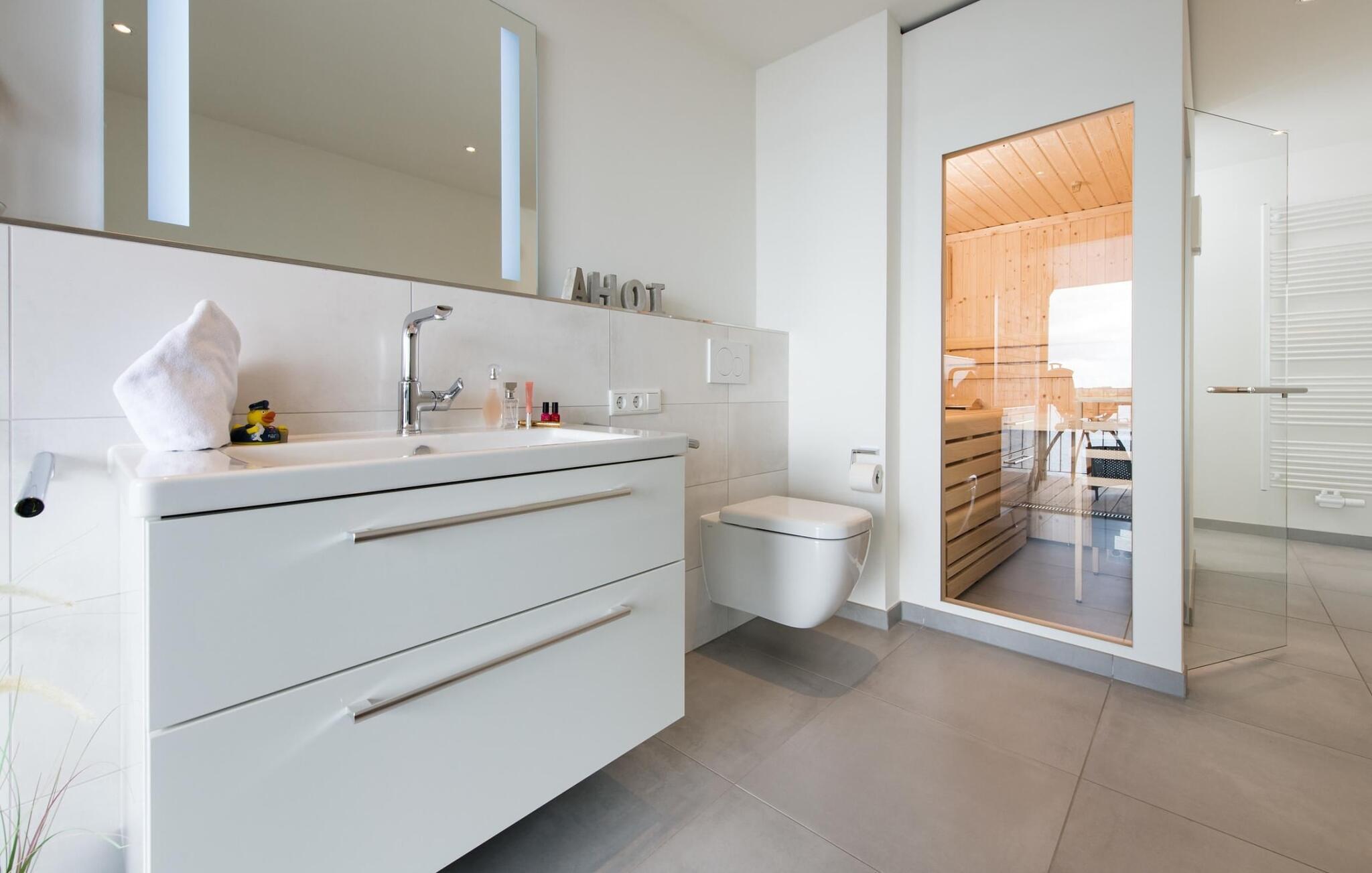 Das Badezimmer mit bodengleicher Dusche sorgt für maritime Wellnessmomente, aus der Sauna lässt sich der wunderschöne Wasserblick genießen. Auch das Badezimmer bietet Zugang zur großen Terrasse.